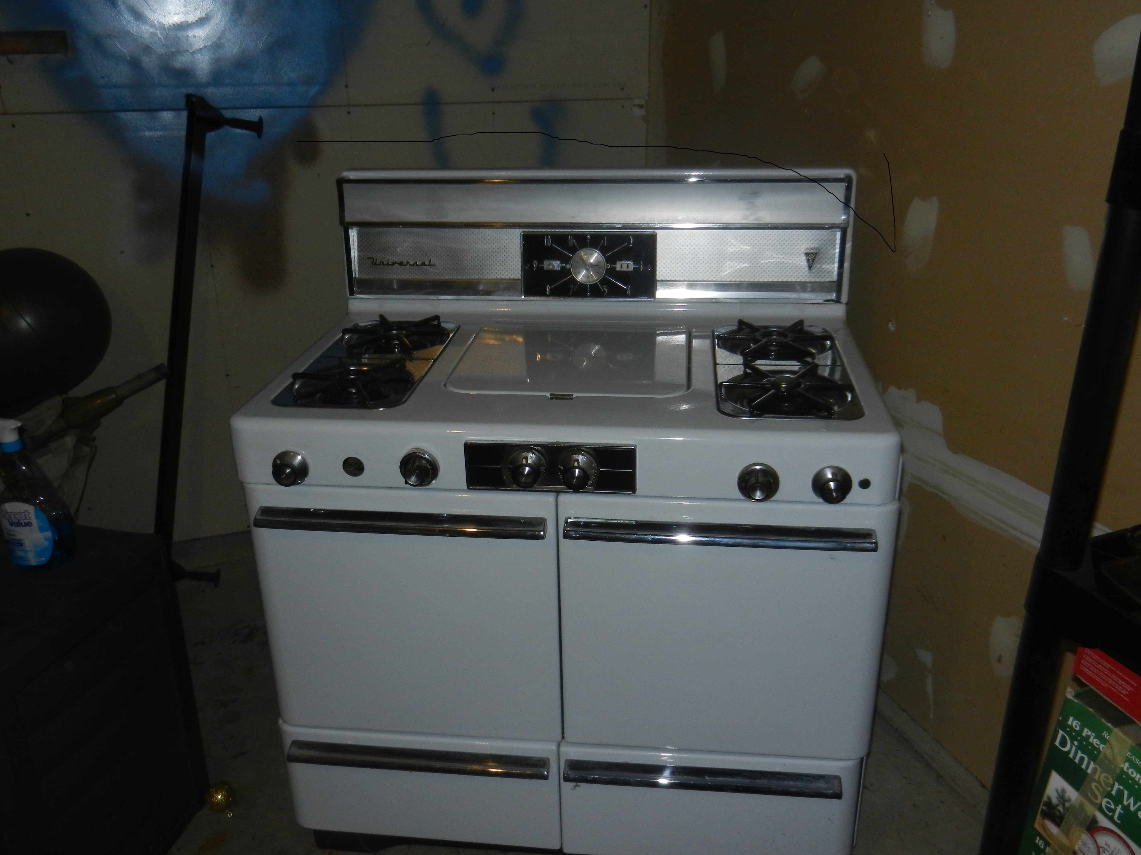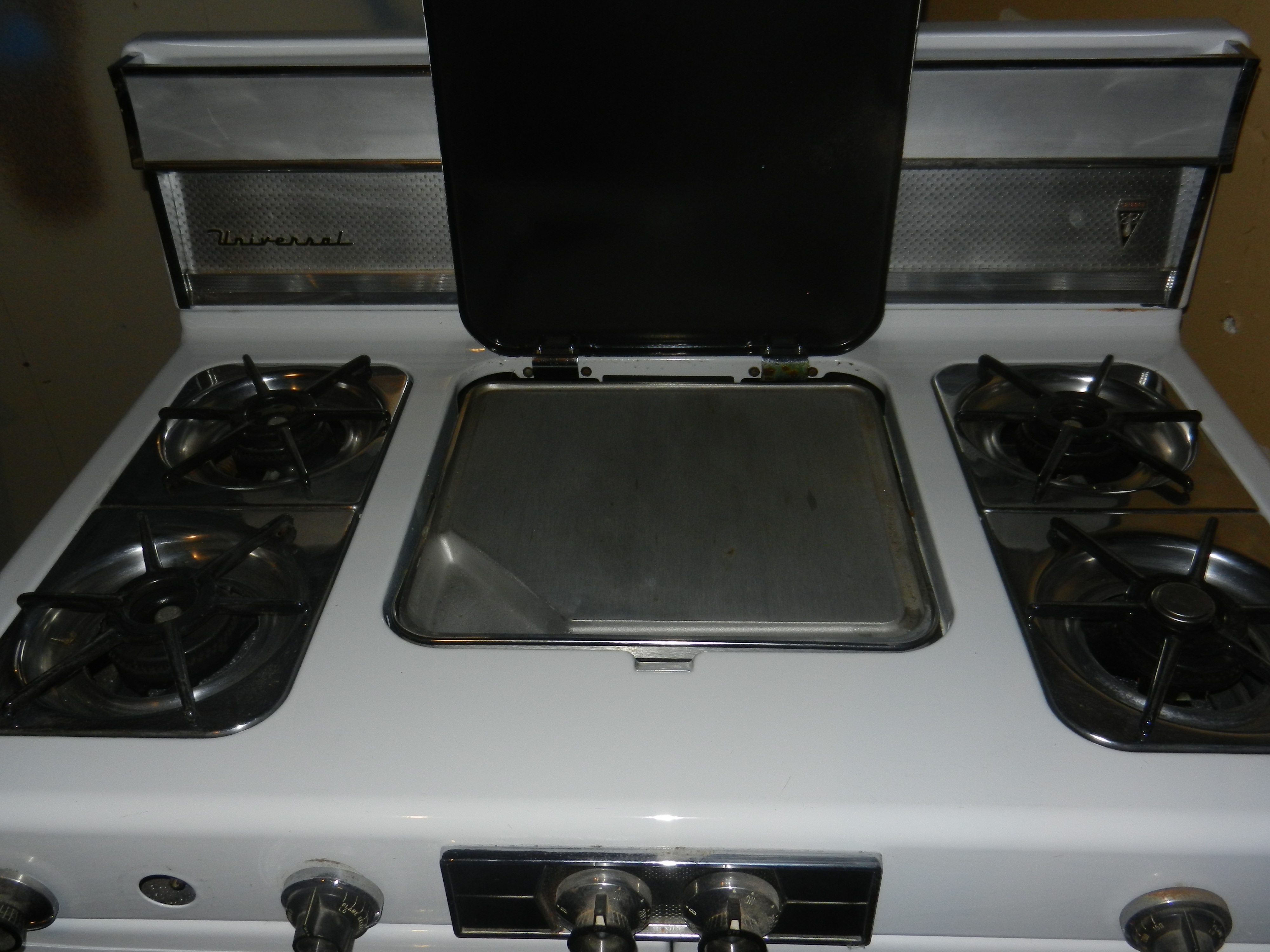 It has 4 burners and a large lid in the center and under it is a griddle which can be removed and has a grate that can be put on it to turn it into a larger burner. It has dual ovens and broilers on it. It is missing one knob but overall if very good condition. There is no grease under the cook top or in any of the ovens or broilers. The griddle does not even look like it was cooked on. Can't find out any information on the stove looking for some help and price on it.