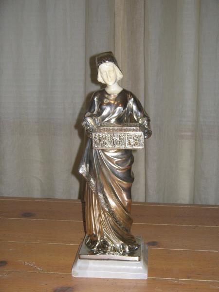 Sculpture in silver (or silver plated over other material); seal on base matches seal of Anton Endstorfer.  Stands on 5 1/2 in square marble pedestal.  Figure of woman dressed in ancient (possibly Greek) costume holding lidded box forward with both hands (lid opens; box can hold small items).