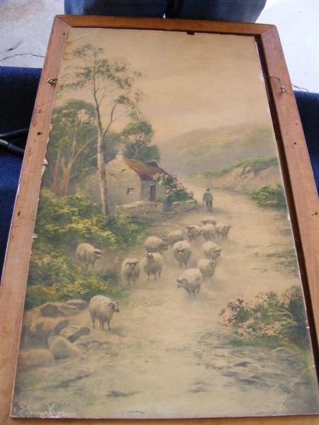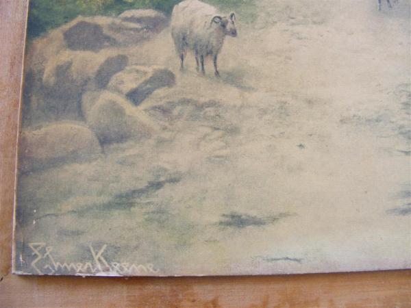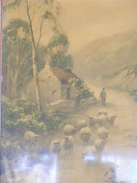 shepard leading sheep past a cottage (print) by Elmer Keene