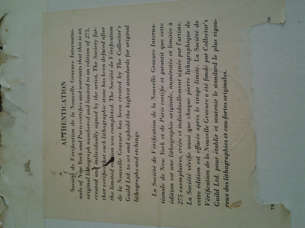 I recieved this from a deceased family member and I do not know ANYTHING about it so I am tryin to find out its worth and who the artist is. All I know is it is  a lithogram which I read from the authentification on the back.