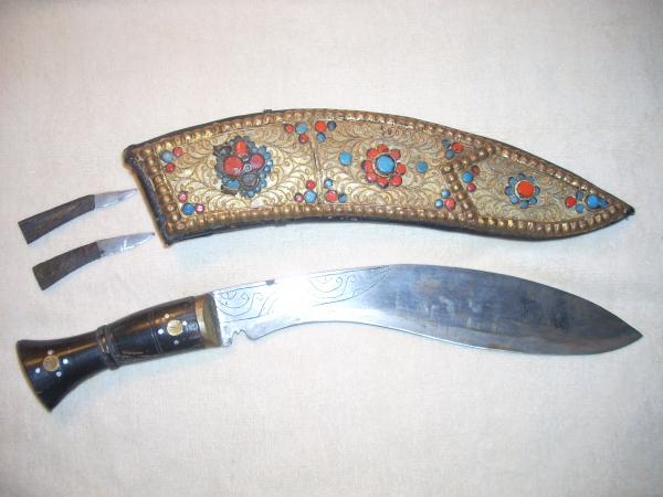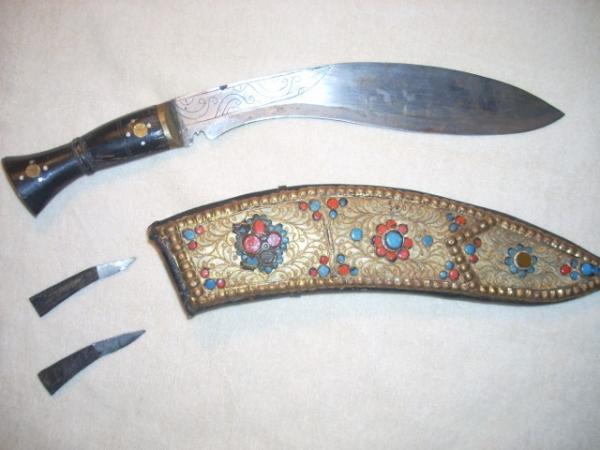 Handcrafted knife holder Brass over layment with painted stones or glass in varies colors. Very well crafted art. The knife blade has a symbol or personal picture etched on both sides. Handle is brass and some kind of hardwood. Also the holder comes with two very small knifes that look as if the handles were made of bone. Pictures will tell the rest.
