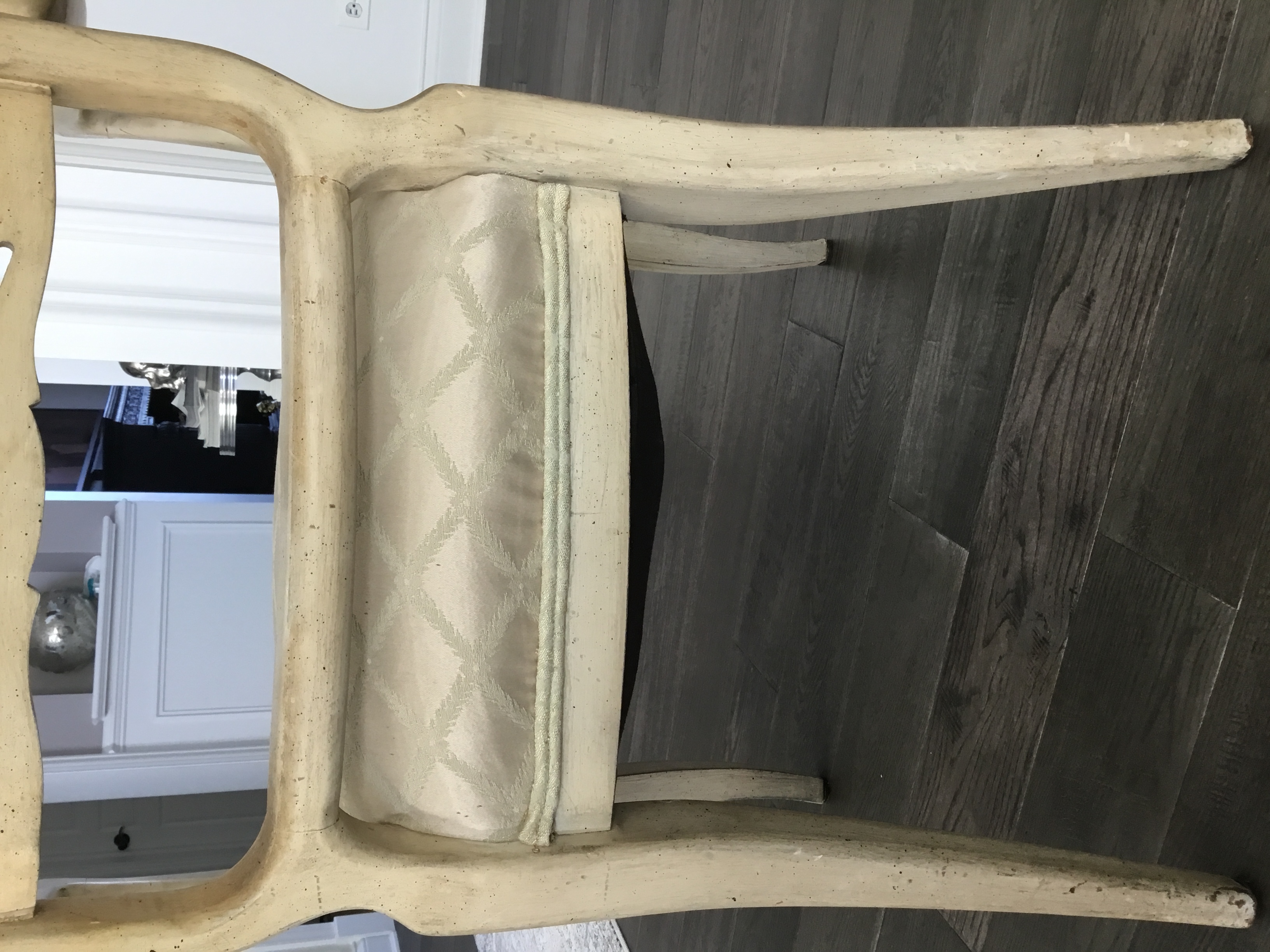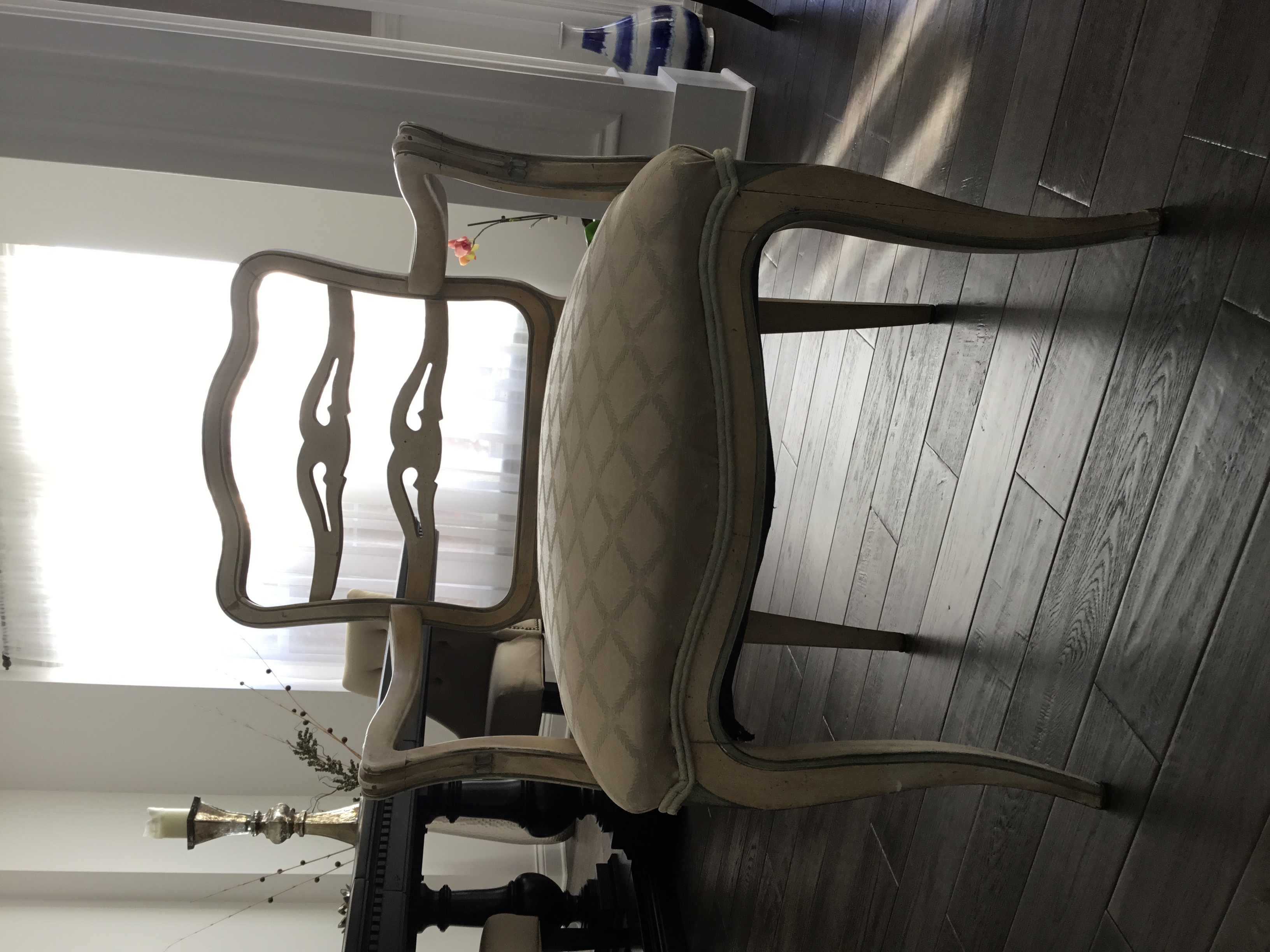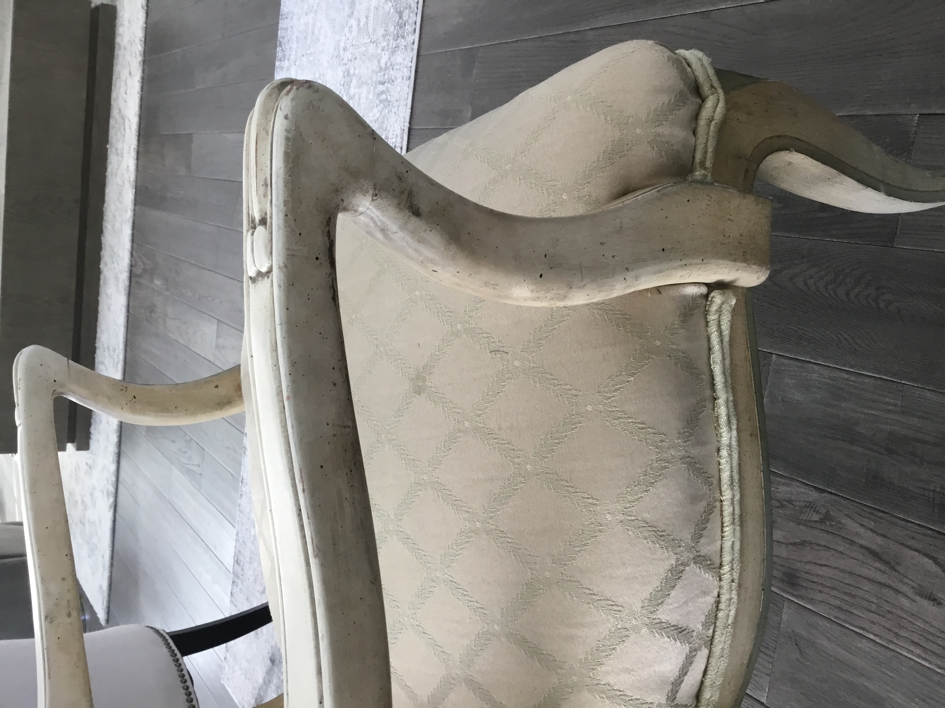 Hello, I would like to know what style would this chair be considered. I have'nt yet found any markings on the chair. The acctual chair seems to be made out of a solid wood. I do see glue next to the nail heads, but I wonder if someone was gluing the piping around the chair possibly when it was reupholstered. Any information would be great!