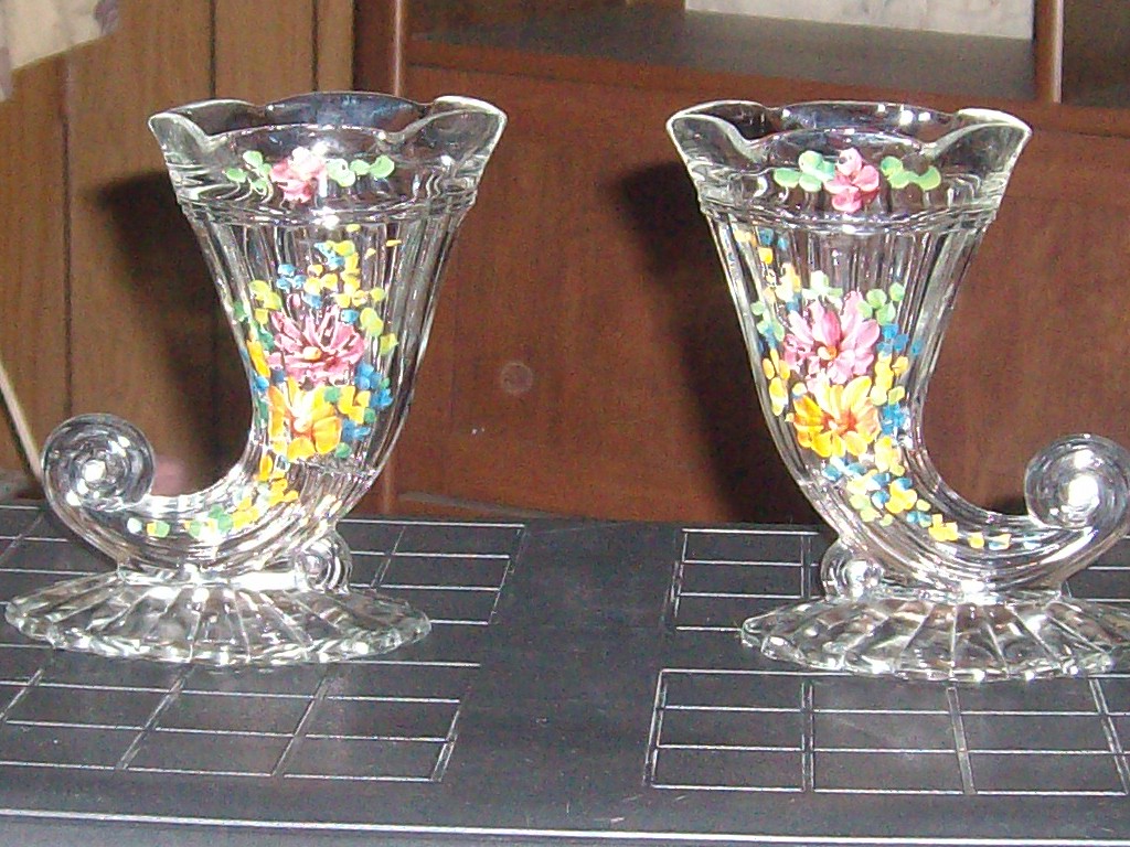 The CORNUCOPIA HORN STYLE. Vintage Jeanette Clear Glass Cornucopia Ribbed Candleholder / Vase - Handpainted THEY SELL FOR AROUND $20.00 EACH.