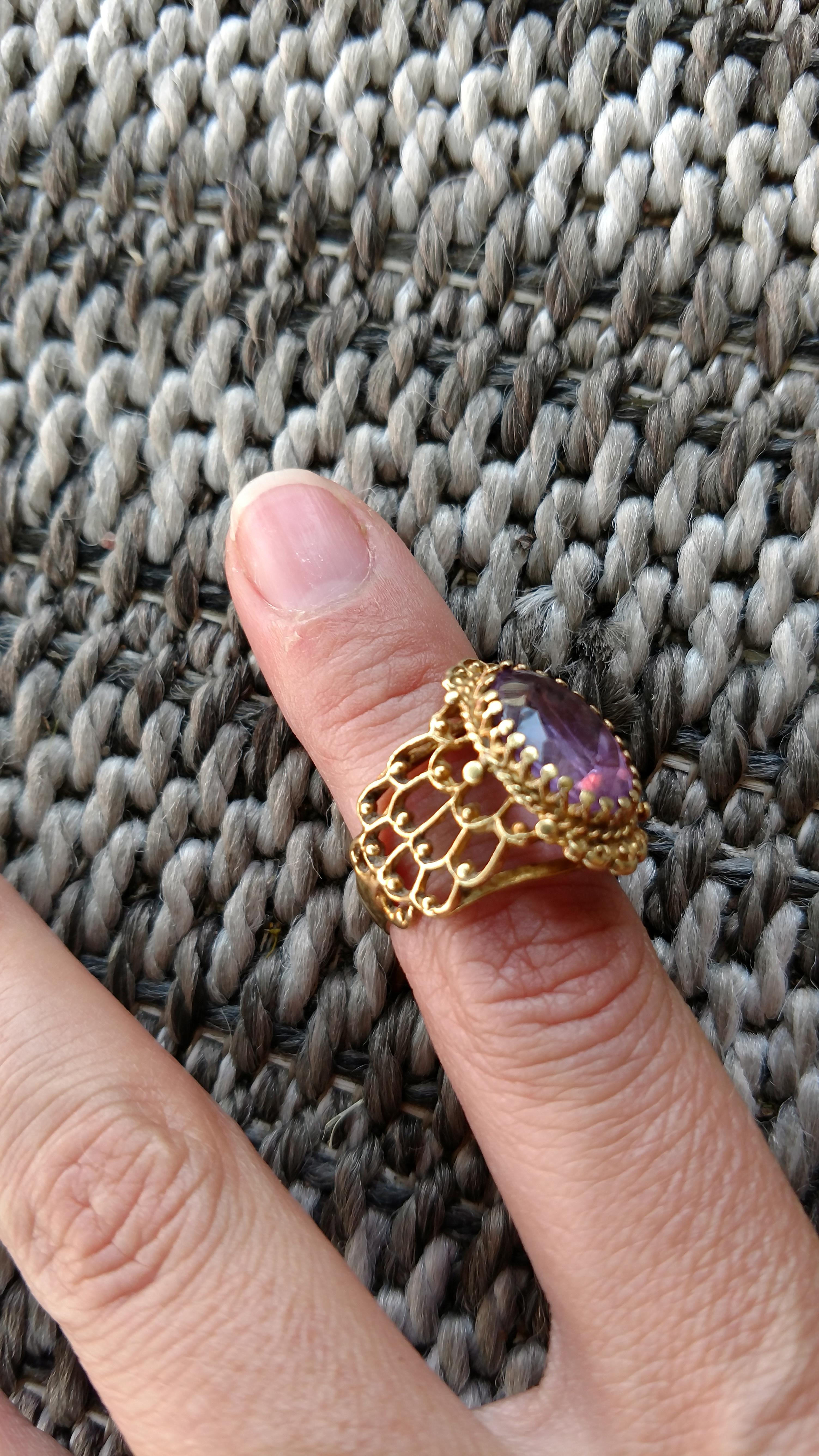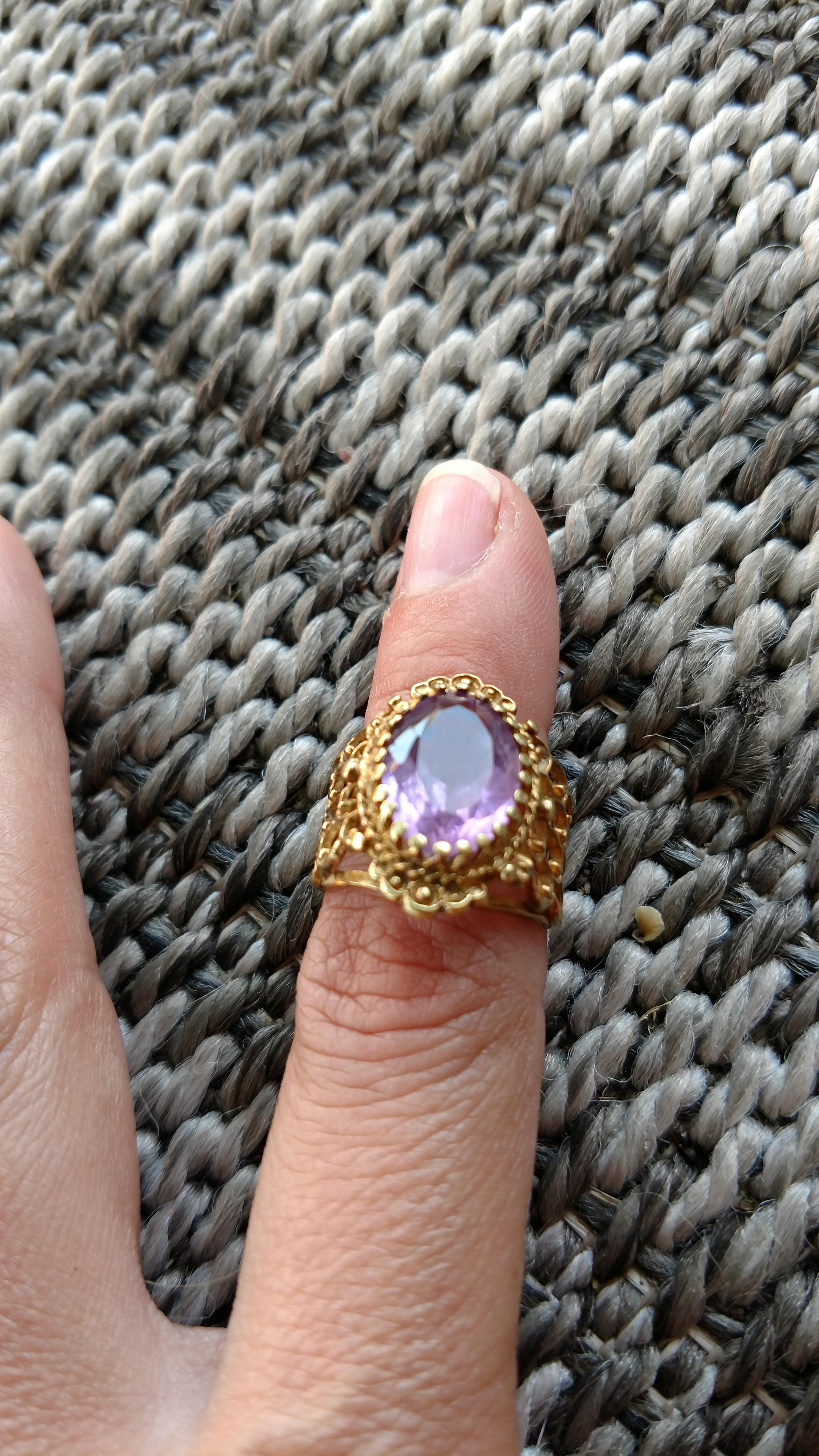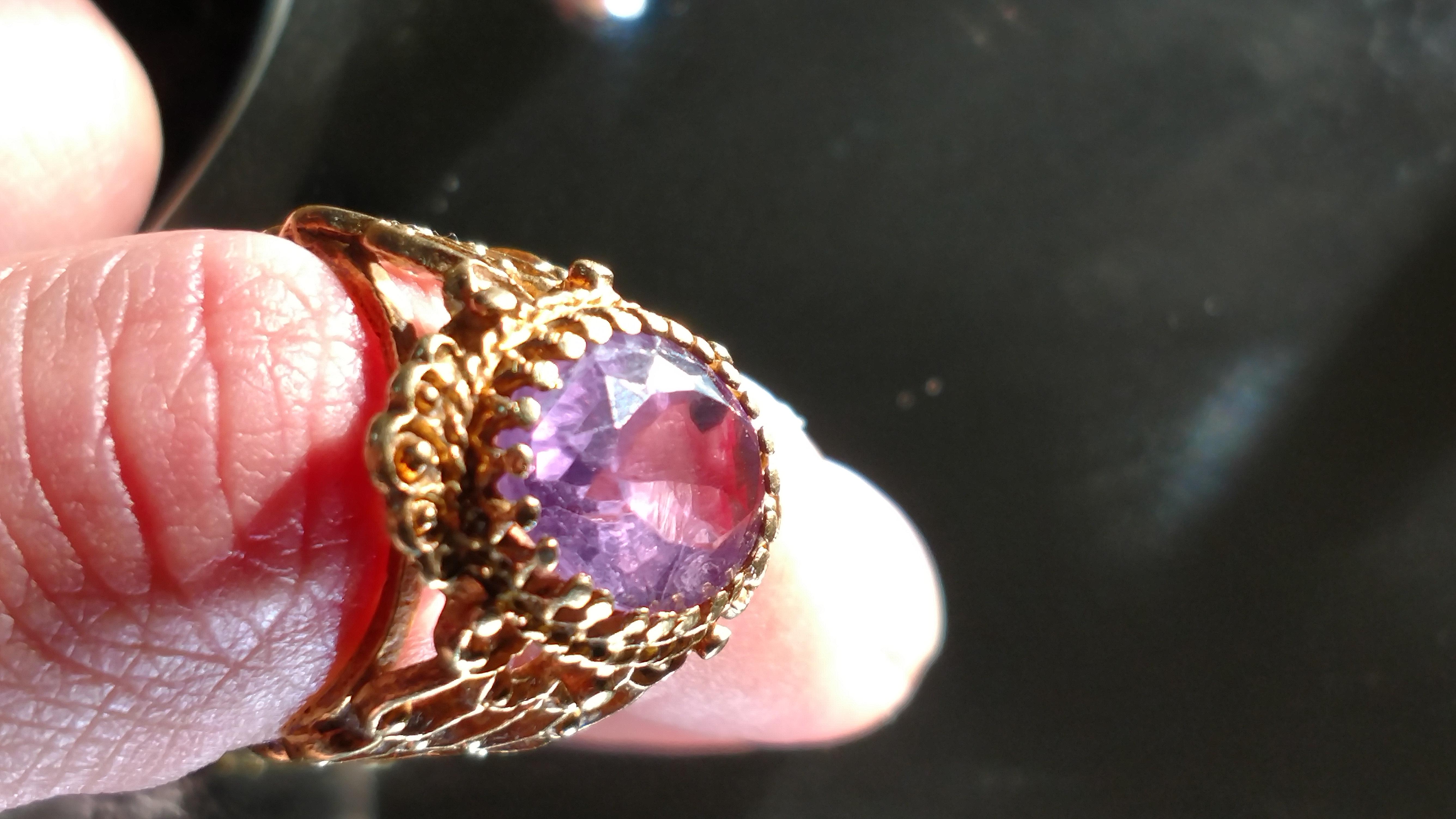 Stamped 18k, I believe it's amathyst. Vintage from great aunt.