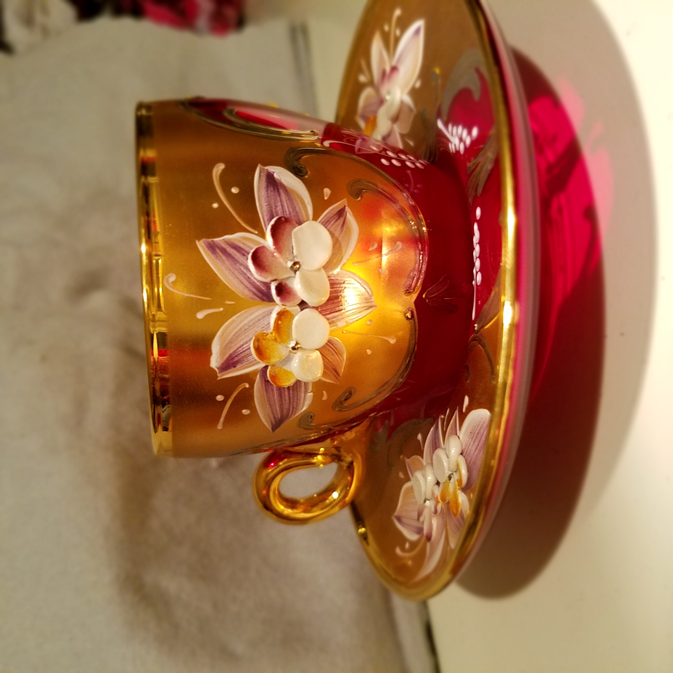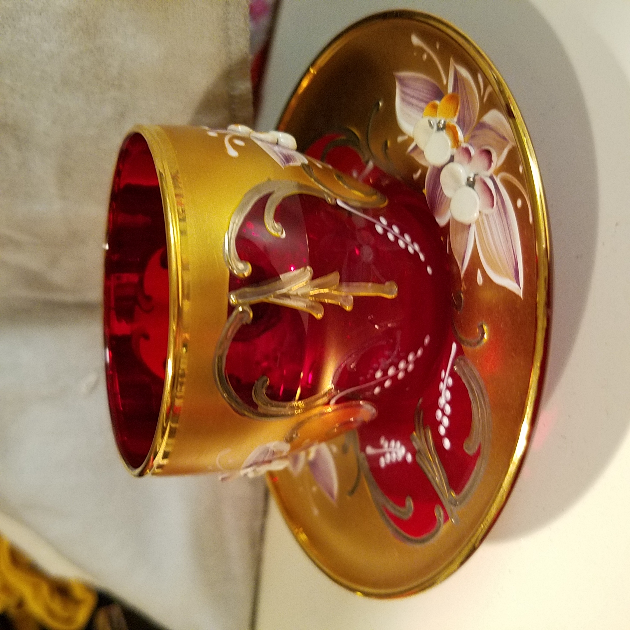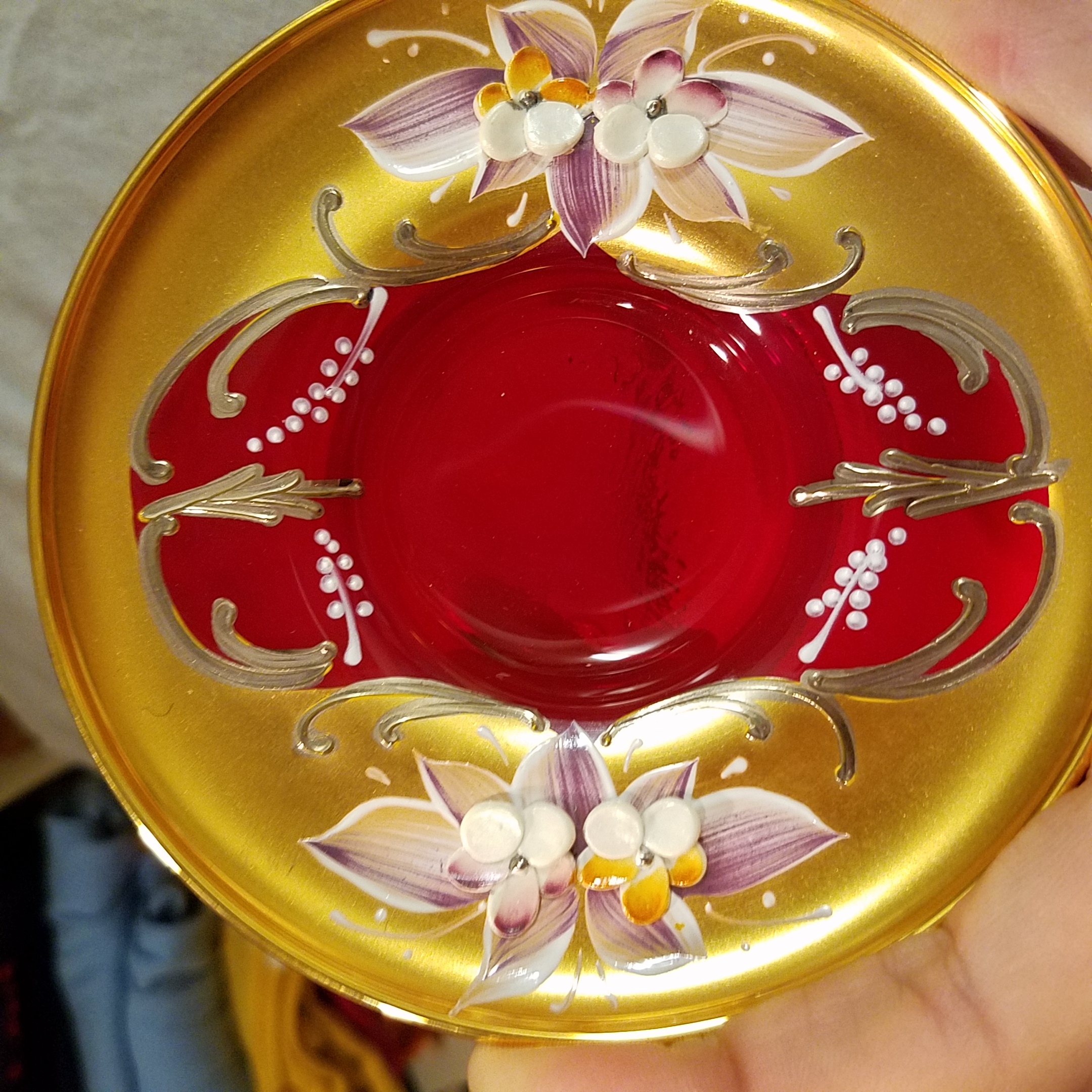 Picked this up at a garage sale a few years ago. It looked unique to me and I had never seen red glass like it before. Im not sure if this set is worth anything or not but I'm really just interested in finding out who made it and the time period it's from. I dont see any obvious markings or stamps besides the initials M.A. which appears to be carved into the glass and only on a couple of the pieces which leads me to believe that this was done by a previous owner? However on a couple of the pieces if you look at the bottom in a certain light it looks like there may be some kind of circle marking and maybe some Asian characters along the bottom Ridge of the saucers. I will try and get a good picture. I have looked for info on this set before and it looks similar to some Murano sets that I was able to find? But again I'm not sure at all about this stuff so please i hope someone can tell me something about it. The glass is a beautiful red color. The handpainted flowers are raised giving it a 3d look i guess. Also there is shiny gold (leaf?)trim along the rim of the cups and saucers as well as the handles on the cups. The other gold is more of a matte finish around the outside of the cups and the inner part of the saucers. Sorry I don't know the technical terms here. Unfortunately I seem to have lost the teapot because it was not in the box that it should have been in with the rest of the set which is a bummer because I'm pretty sure that it is the most important part of any teaset. I'm hoping that it is floating around somewhere but who knows. There also used to be a matching ashtray but during one of the times I moved it was dropped by the movers who moved my things and it broke. Not sure if that info is relevant but I'm just trying to give as much detail as I can.