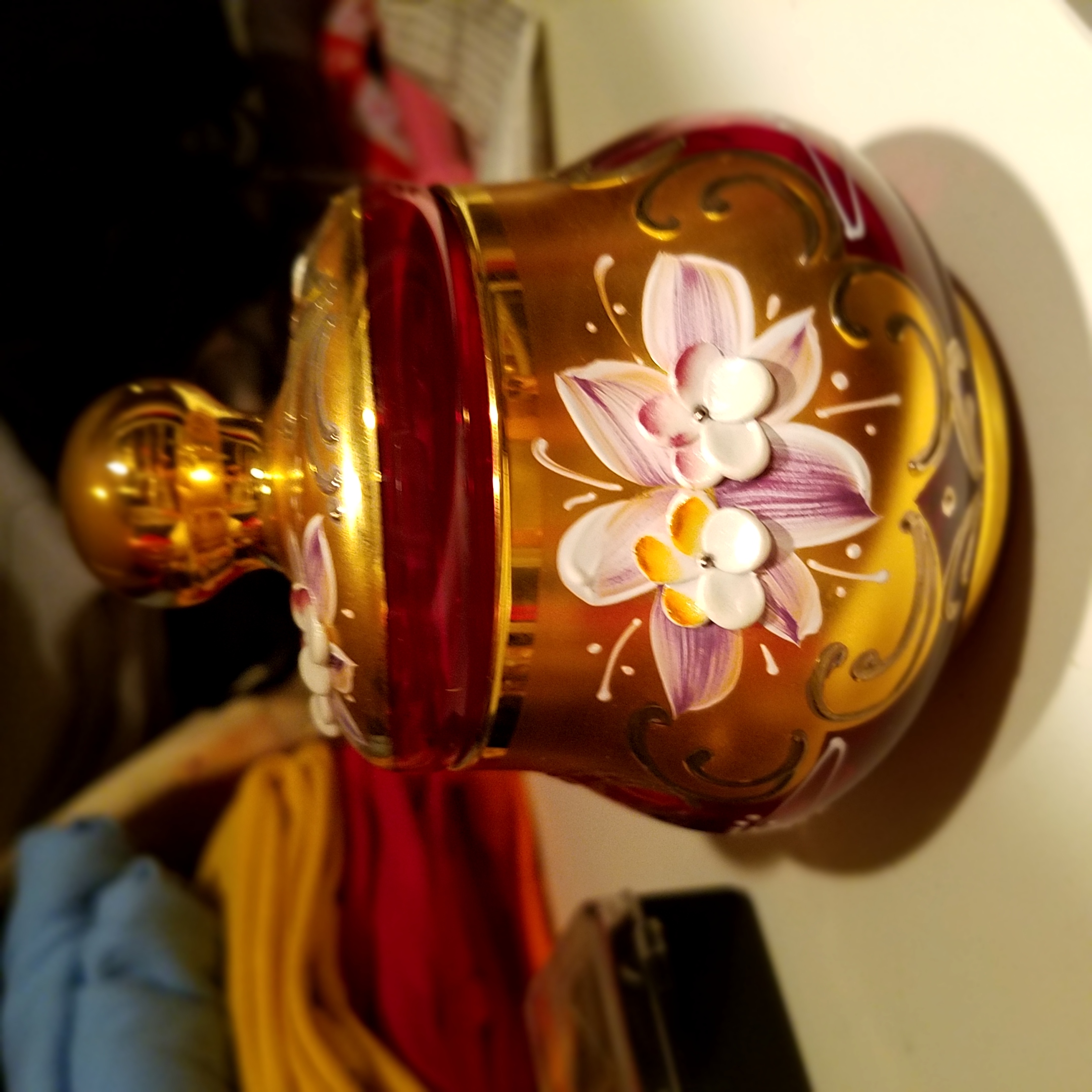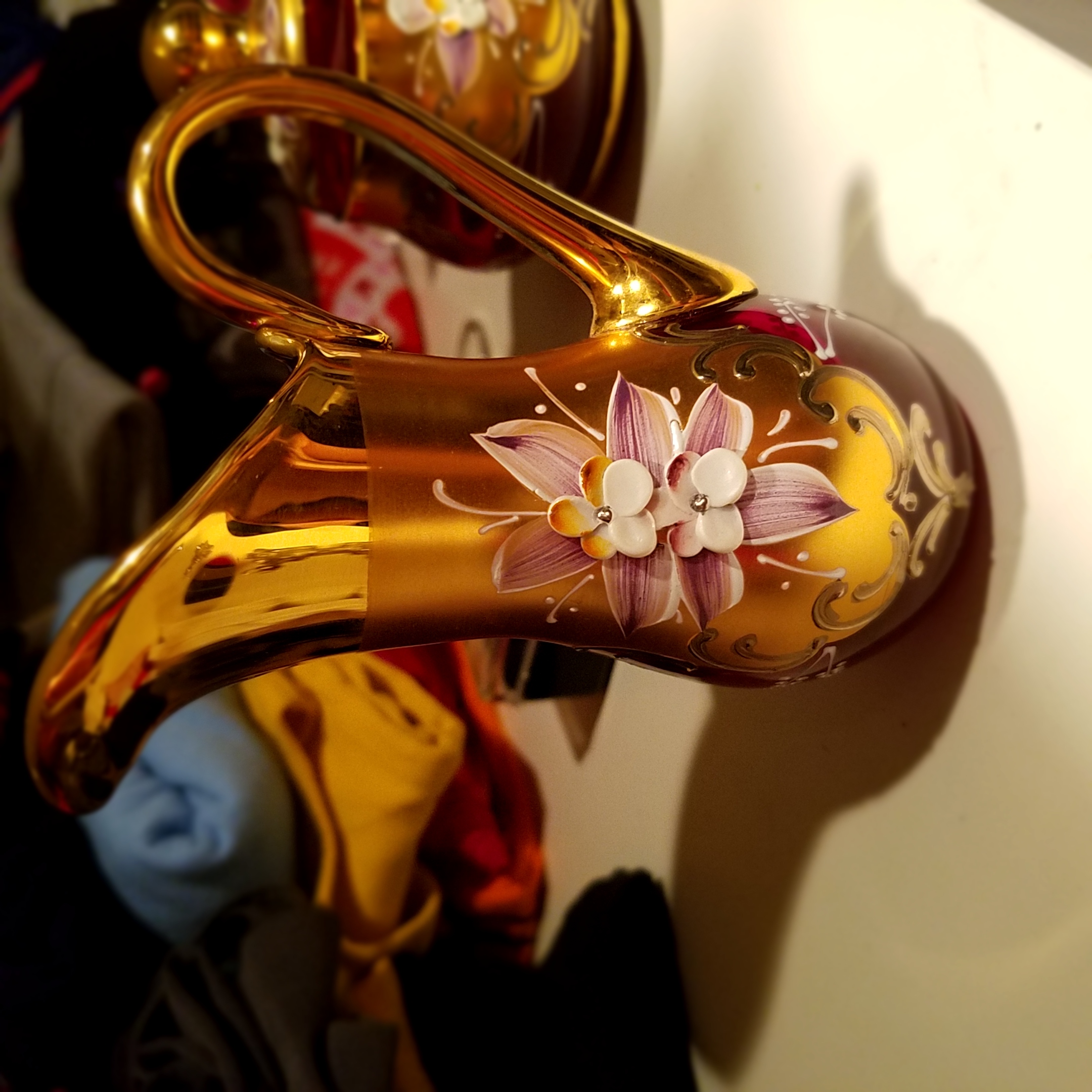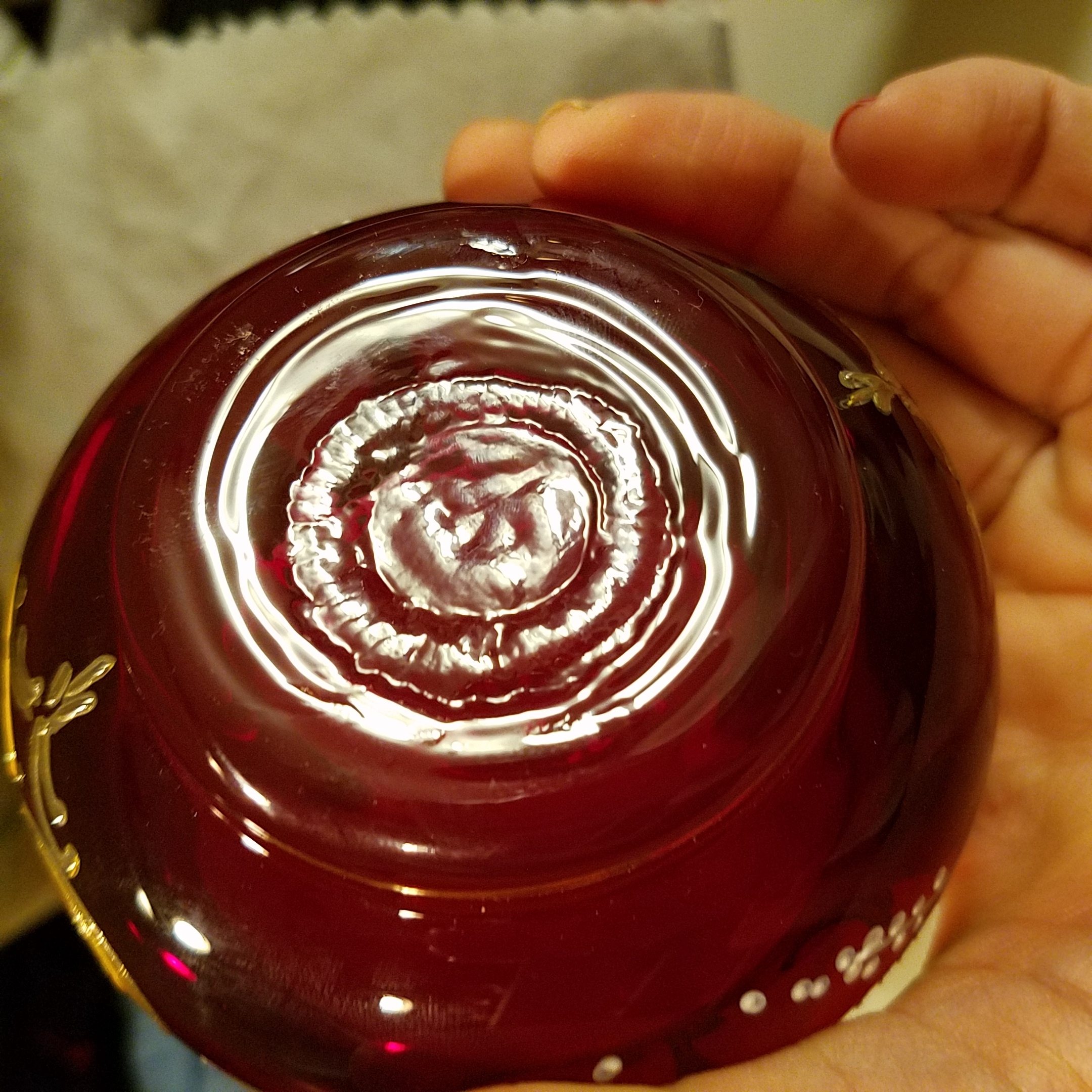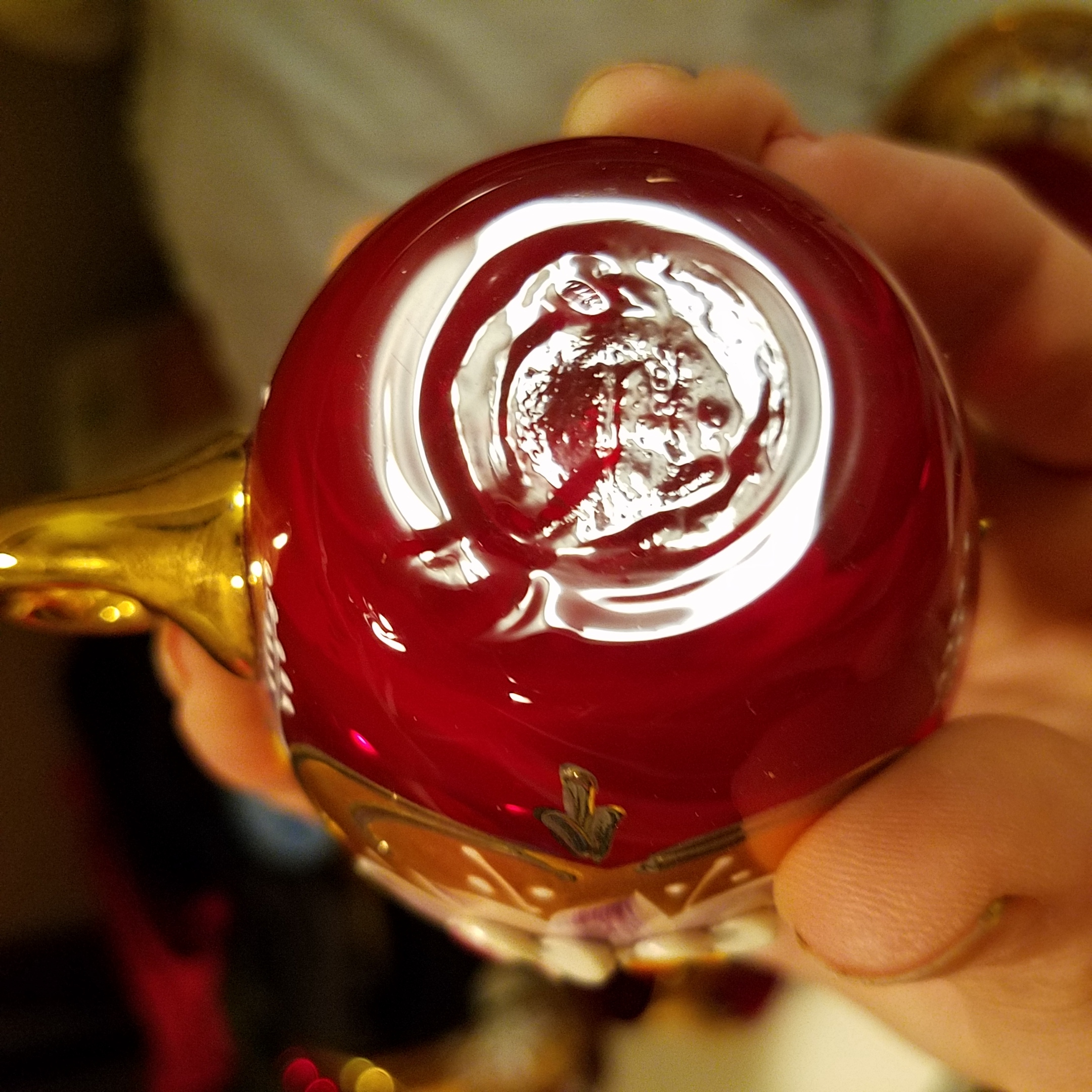 Picked this up at a garage sale a few years ago. It looked unique to me and I had never seen red glass like it before. Im not sure if this set is worth anything or not but I'm really just interested in finding out who made it and the time period it's from. I dont see any obvious markings or stamps besides the initials M.A. which appears to be carved into the glass and only on a couple of the pieces which leads me to believe that this was done by a previous owner? However on a couple of the pieces if you look at the bottom in a certain light it looks like there may be some kind of circle marking and maybe some Asian characters along the bottom Ridge of the saucers. I will try and get a good picture. I have looked for info on this set before and it looks similar to some Murano sets that I was able to find? But again I'm not sure at all about this stuff so please i hope someone can tell me something about it. The glass is a beautiful red color. The handpainted flowers are raised giving it a 3d look i guess. Also there is shiny gold (leaf?)trim along the rim of the cups and saucers as well as the handles on the cups. The other gold is more of a matte finish around the outside of the cups and the inner part of the saucers. Sorry I don't know the technical terms here. Unfortunately I seem to have lost the teapot because it was not in the box that it should have been in with the rest of the set which is a bummer because I'm pretty sure that it is the most important part of any teaset. I'm hoping that it is floating around somewhere but who knows. There also used to be a matching ashtray but during one of the times I moved it was dropped by the movers who moved my things and it broke. Not sure if that info is relevant but I'm just trying to give as much detail as I can.