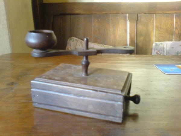 Item has a draw which when open has circular cutouts. Possibly for small weights?