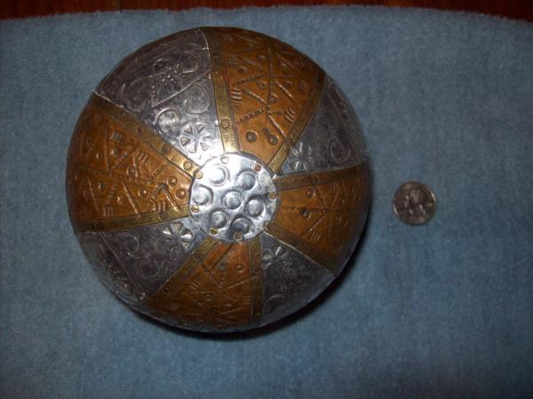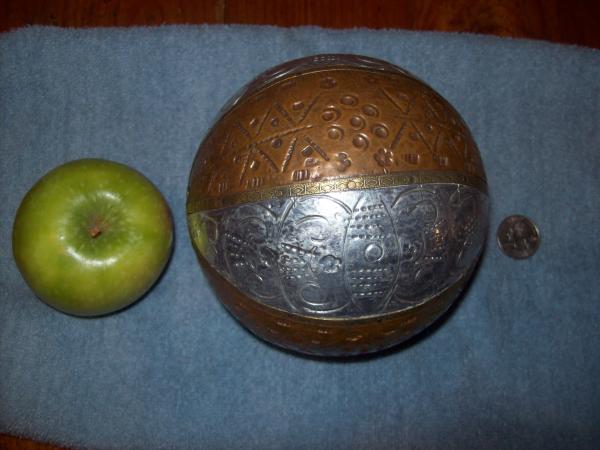Stainless steel, brass, copper, and possibly silver decorative ball. Purchased at a garage sale in the 90's. The couple had owned it for 40 years and had purchased it at an estate sale.