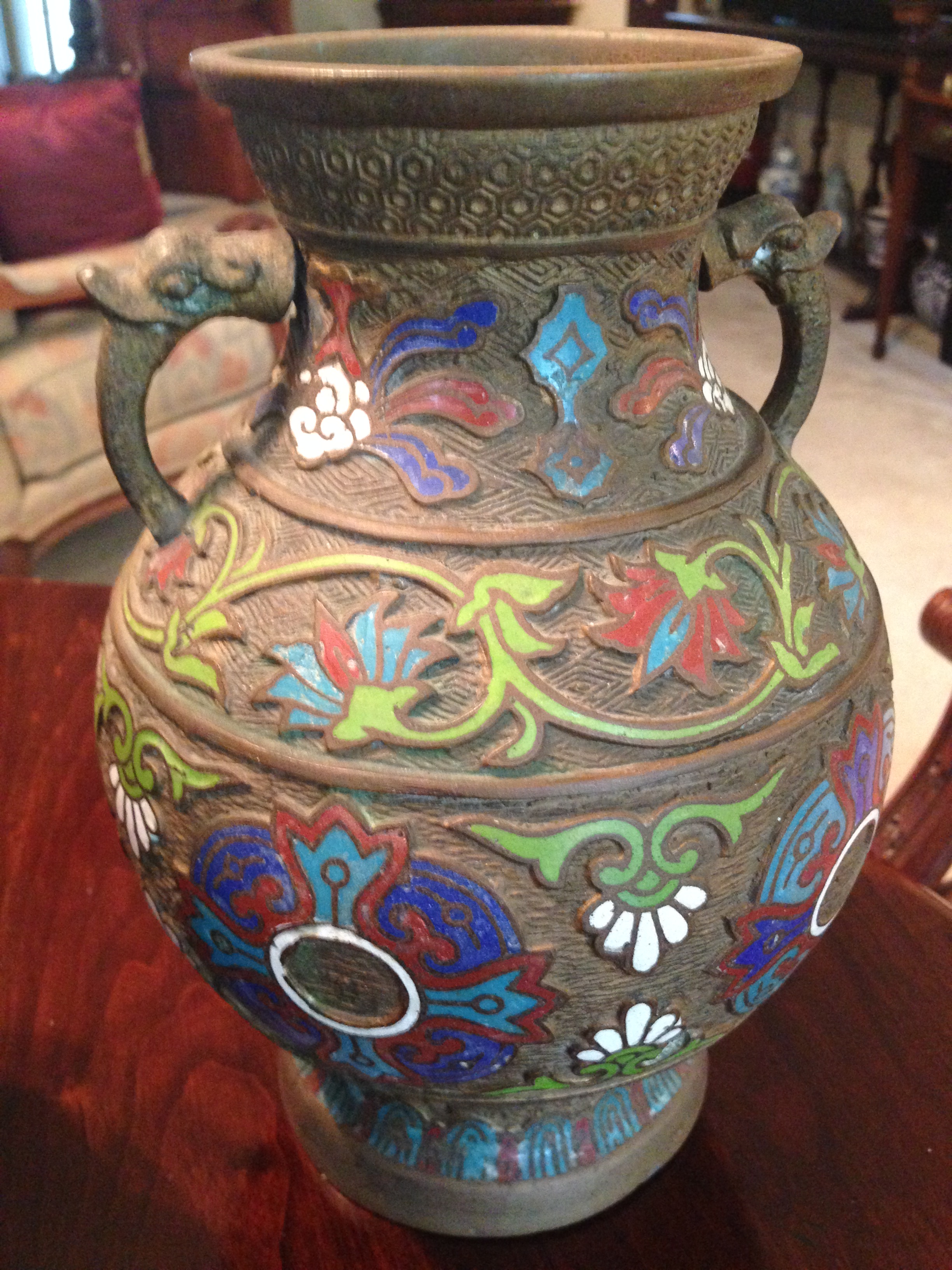 i think that you have a chinese, bronze, cloisonne(that is the colored enameling) vase. it has a seal mark that appears to be chinese and looks old, at least in the 1850-1900 period. to get an idea of price range go to ebay-antique, asian cloisonne. i am guessing between 100-200 dollars or more....hope that helps....