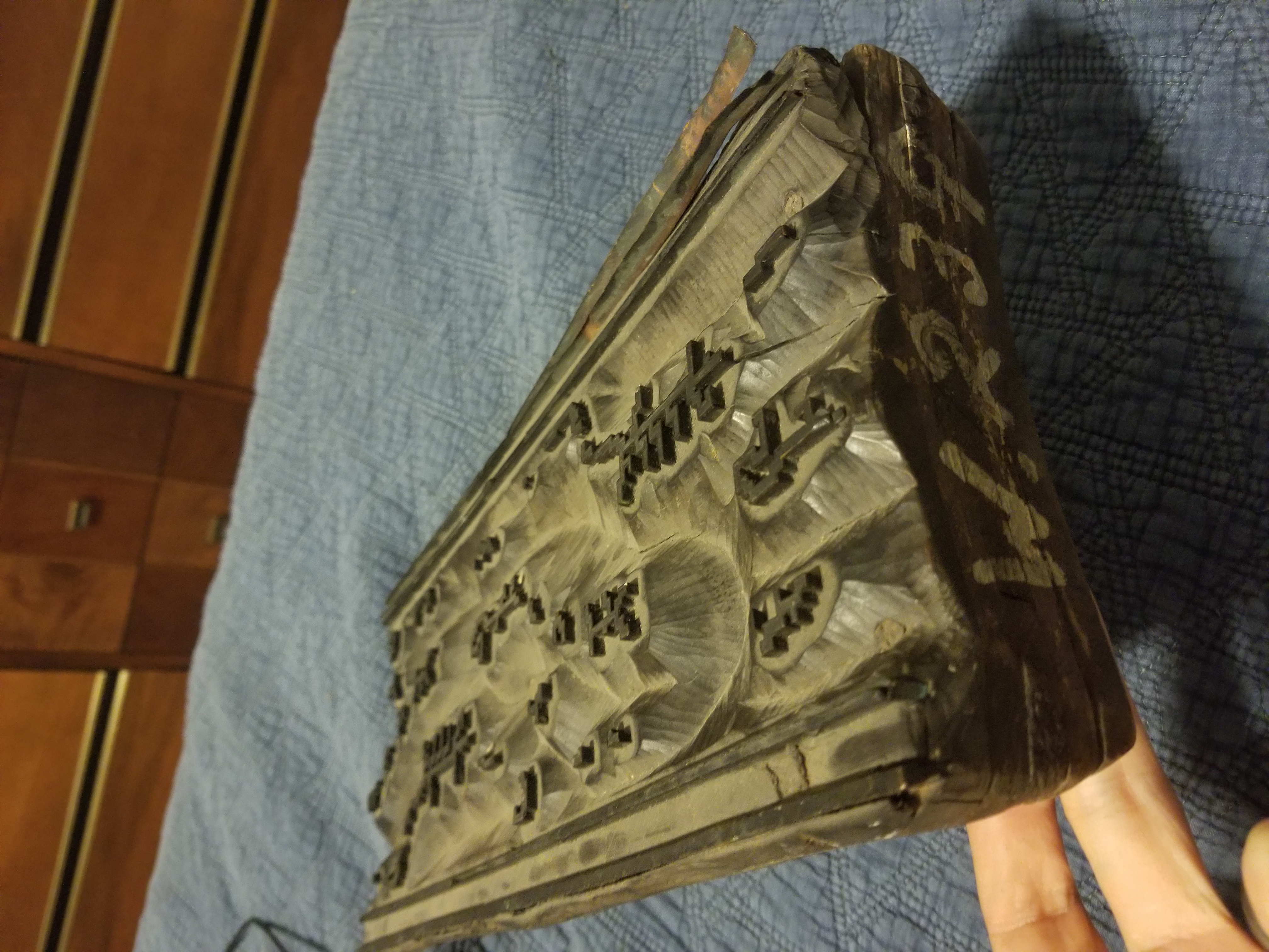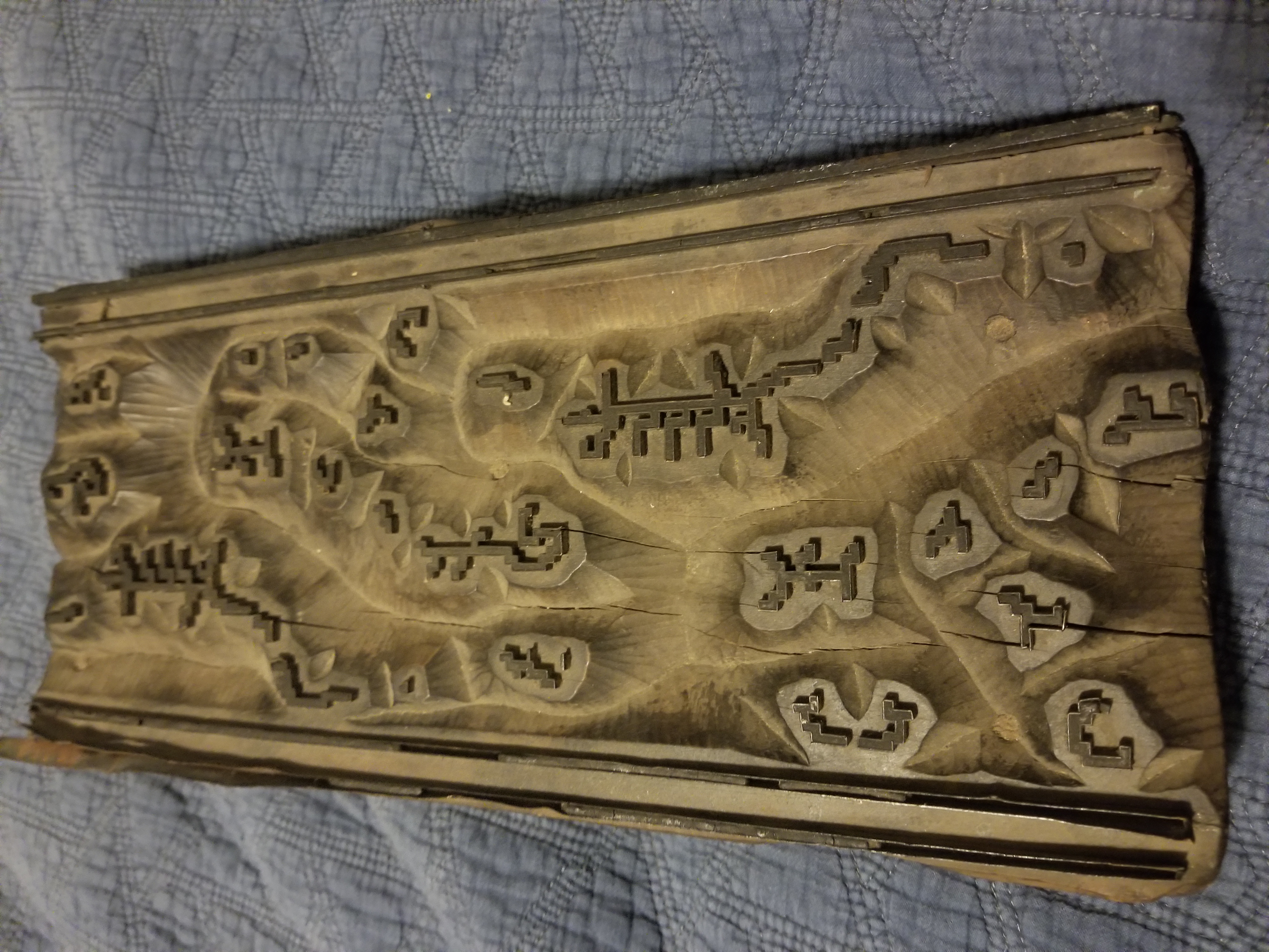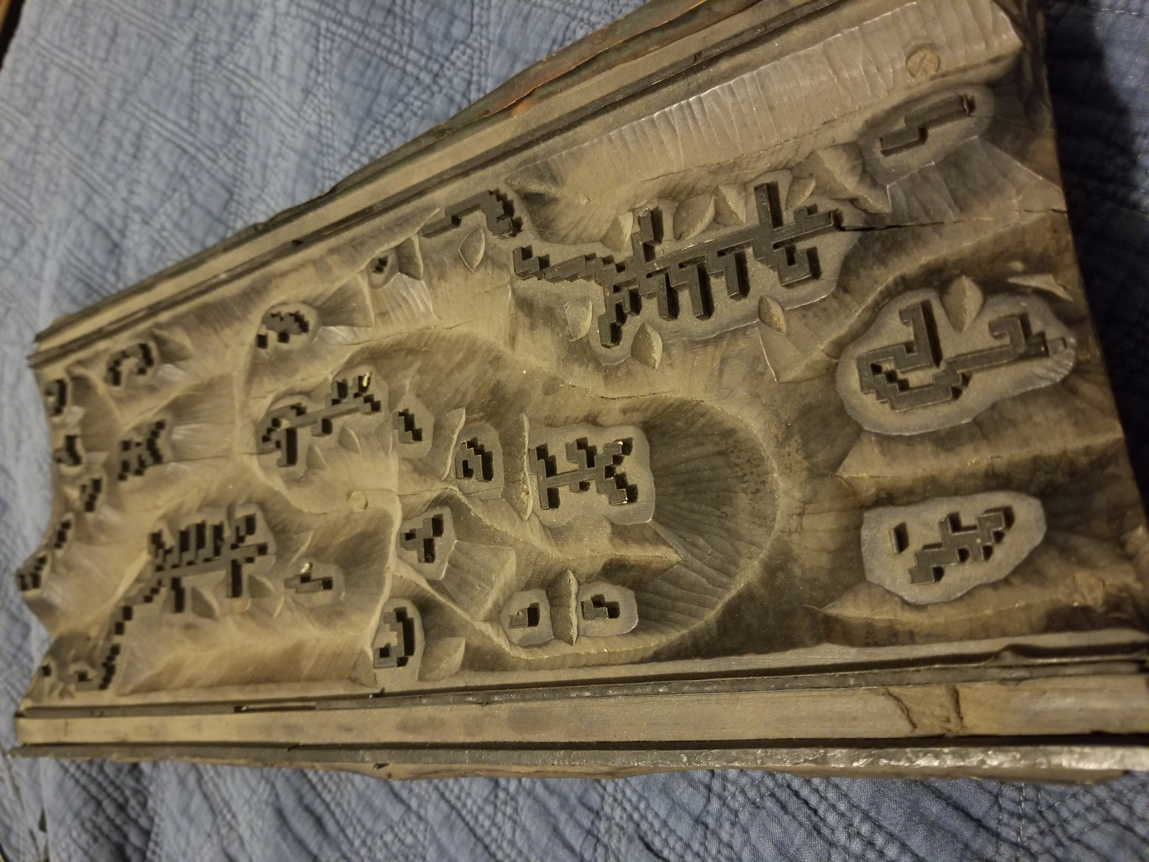 Wood fabric block printing had originated way before the birth of Christ. It was a slow process used to transfer the medium onto fabric. This piece has what I believe as an Indian style. These blocks have been used all over the world. There are still pieces like these produced today.