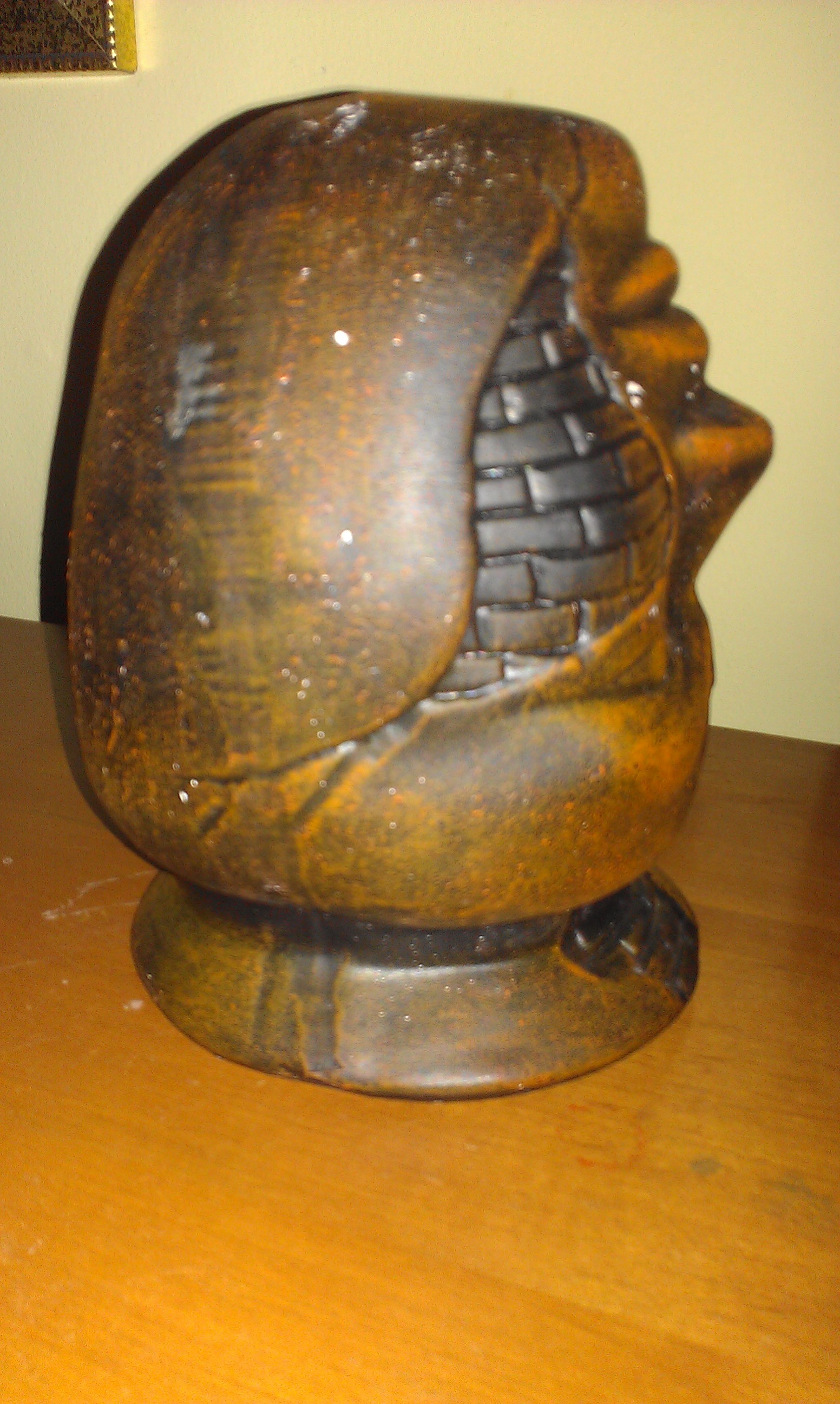 I dont know anything about this. I thought I'd be able to find something similar through google and past auctions, but I've not been able to. It seems to be a hollow pottery sculpture. I thought it could be tin because of the lip at the bottom of the base, but everyone here seems to think it's pottery.  It measures 5-6". It weighs less than a pound.  It's quite different. I am interested in selling all of my pieces, but want to know what they are first.