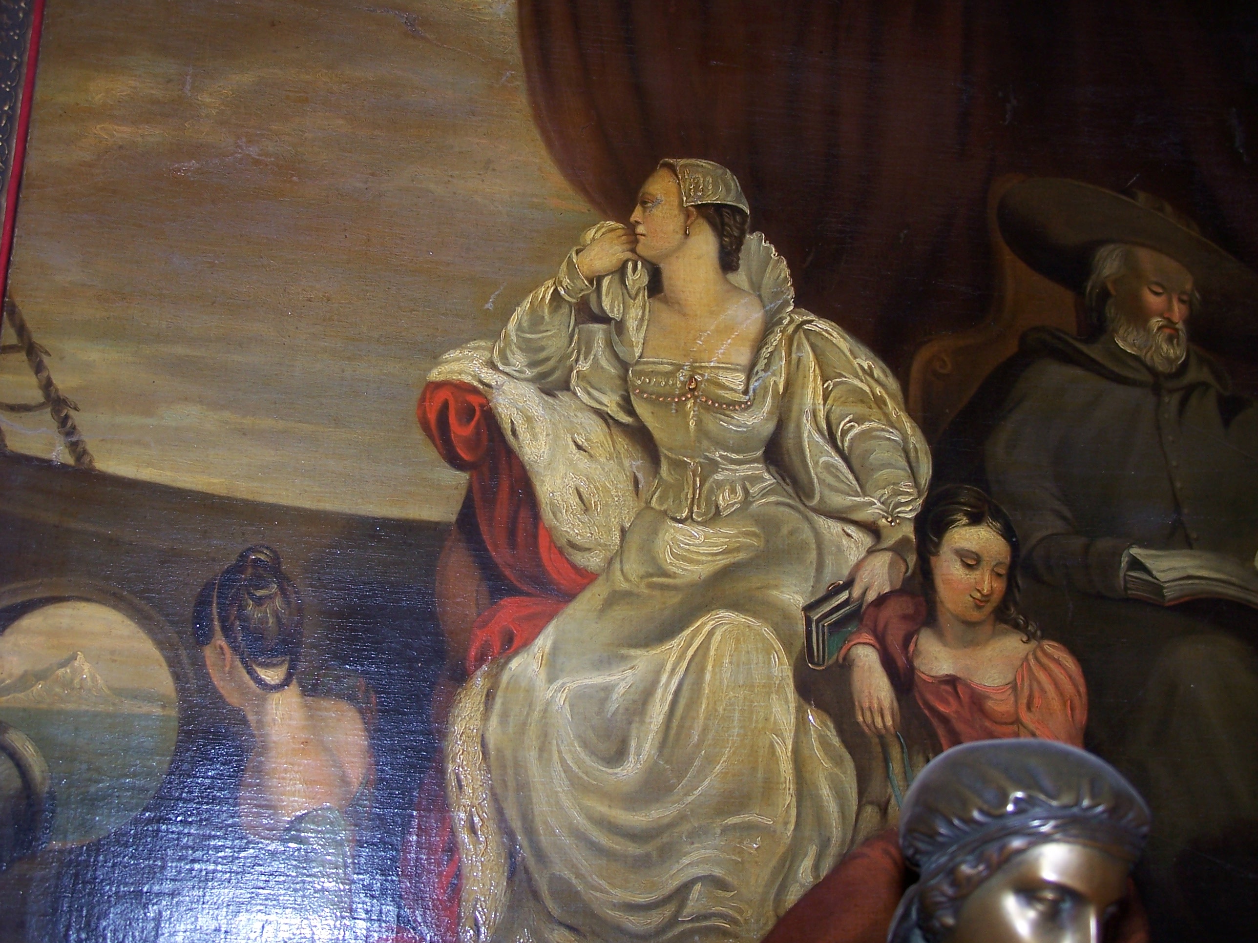 Its an original oil painting, I am not certain of the subjects but it appears to be possibly a Spanish Queen with possibly her daughters, a Padre, mandoline and what looks like The Rock of Gibraltar in the distance looking through the canon hole.