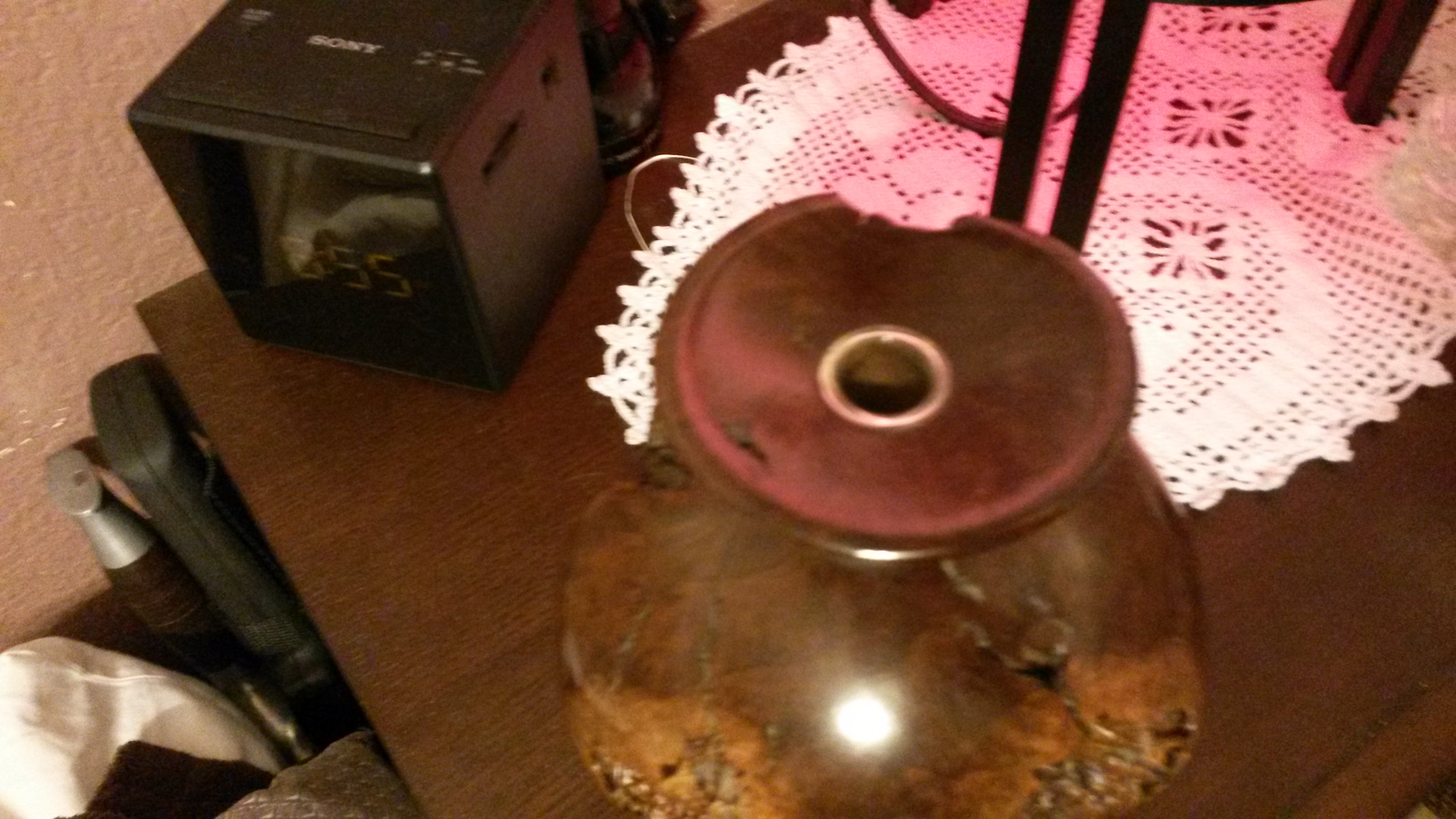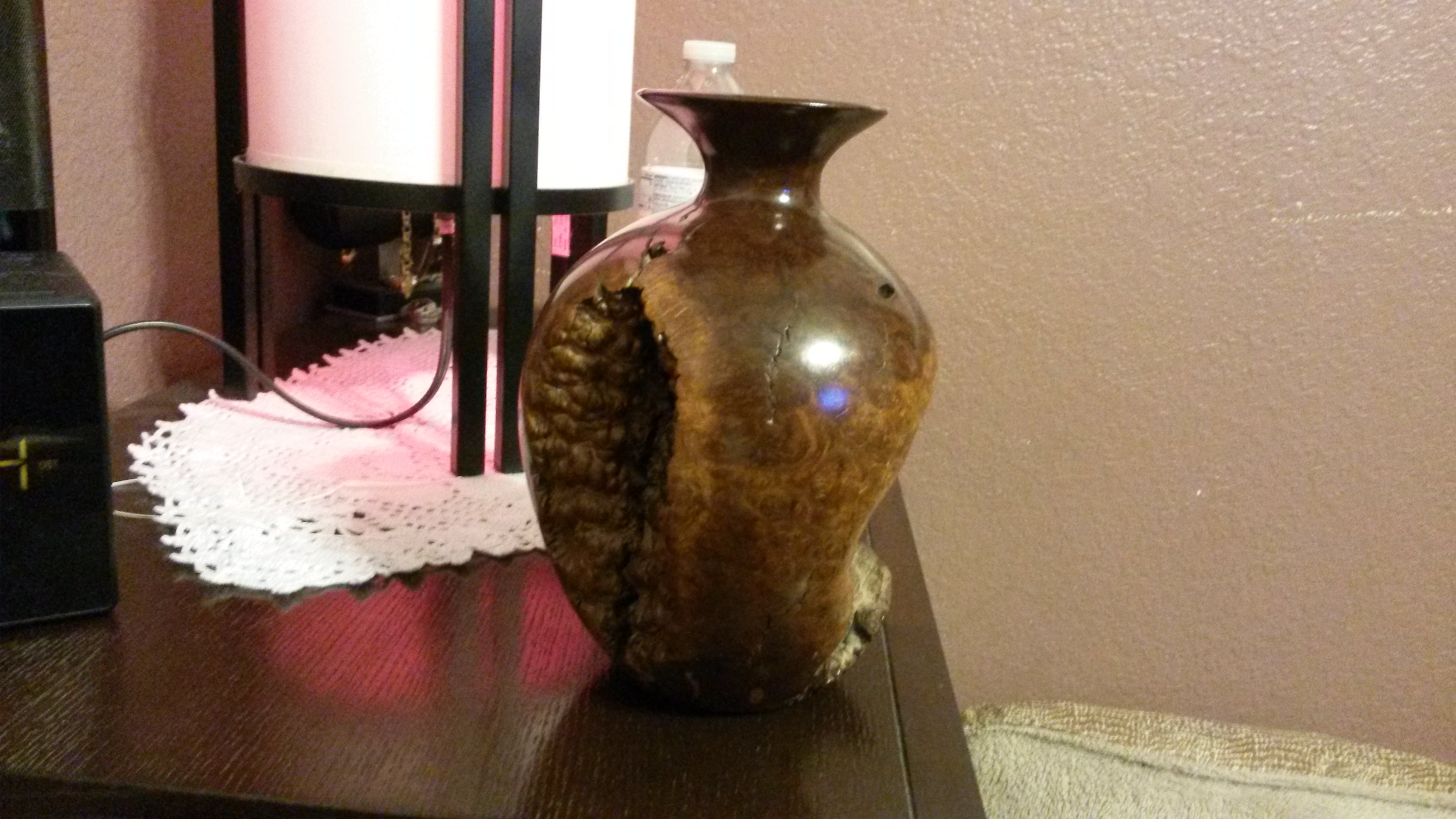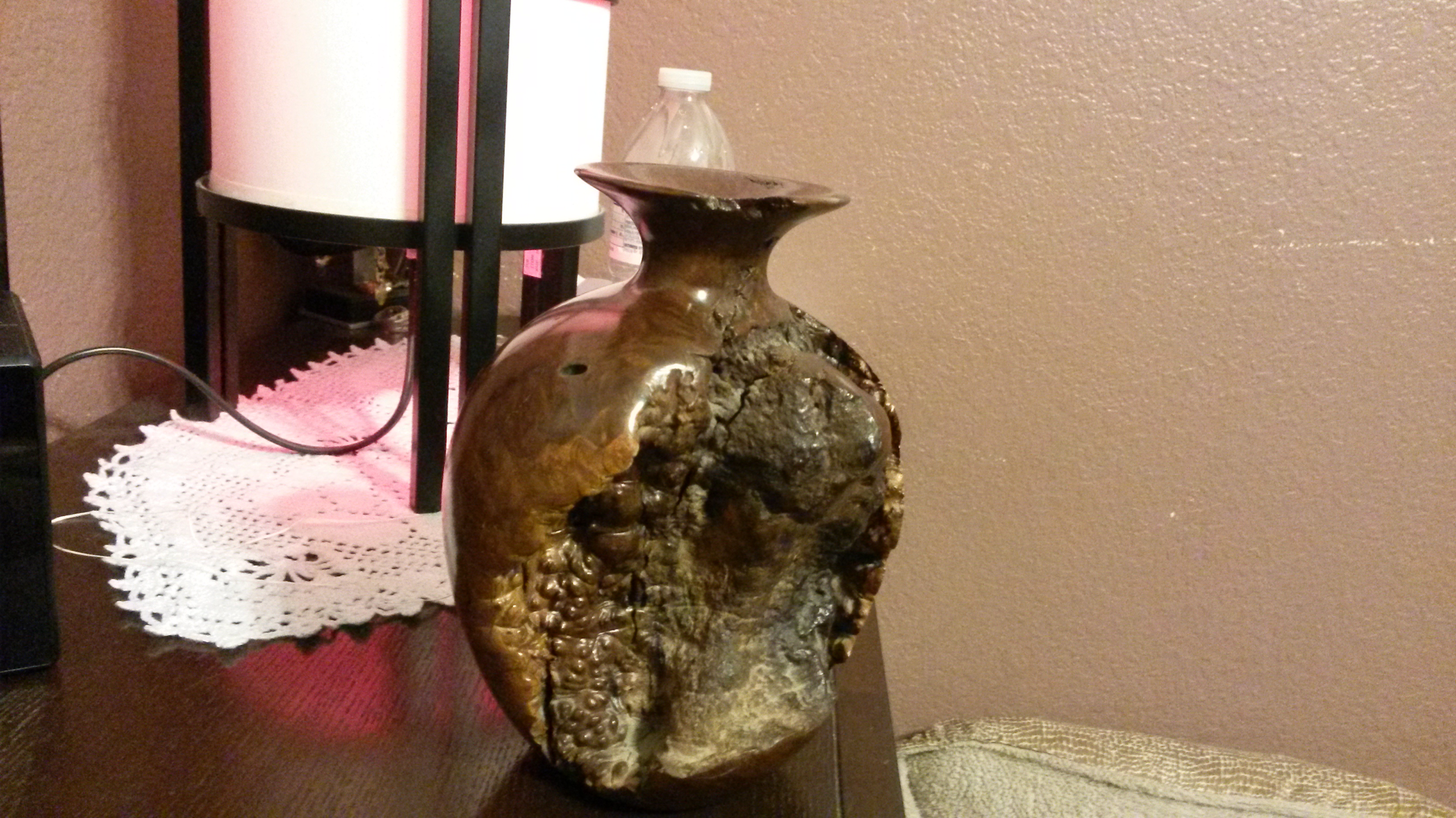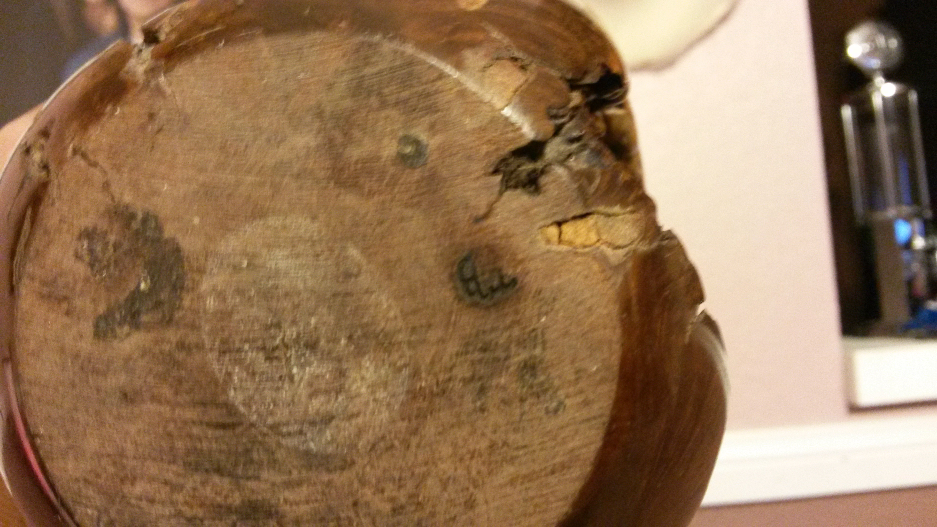 vase is 7 inches in height x 6 inches in diameter,appears to be a very big and old pomagranite fruite that has turned to wood,Also has a tube like glass flask that is about 5 inches long  and 3/4 of an inch round in the top that runs down the middle of what appears to be possible wood,on the underside there appears to be an arabic  or jewish symble