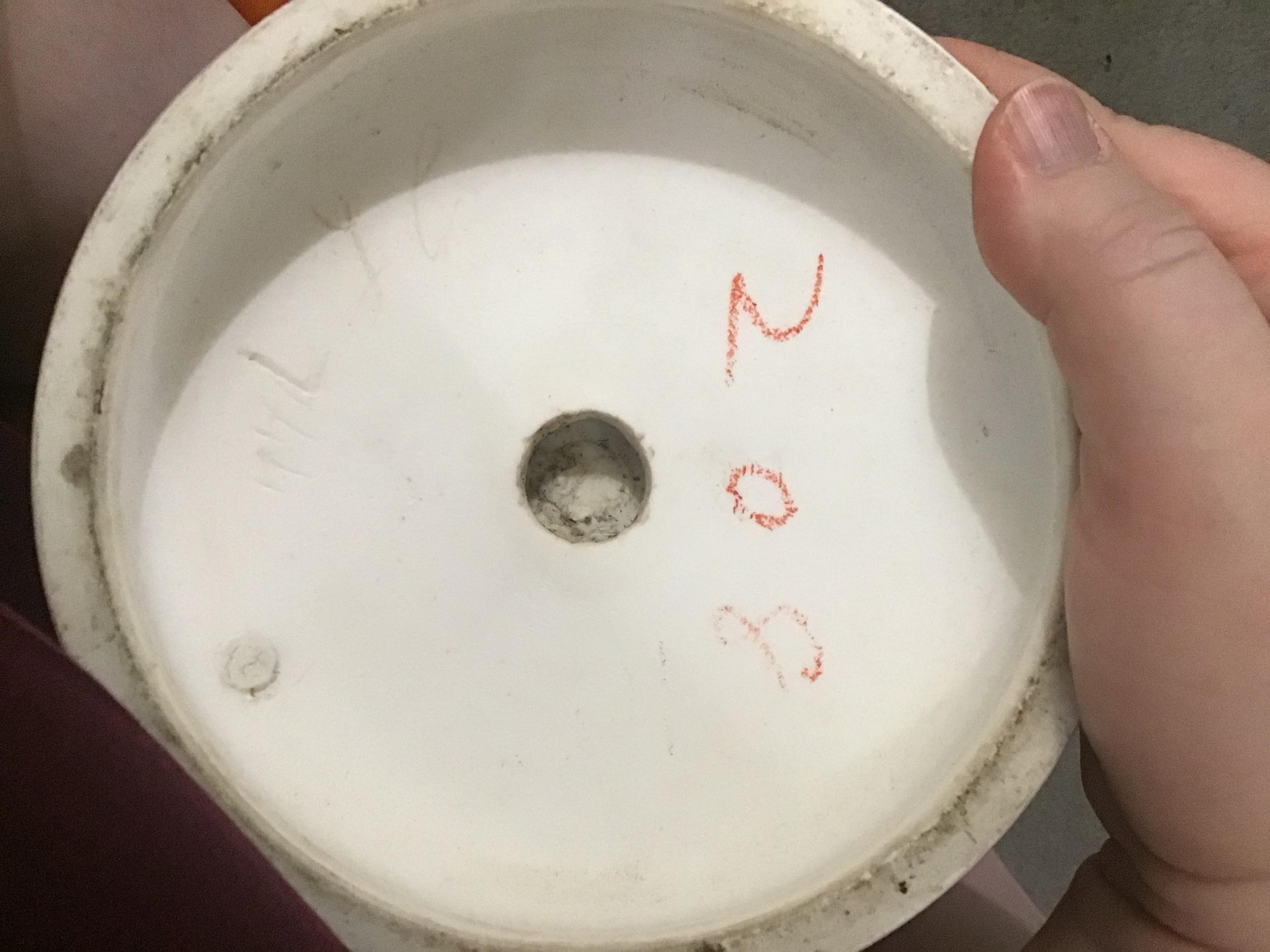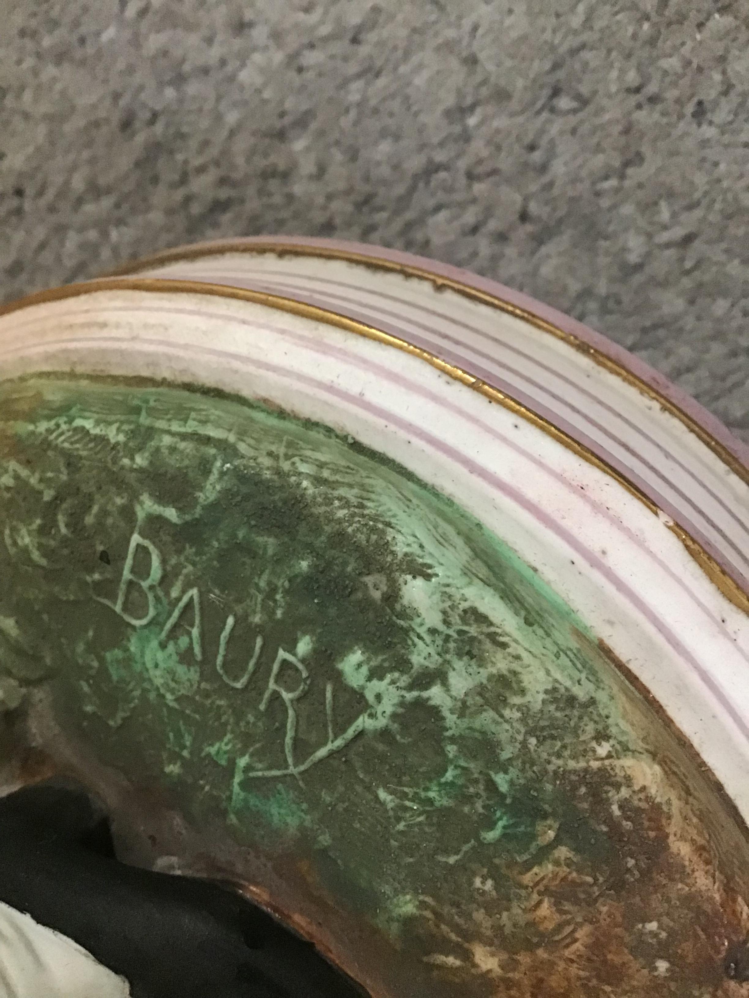 The figure is standing on a pedestal with green, yellow and brown grass carved into it, and it bears a clear stamp upon the pedestal which reads “Baury”. The underside of the pedestal is marked with numbers that read either “71/14”, or “7/1/4” but it is unclear. There is also what appears to be either a “26” or a “95” carved in next to it. In red ink the numbers “208” have been marked clearly above the carved markings below.