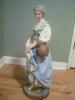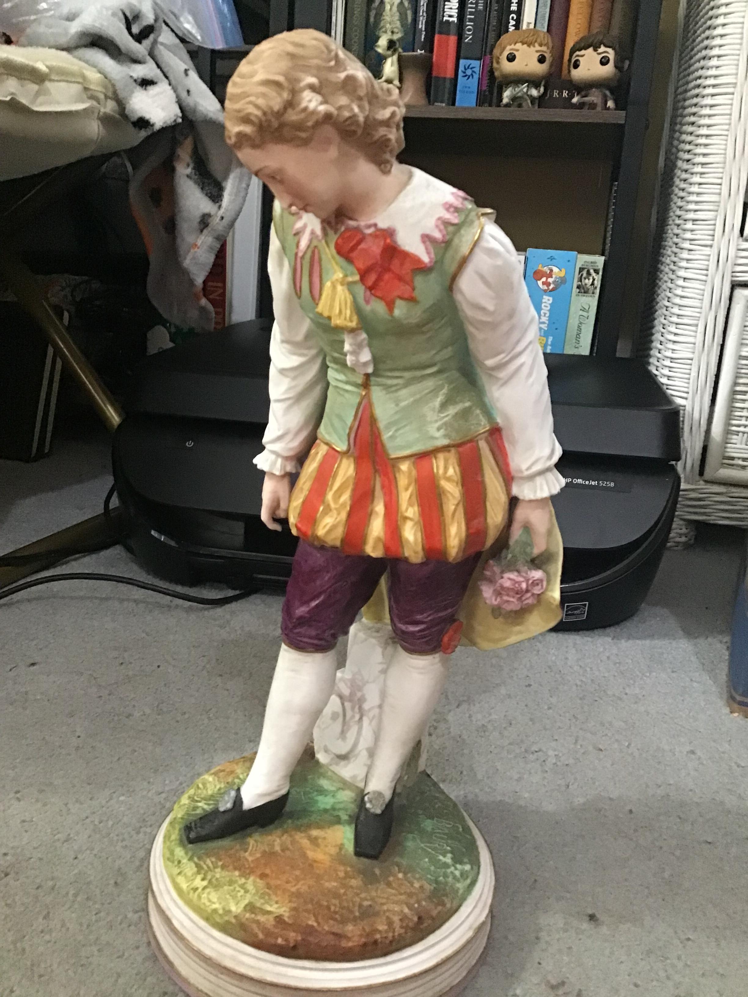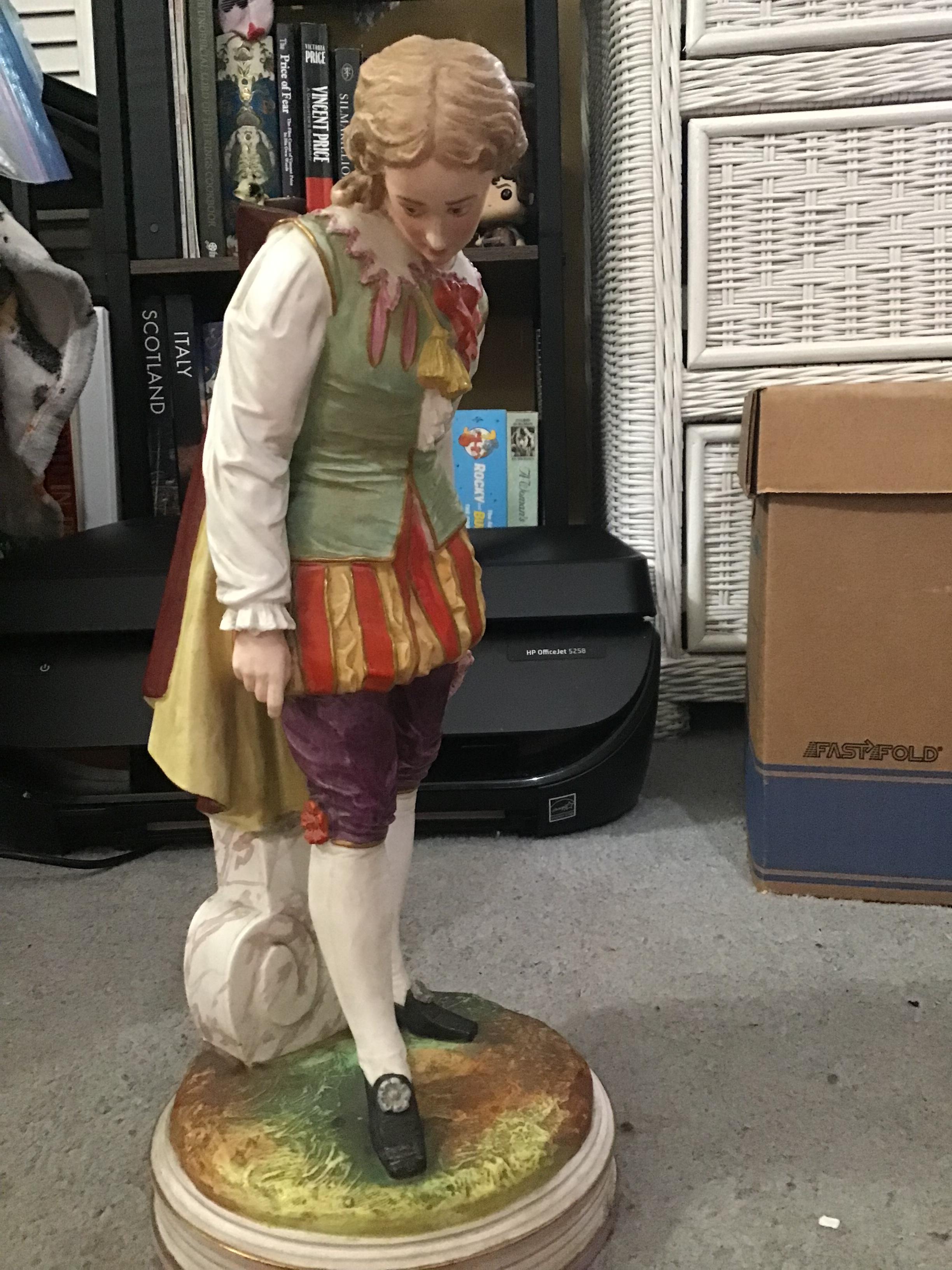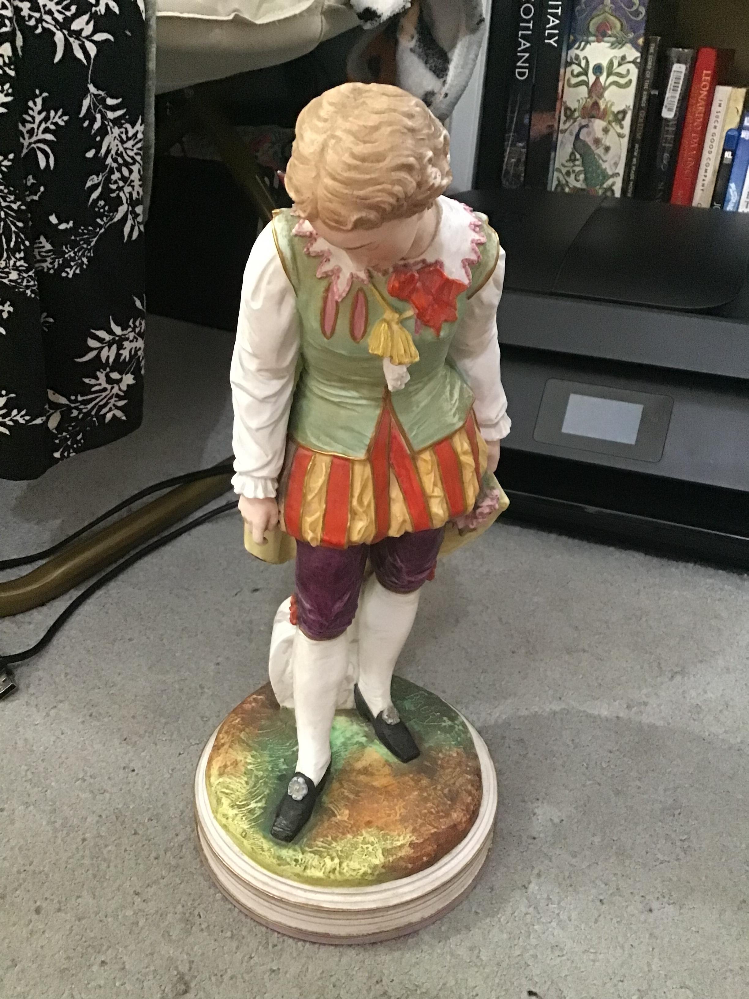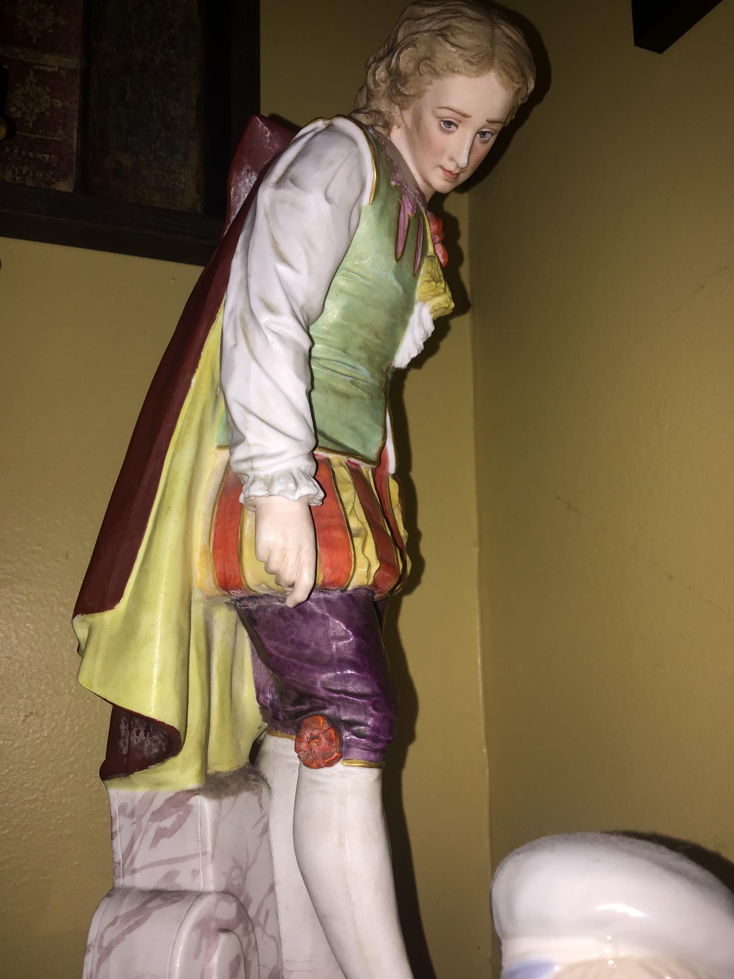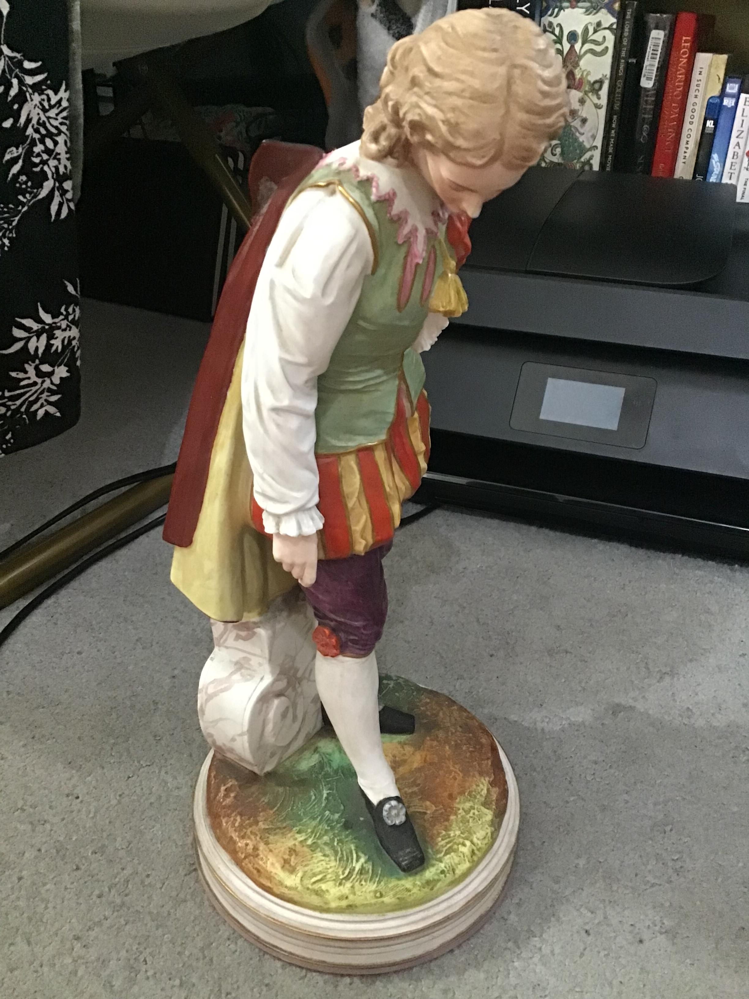 The statuette is 13 inches tall, and has a melancholy air about it’s body language. The head and face are turned to the statuette’s right, and is facing downward with a pensive expression. There do not appear to be any mold marks that would indicate this is a reproduction. The ceramic material appears to be bisque porcelain, and the figure does not have any sheen to its paint.