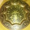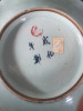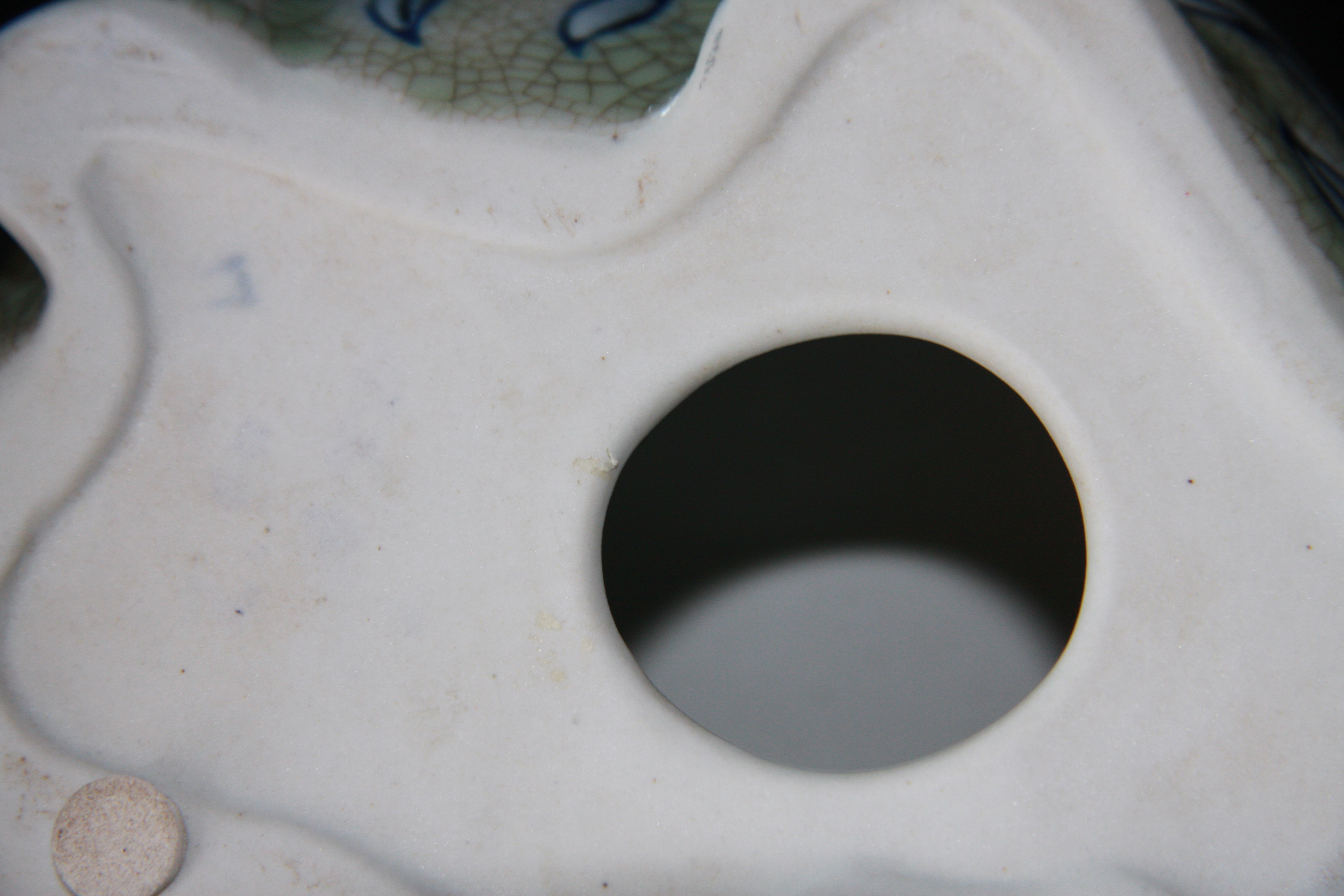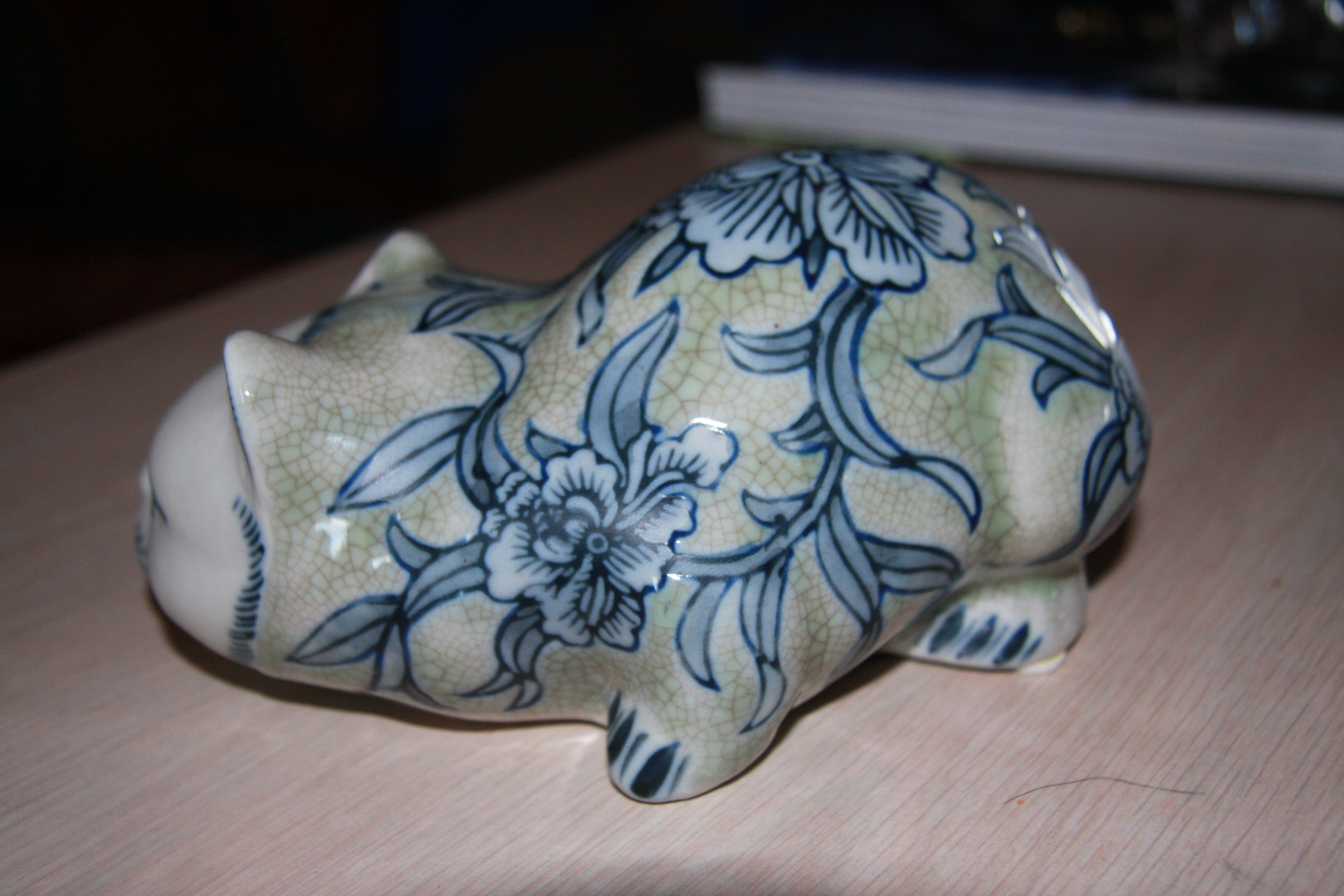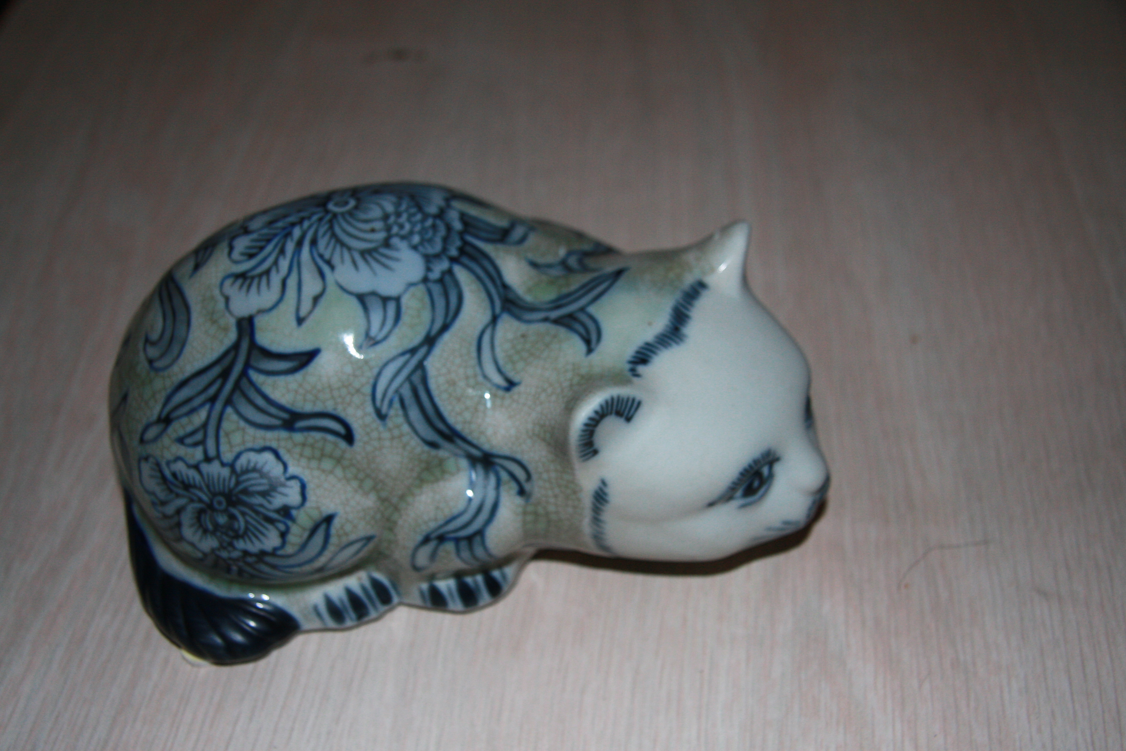 Porcelain or ceramic cat partially glazed posed in a laying down position with a floral pattern on the back, legs,while the tail is navy blue.Light-greenish base colour. Face is not glazed with human-like eyes. On the botttom there is hole and a faded blue mark on the bottom.