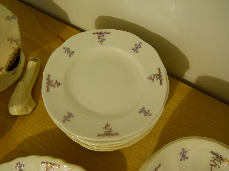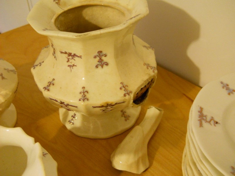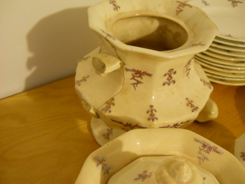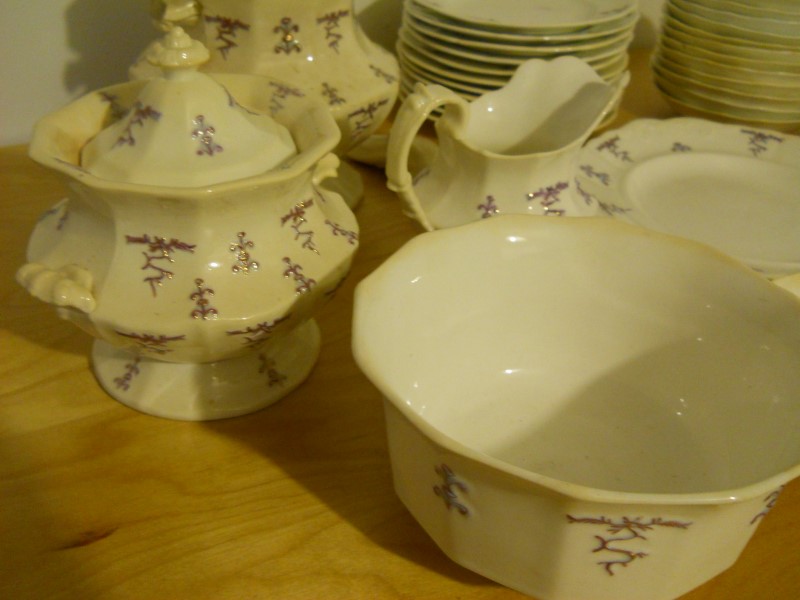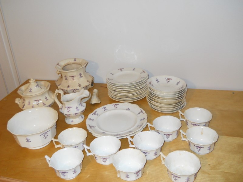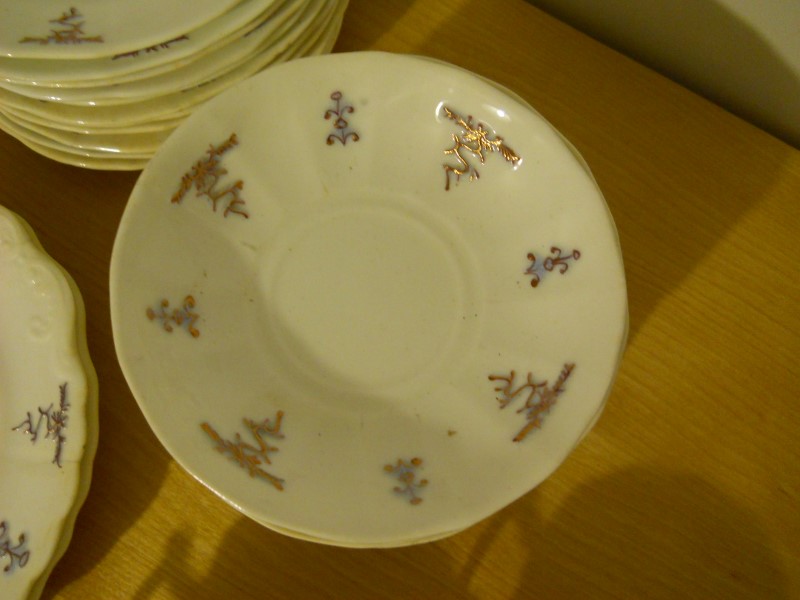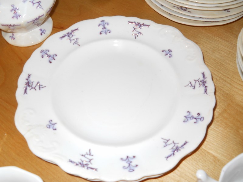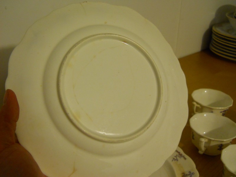 The dishes are aged considerably, granted I am no expert. Most of the pieces are crazed, some cracked. When held up to a light, you can see through the cake plates and saucers. The design is raised, a light purple color then, looks to be hand painted gold lines along the design.