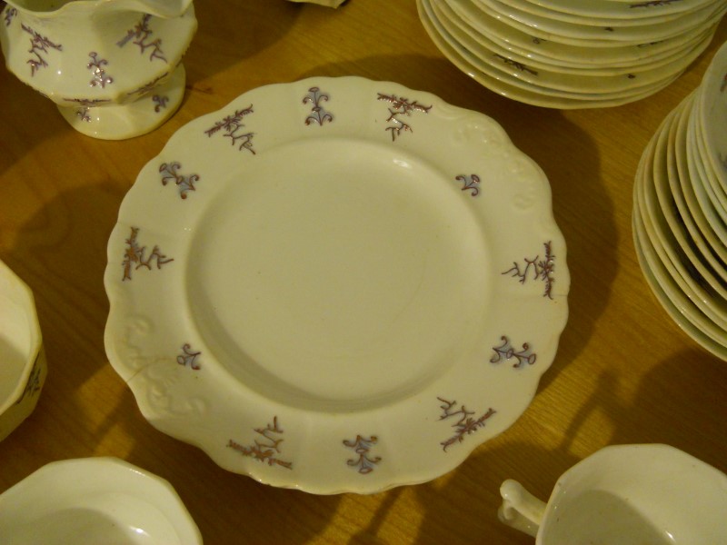 I have an incomplete set of antique dishes here. Includes: 2 -8 3/4" Cake plates, 11 -7" plates, 12 -5 5/8" saucers (bowl shape - about an inch deep), 9 teacups, 1 - 6 5/8" bowl (about 3.5" deep), 1 cream pitcher, 1 sugar bowl with lid, 1 tea pot without the lid - broken spout and handle.