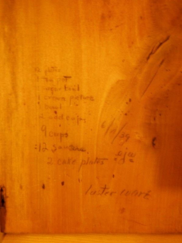 The set was packed in a wooden box with a list of pieces and a date written on the inside cover. The list states some pieces that are missing though, 1 plate and the 2 odd cups are missing. All pieces are unmarked. I believe this set belonged to my husband's great grandmother, Flora S. Woodruff from Washington, CT. The initials E.J.W. are also written on the box - This may be my husband's Grandmother Ellen Jane Woodruff.