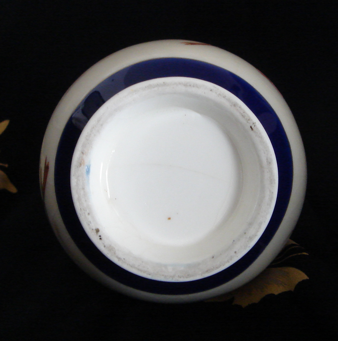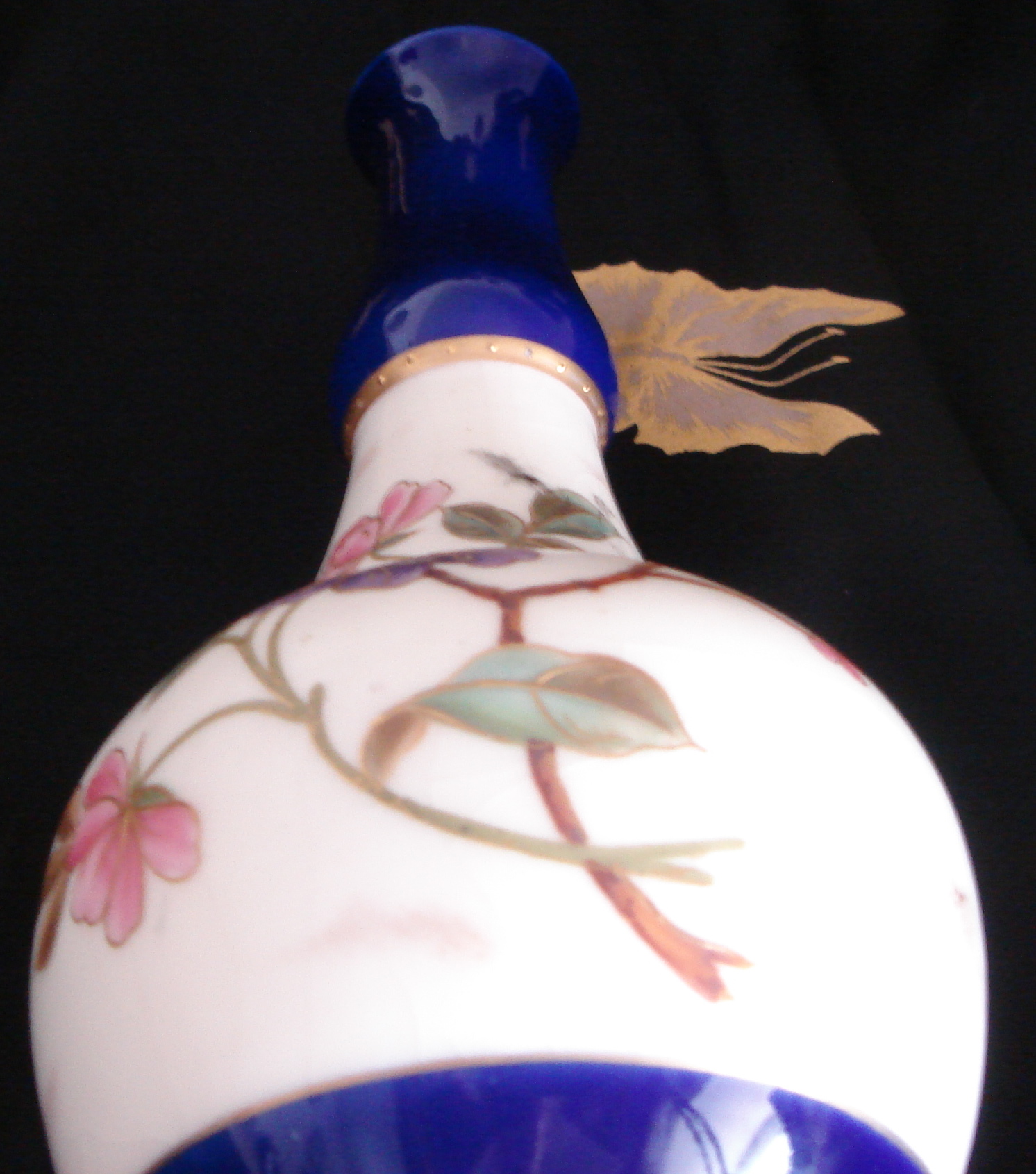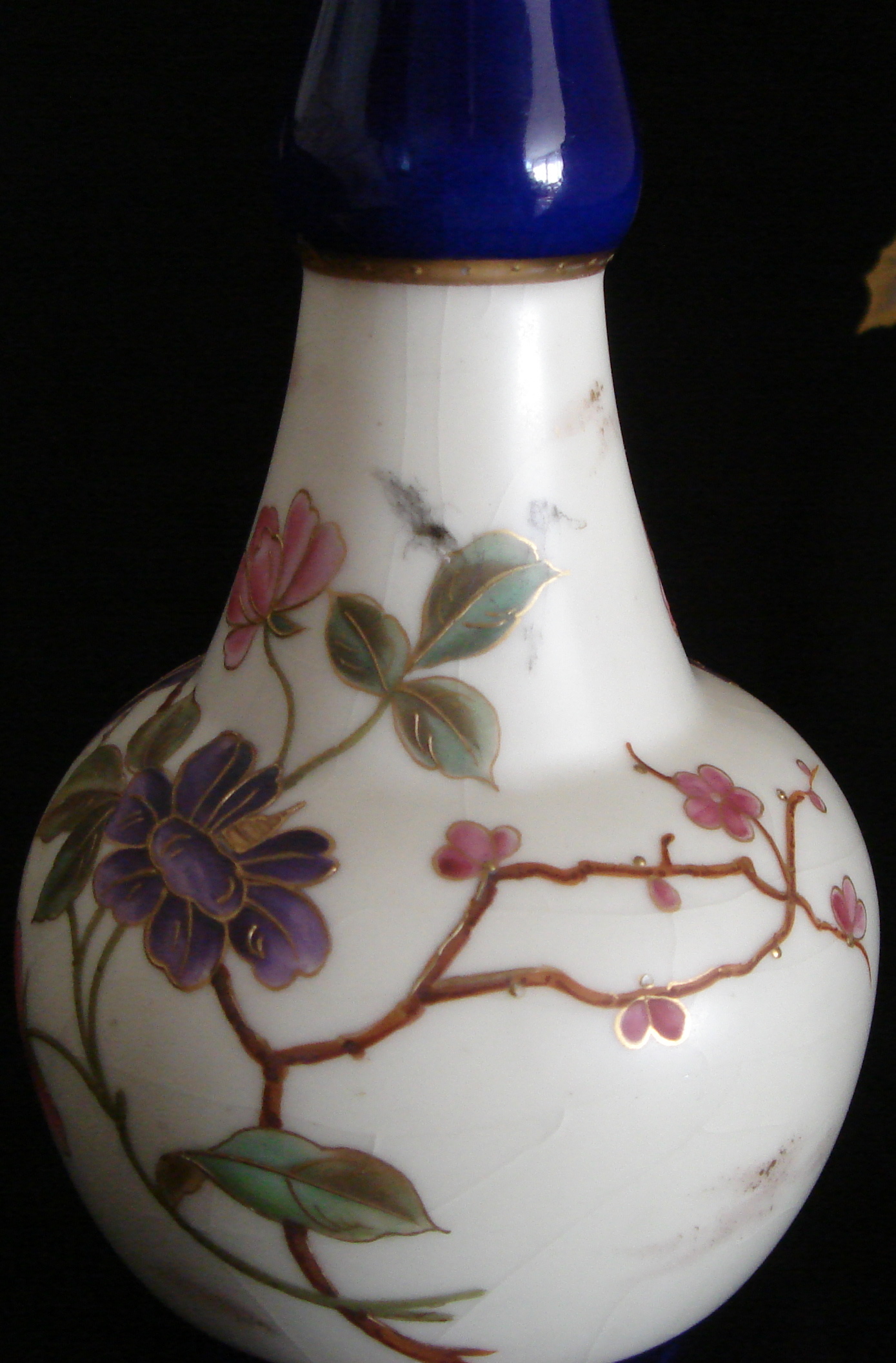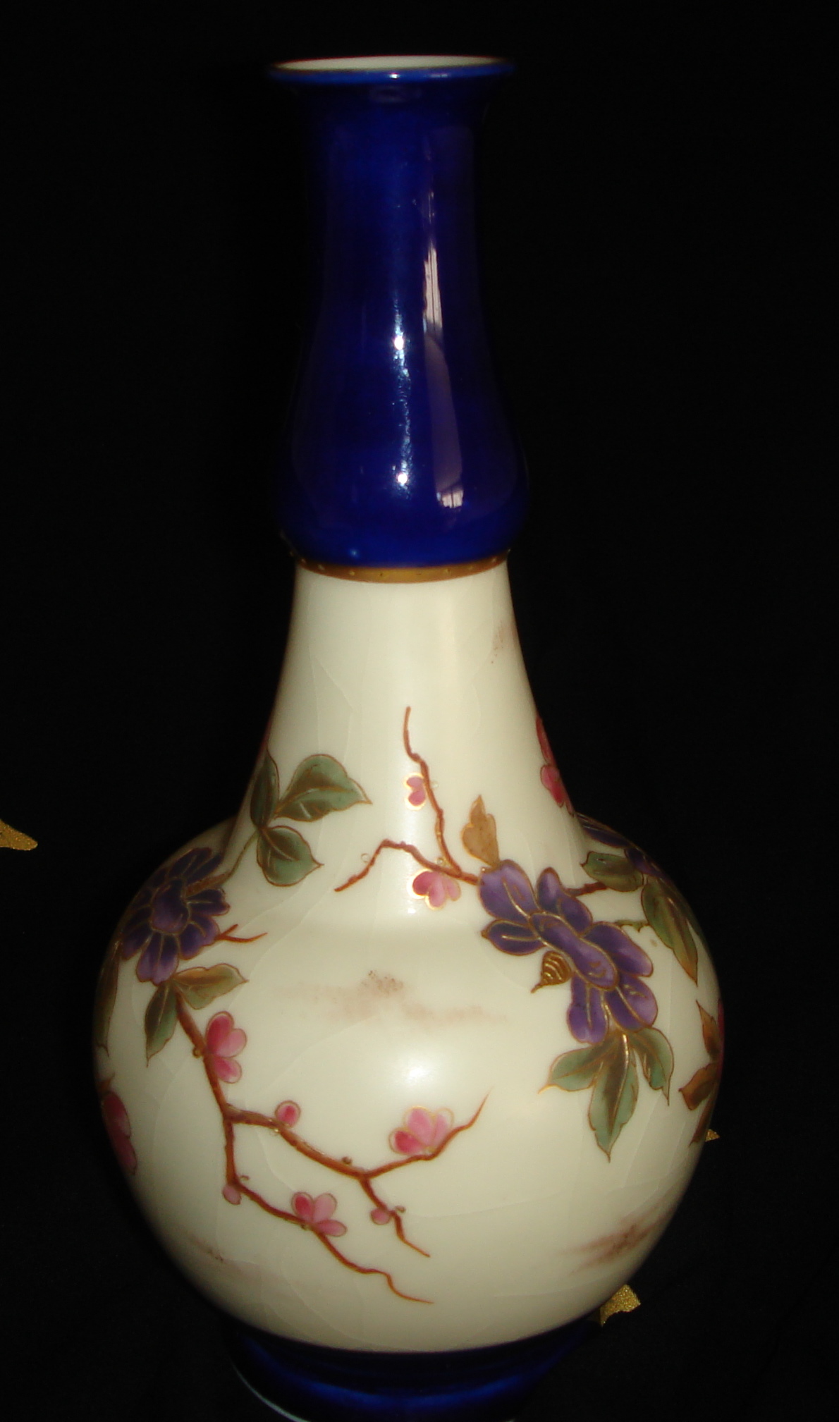 Re: unmarked hand painted cream porcelain and cobalt vase.
