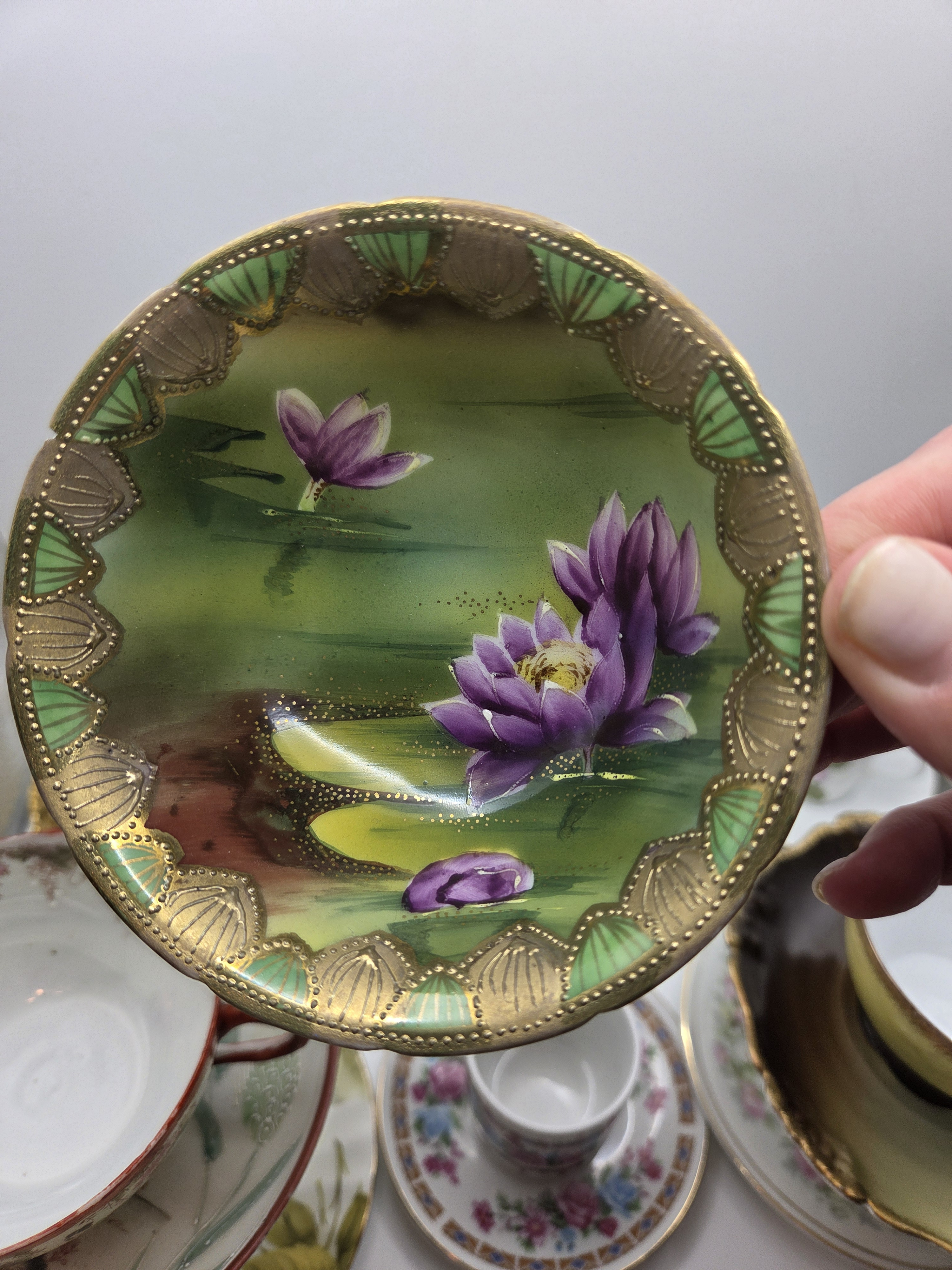 Physical Description: This teacup and saucer set features a delicate design of lily pads and flowers, accented with gold trim. The saucer has a scalloped edge and a vibrant green background with purple flowers. The teacup has a similar floral design and a gold rim. The dimensions are not specified, but typical teacup sizes range from 3 to 4 inches in height and 4 to 5 inches in diameter.