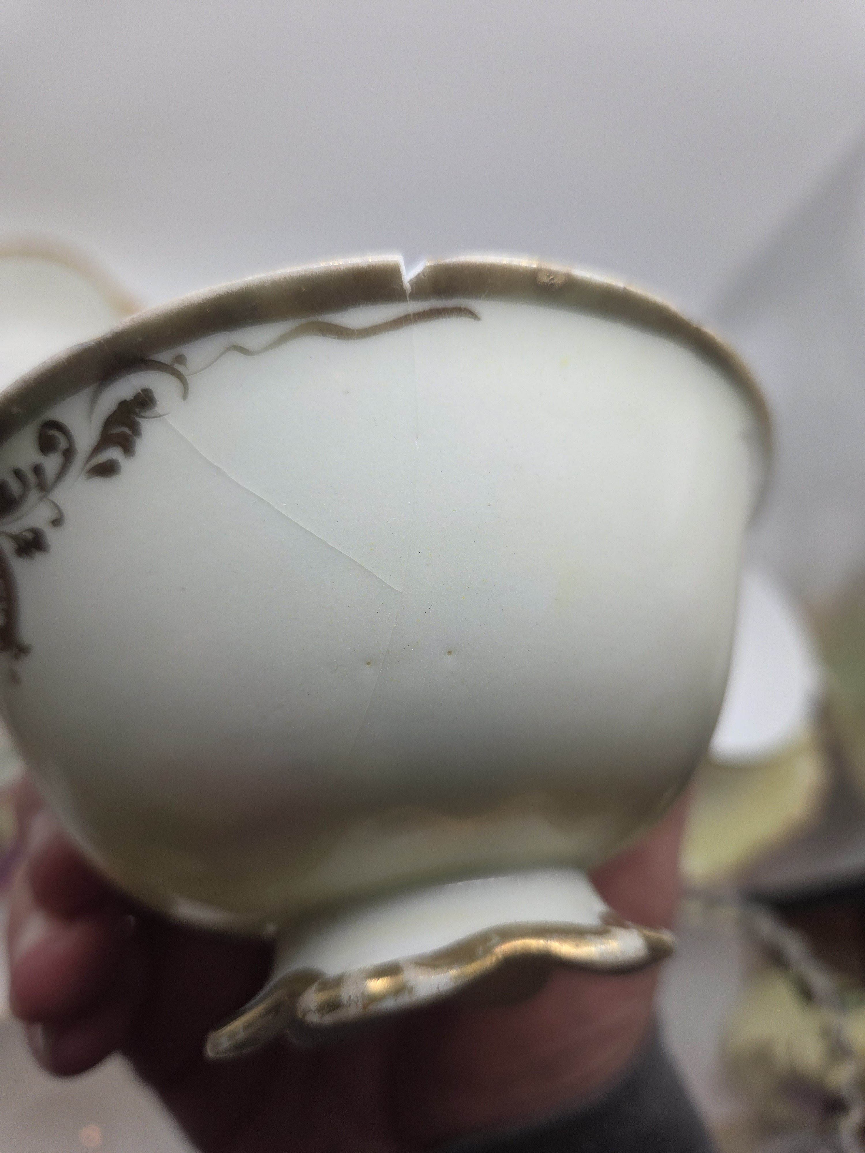 There is a small rim chip on the saucer and a noticeable crack on the teacup, which affects its overall aesthetic and value. These flaws reduce the collectible appeal.