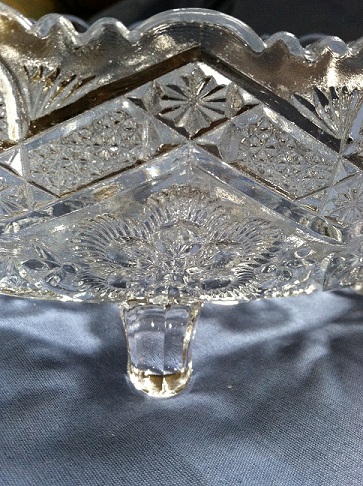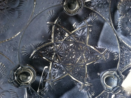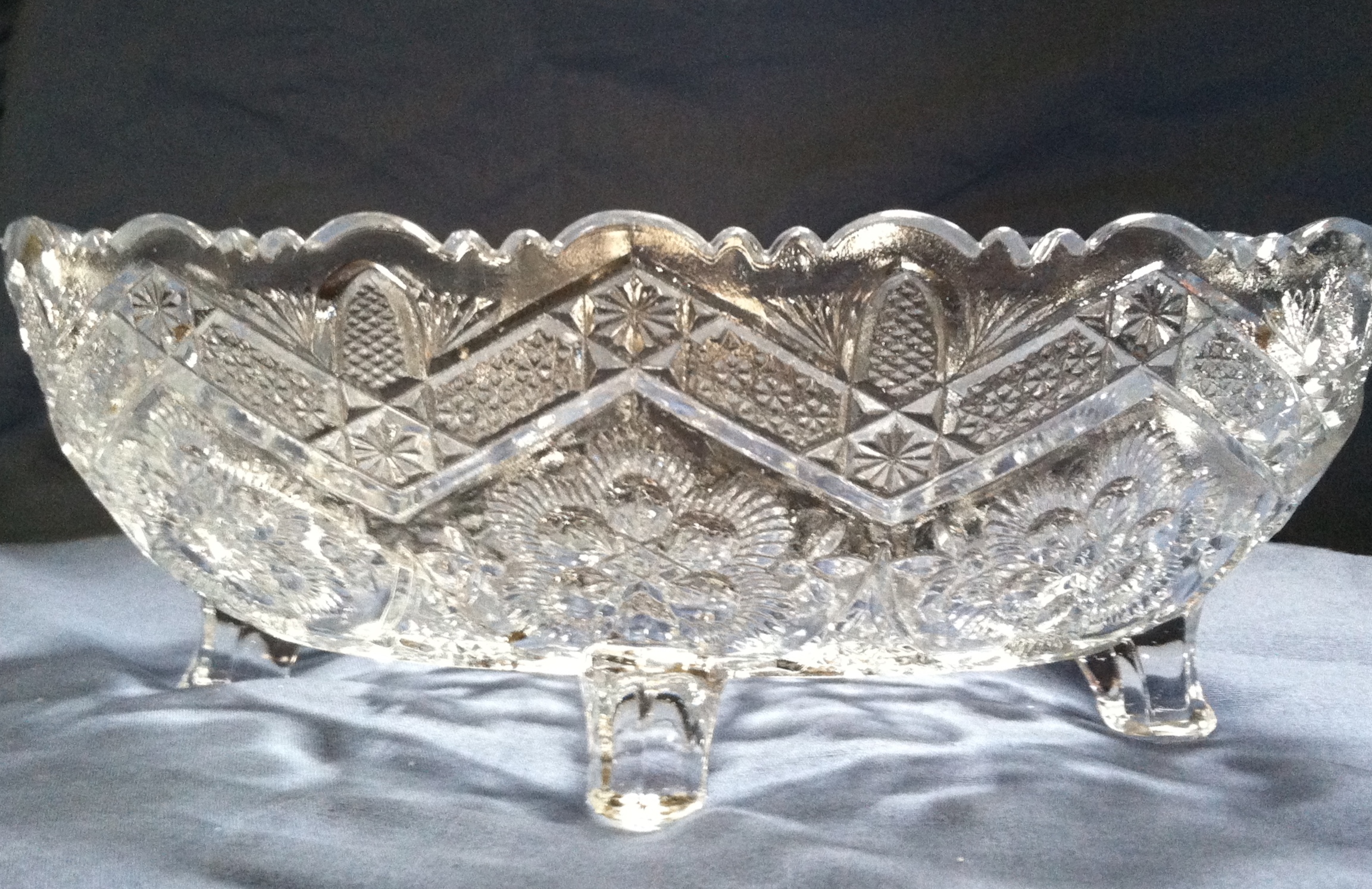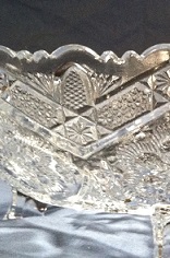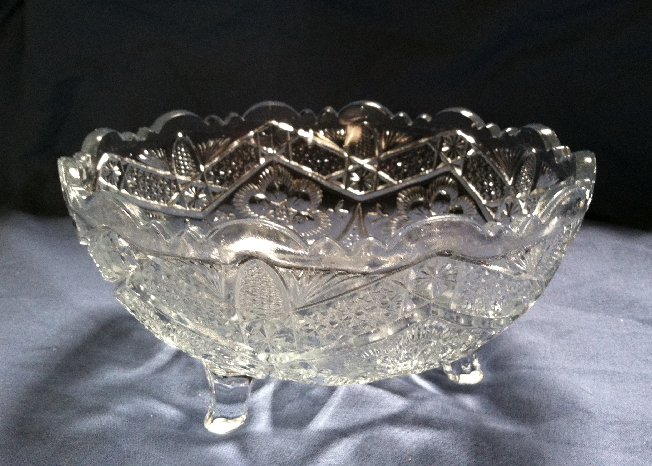 I have a set of, what I was told to be, lead crystal bowls- 2 serving bowls (I believe), one is round (approx. 6 inches in diameter), the other is oval (approx 8 inches long and 6 inches wide) and 5 smaller bowls (approx. 4 inches in diameter). Thick and heavy in weight. I'm not familiar with glass pattern lingo so my description probably isn't close but, the glass has a zig zag pattern band around the upper part of the bowls. In every other zag it looks like a pine cone. The zigs are flowers. Under the zig zag pattern there are large flowers with a star in the center that go around the bowls. In the very bottom of each bowl is another star. In the round bowl and 5 smaller bowls its a 6 pointed star with bursts around it. In the oval it is an 8 pointed star with bursts. I have photos I've uploaded of the bowls. In the pic of the oval bowl, you can see a crack that circles around. It was like that when given to me. Other than that, all pieces are perfect.