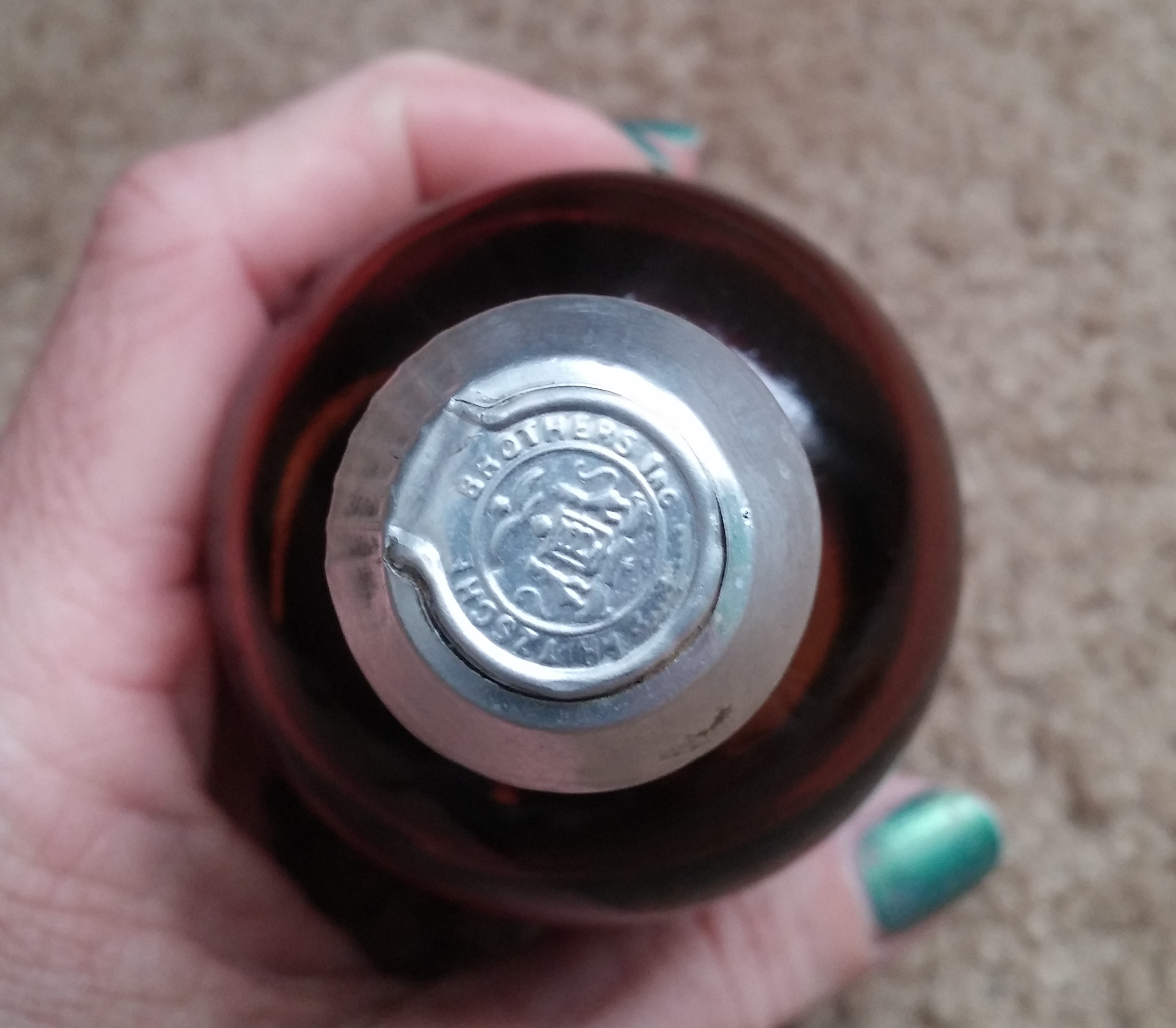I acquired this about 10 years ago at a yard sale. It's an unopened bottle of Fritzsche Brothers Mysore Oil of Sandalwood and it's in excellent condition. Not exactly sure on it's original content amount as it doesn't state on the bottle. Appoximately 5-7 ounces in it. It has the original metal crimped logo embossed top with cork under that. I know it dates between 1900-1930.
