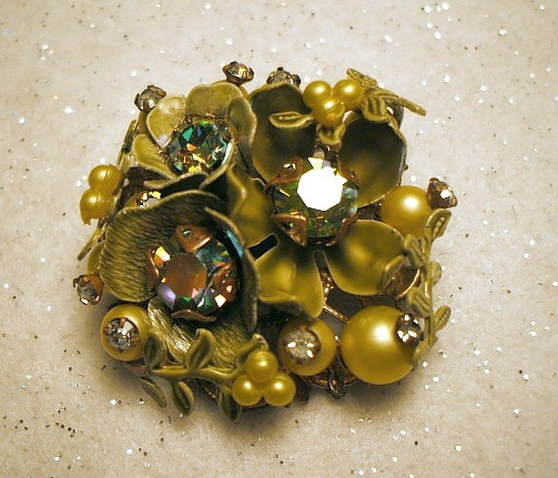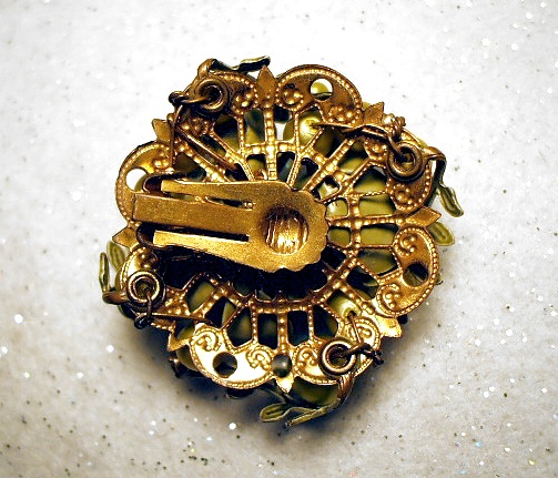Gold filigree back, faux pearls, prong set rhinestones, metal leaves