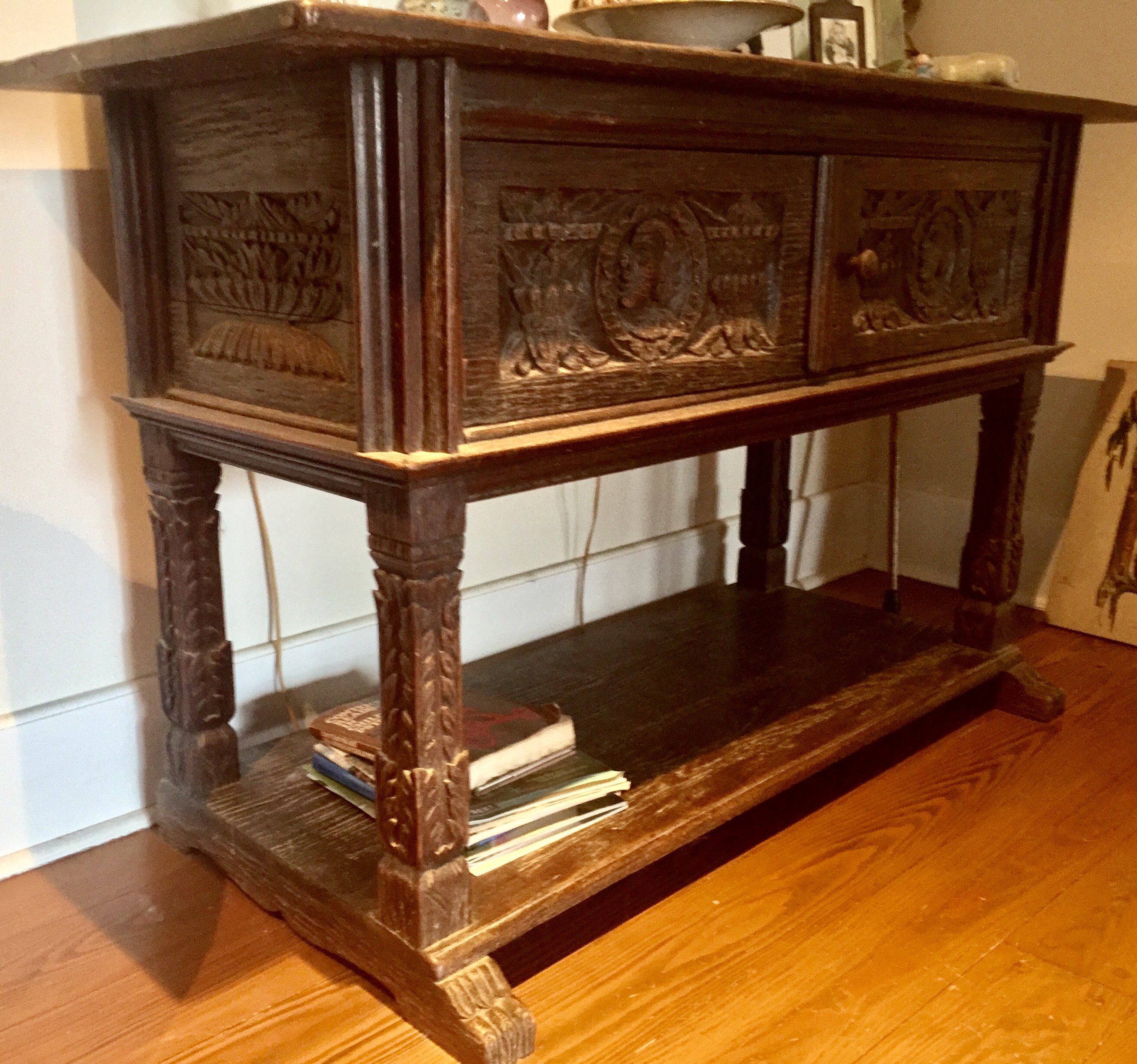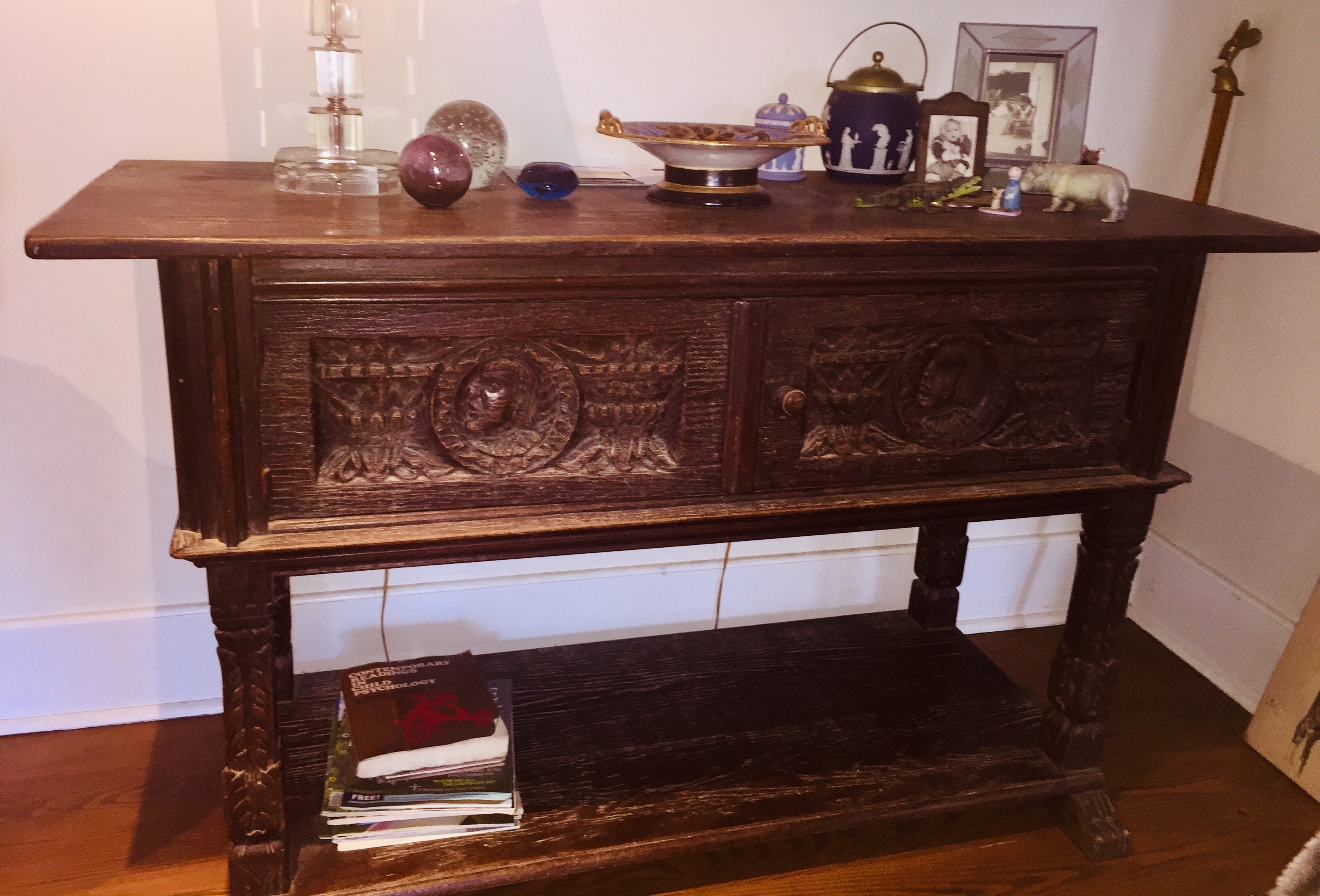 Old oak, deep-grained, buffet or side unit that was included in a house my parents bought in Bermuda in the 1970’s.The piece has unusual carvings of faces which almost look like South American or Incan faces.