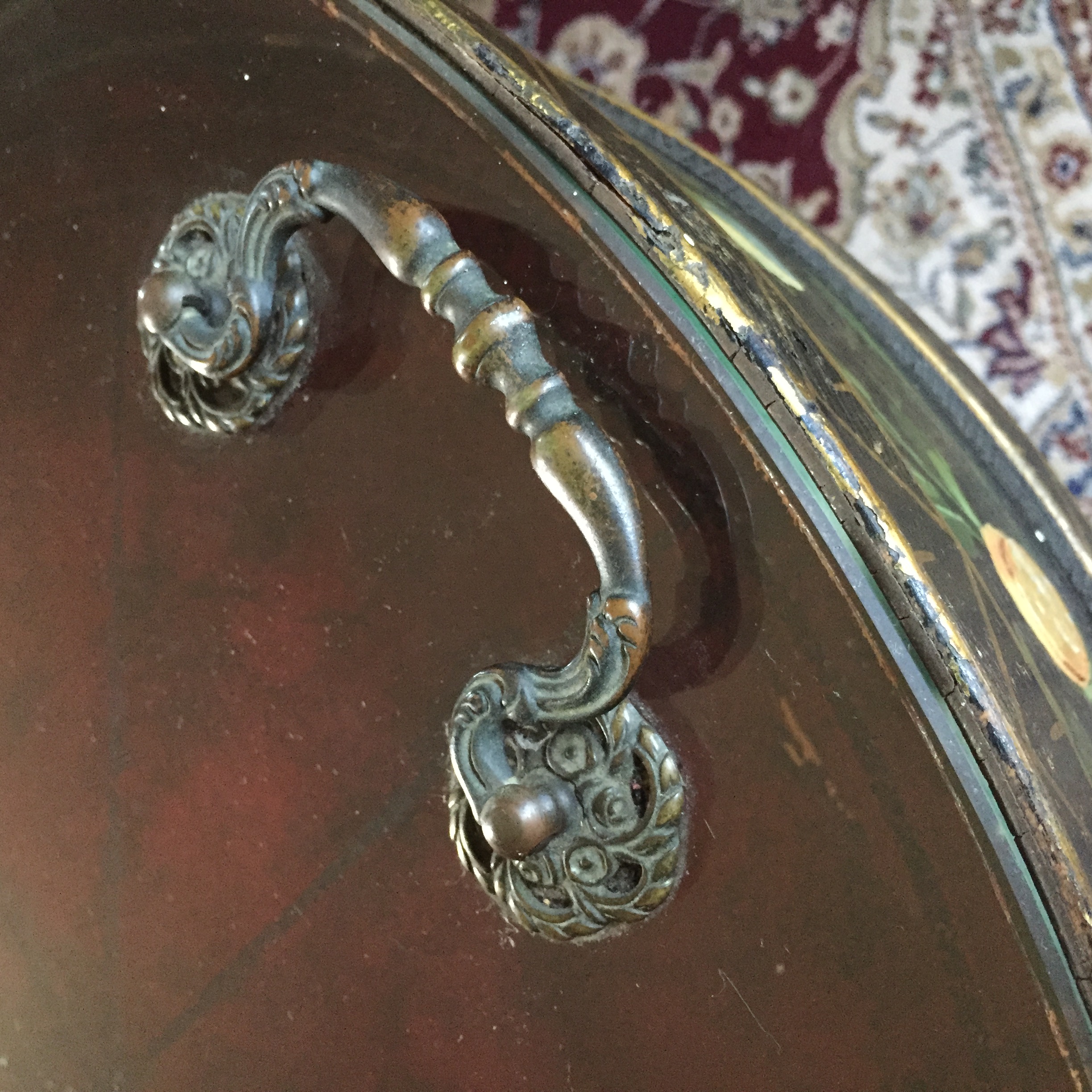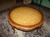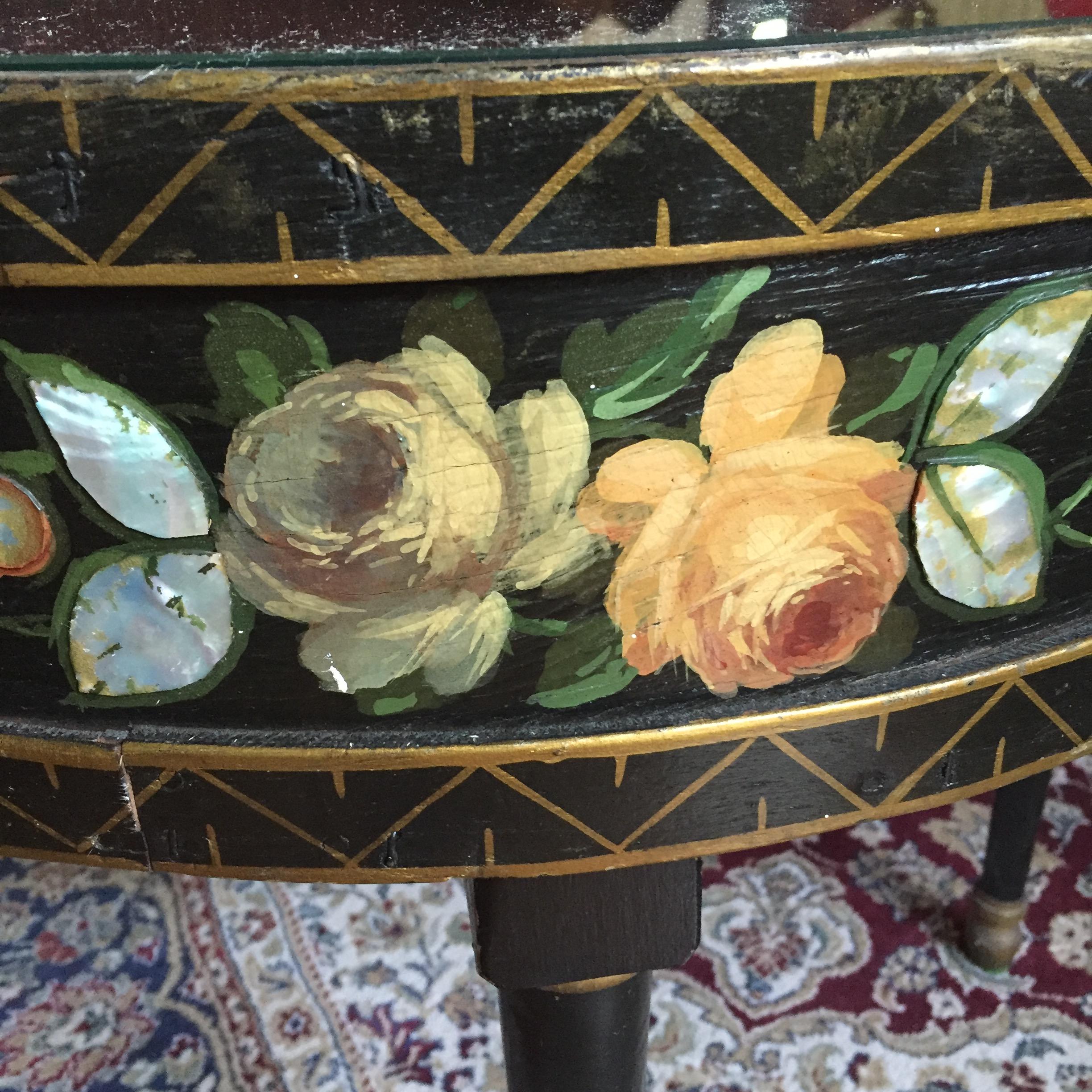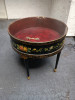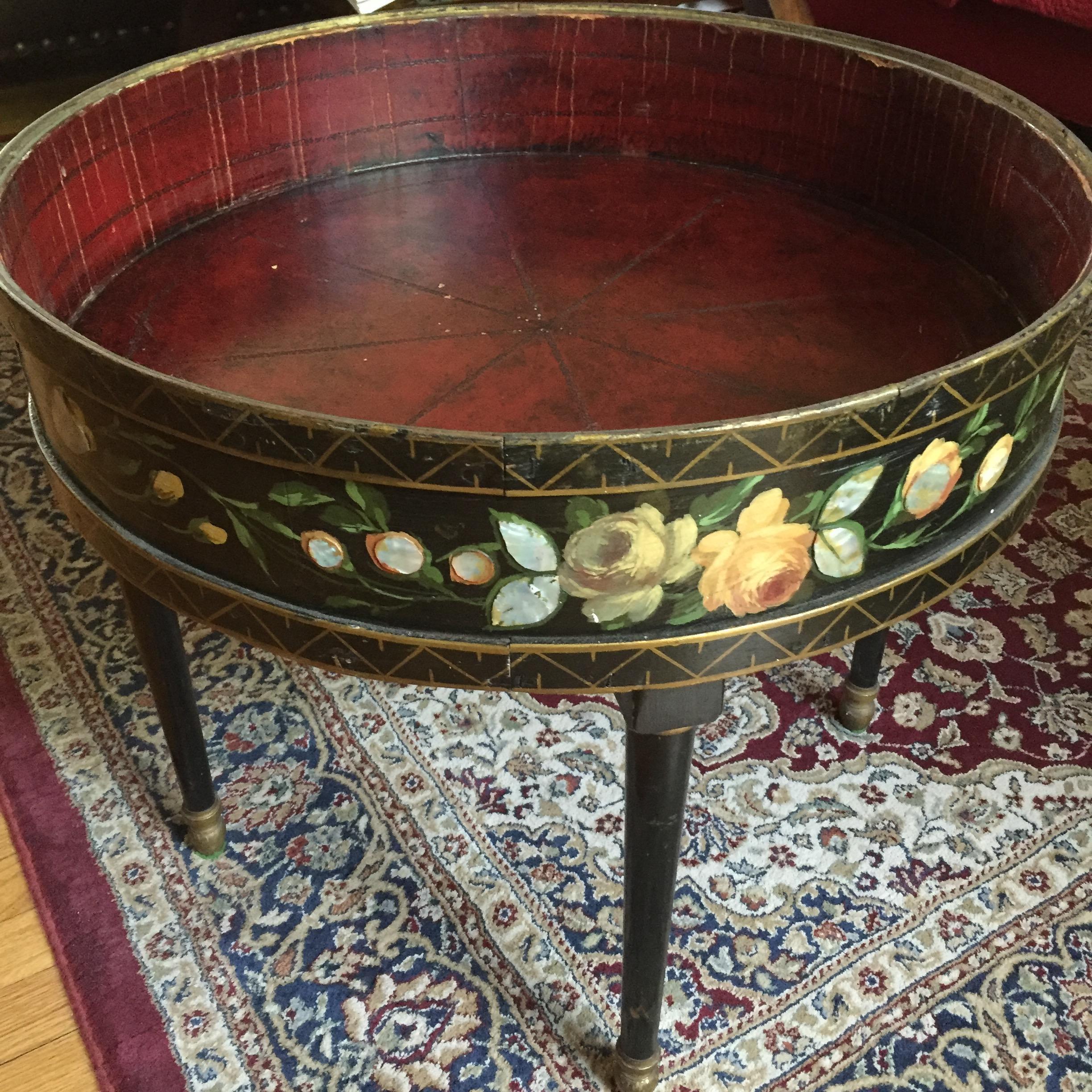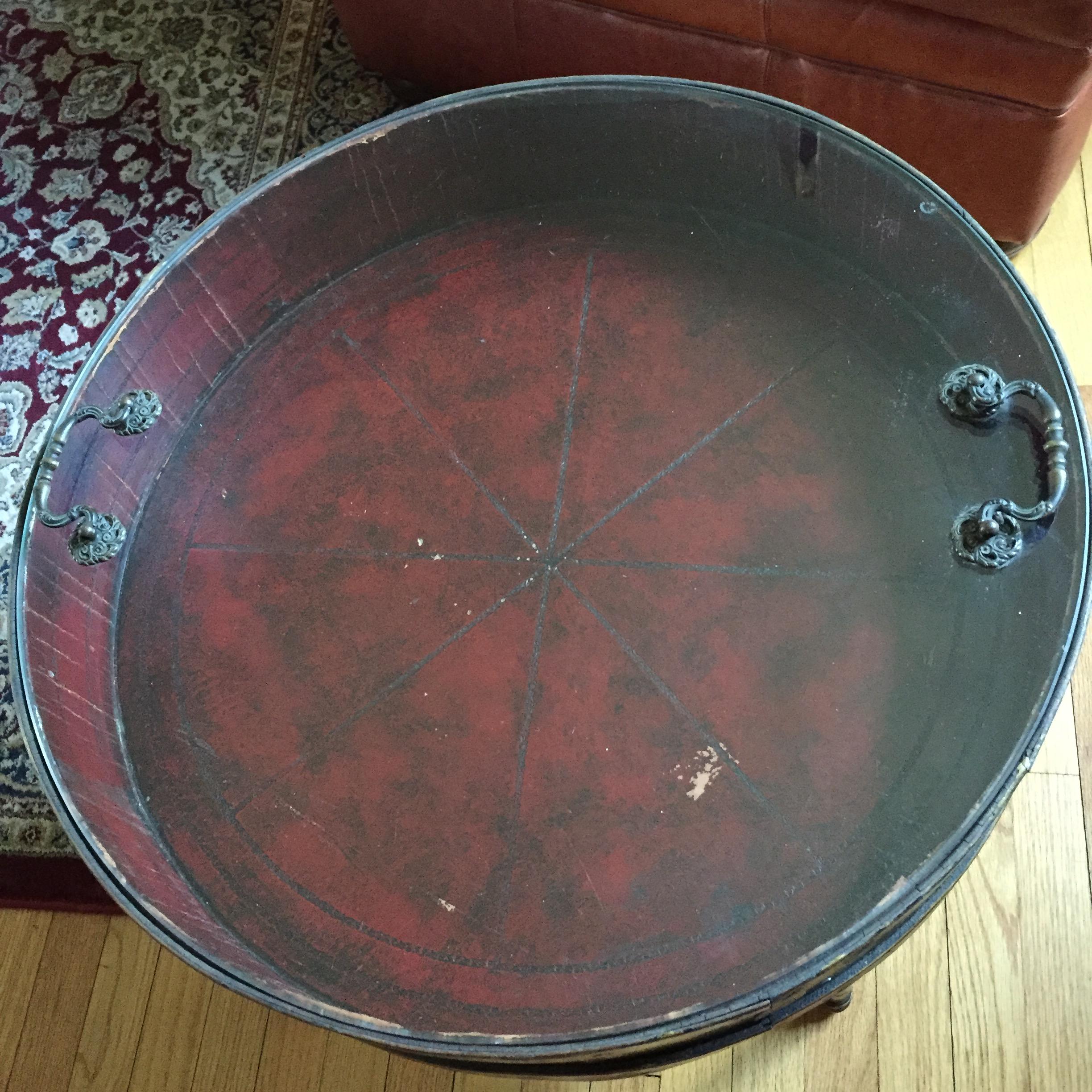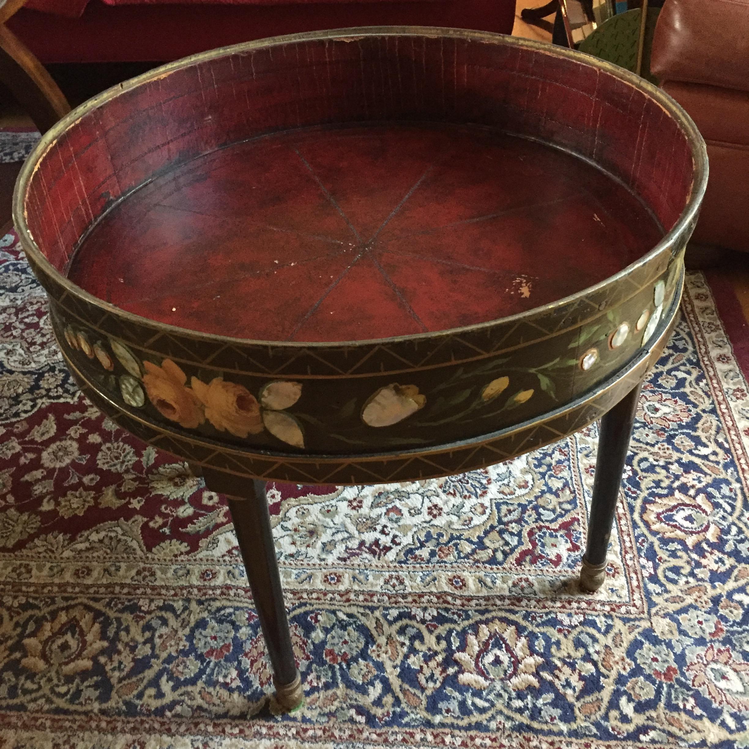 24 inch round, 4 legs, 21 inch high. 5 inch deep leather interior. Glass top lifts off and has 2 ornate metal handles. The outside is painted black, gold and has colored roses with mother of pearl inlay. Unusual piece I purchased 30 years ago and have never seen any similar tables.