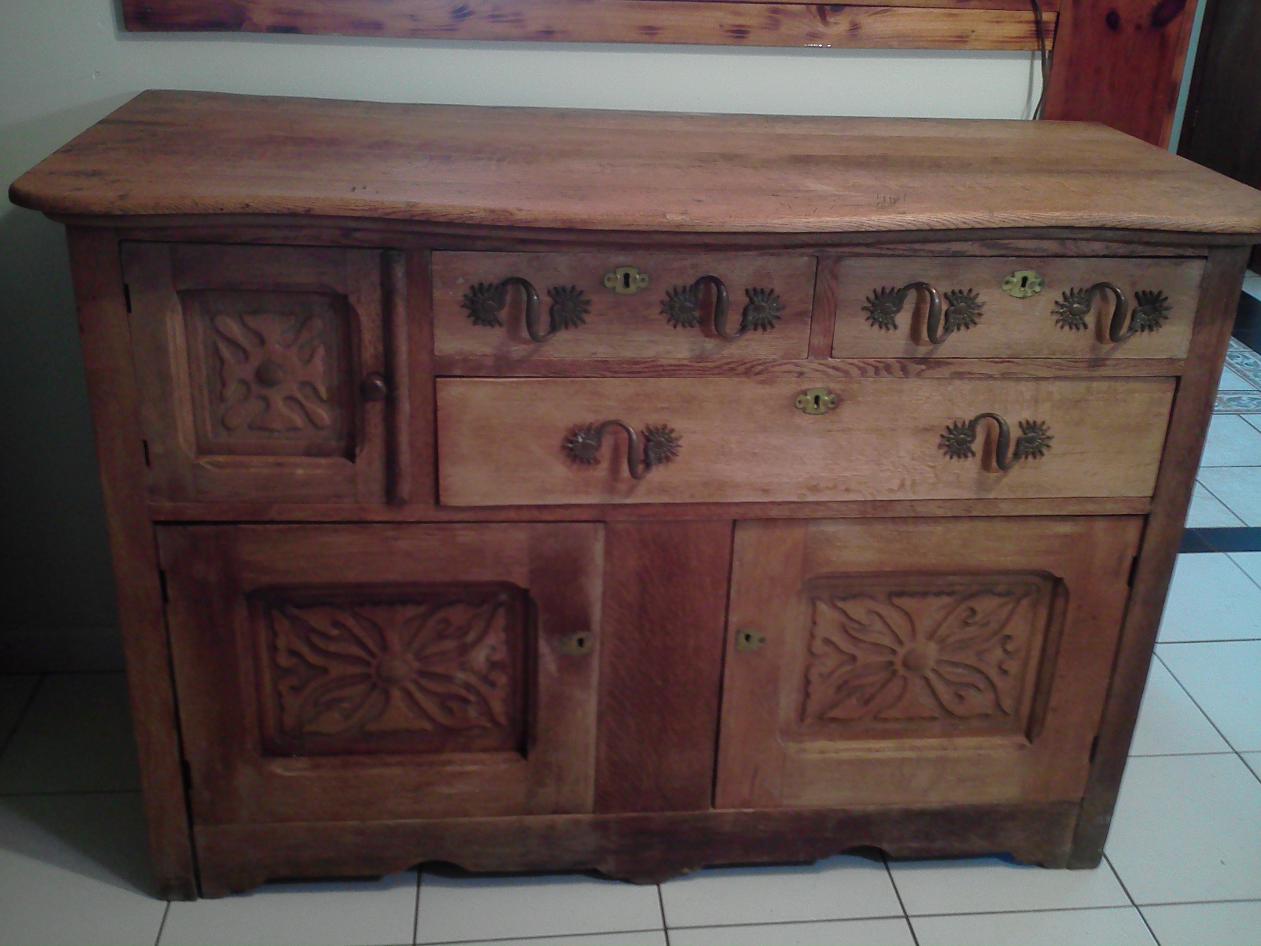 THIS GORGEOUS ANTIQUE TIGER OAK SIDEBOARD BUFFET WAS PAINTED WHITE BY SOMEBODY AND THE PAINT WAS REMOVED TO THE WOOD. IT IS GORGEOUS AND NEEDS TO BE REFINISHED. I HAVE NOT BEEN ABLE TO FIND ANYTHING SIMILAR AND I DO NOT KNOW EVEN ITS AGE. ANY INFORMATION I CAN GET WOULD BE TRULY APPRECIATED. IT HAS VERY UNUSUAL ONE OF A KIND HANDLES. ALL ORIGINAL.