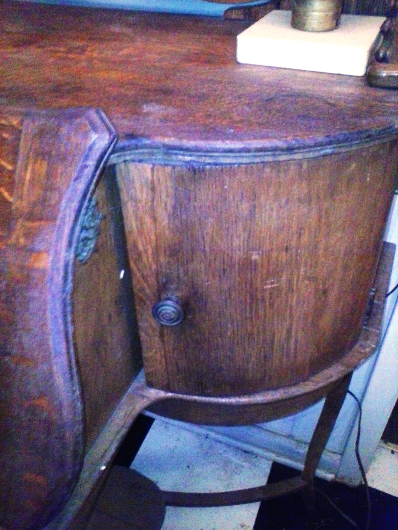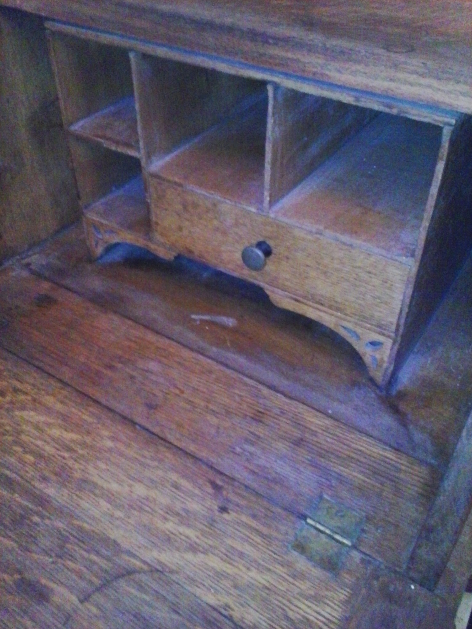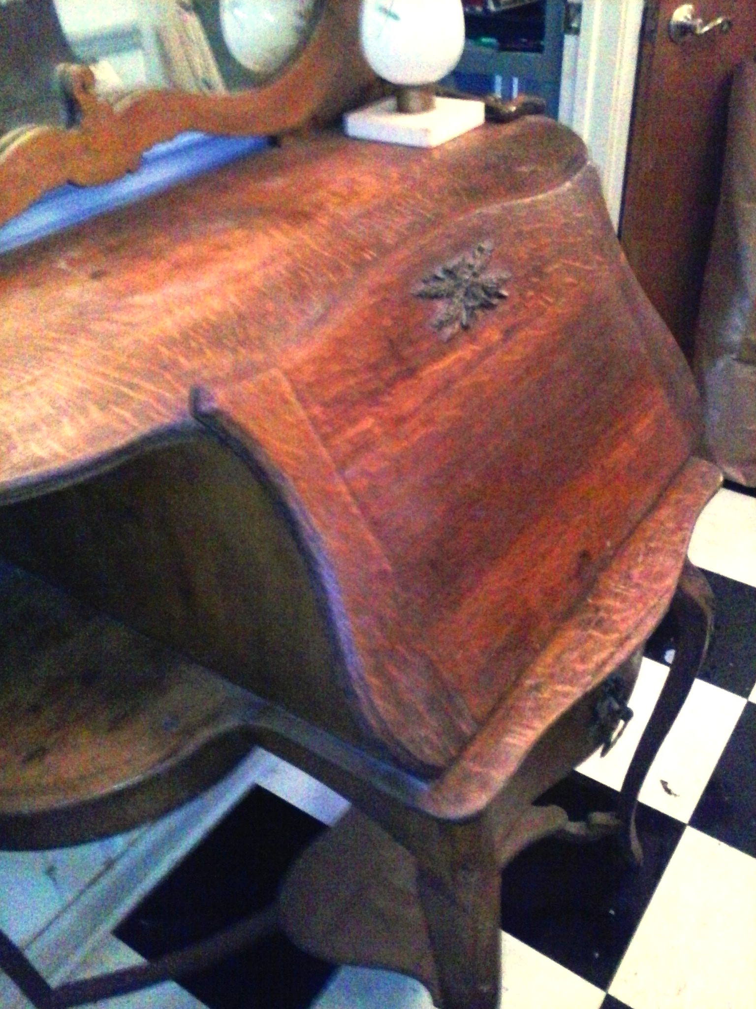 It dates from the turn of the 19th Century, similar desks can be found in old Montgomery-Ward catalogs Circa 1898. At the time they were sold as being in the "Fancy French" style a varaition on the 18th Century French Provincial style. Like most made during this period it's constructed of oak, we'd retail one like this for about $600.00.