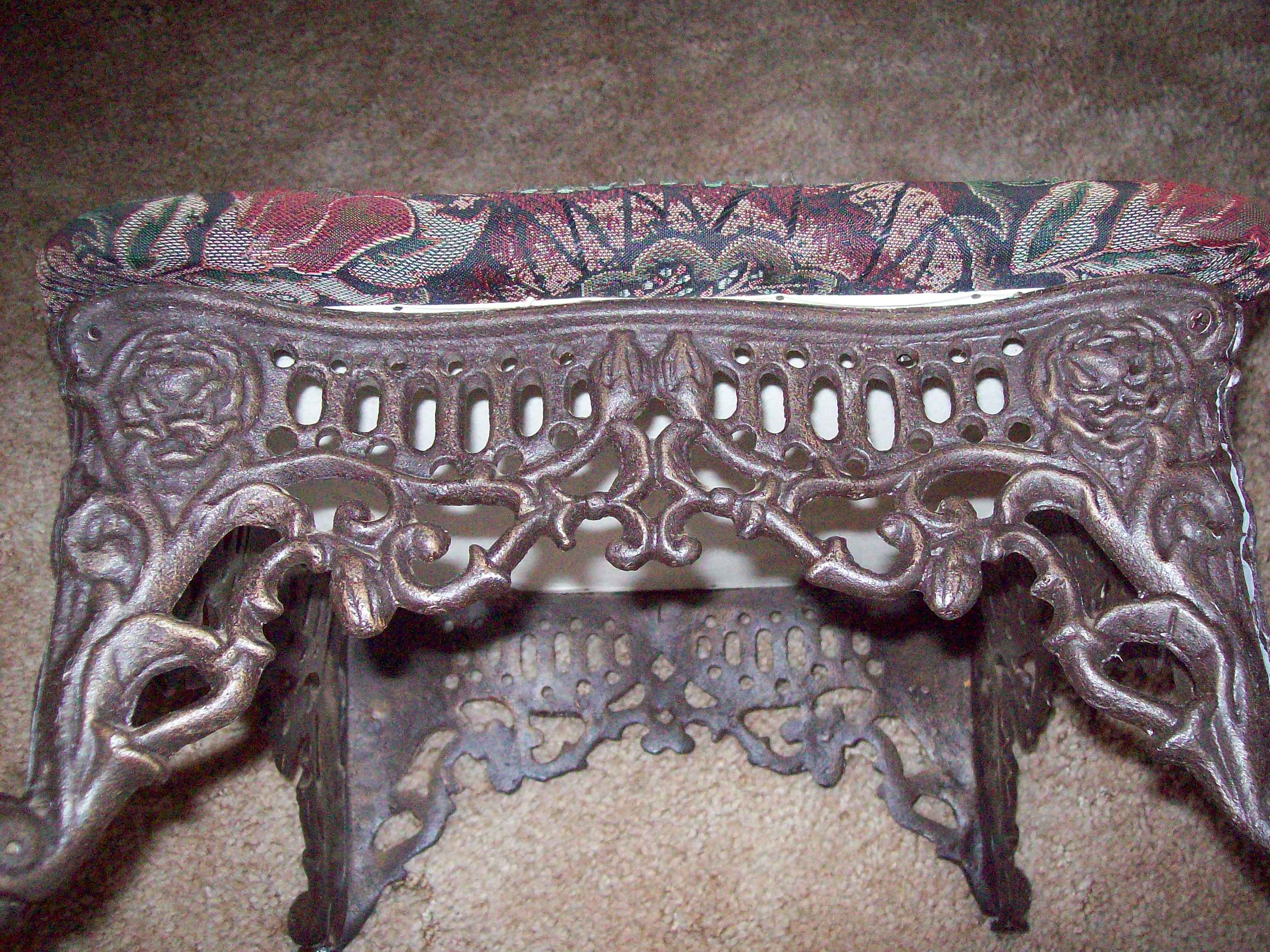 We bought this footstool at an estate sale for $5.00. Upon examination, we see that it seems to have the original wpholstery, in very good condition, and a linen piece under the top, secured by nails, which look to be quite old. The cast sides are secured with phillips machine screws, and one has been replaced. This is evident, due to it's excessive length, compared to the others. The seller was a 90 year old widow, and was not able to remember much about this stool.
