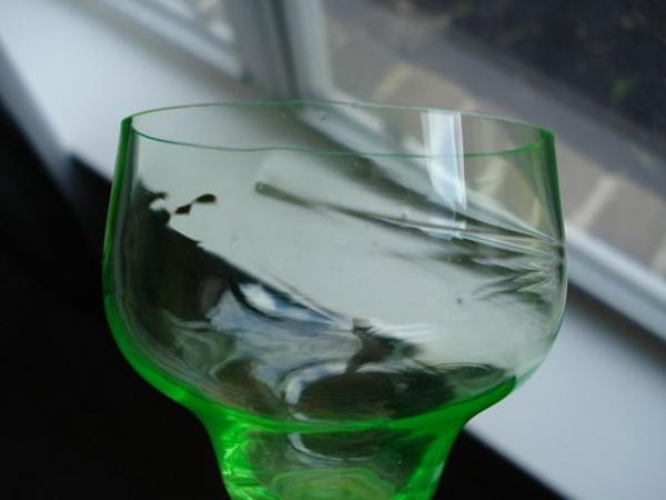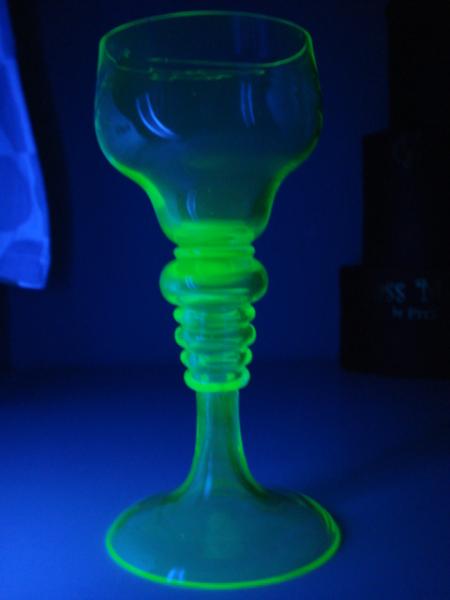 These were purchased from a collector many years ago. He had purchased these from a antiques dealer in Houston Texas. The glass glows under a black light, it is very thin type glass with swirl marks from the blowing process and some bubbles. The stem is hollow. I have 8 of them.