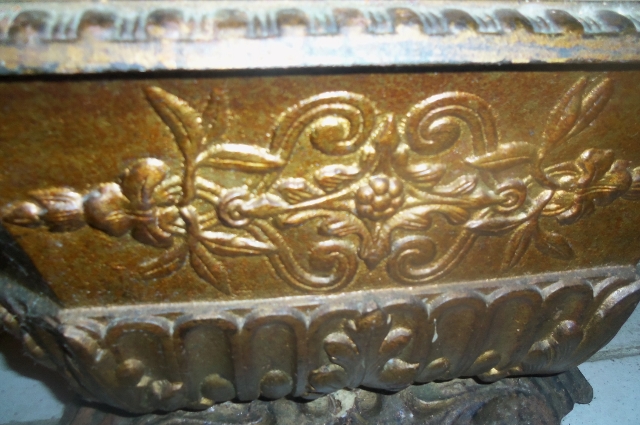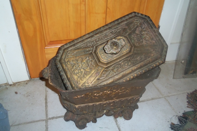 This I believe s a urn of some sort. My mother bought from a cafeteria in houston tx that she worked at when it was closing.  she paid 25.00 for it.  It was purchased from a castle in europe in the 1960"s.  My mother thinks it came from a castle in germany, not sure where in europe.  it is 18 inhes long 10 inches wide and 11 inches tall.  It weighs about 30 lbs.  I believe is made of iorn.  I am not sure.