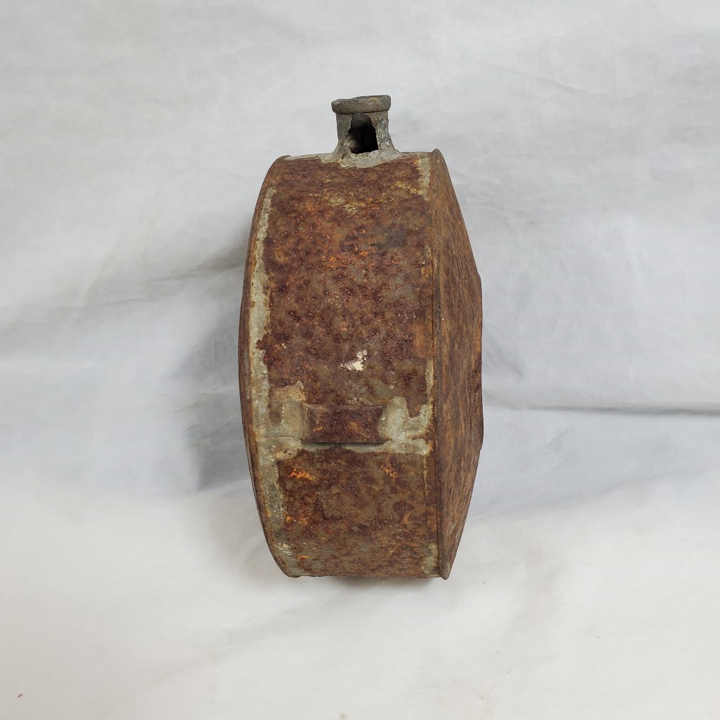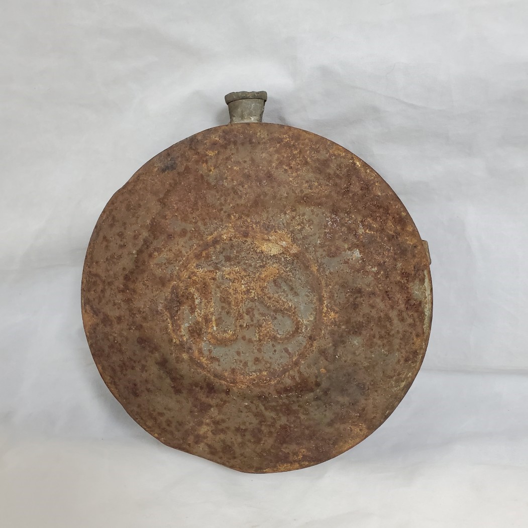 This canteen I believe is from 1848 US Mexican war or pre Civil War. There is damage on the neck, no strap or cork. Is rusty but no holes in the body other than the neck. The US is embossed on both sides and is a drum canteen not the tapered rounded ones.