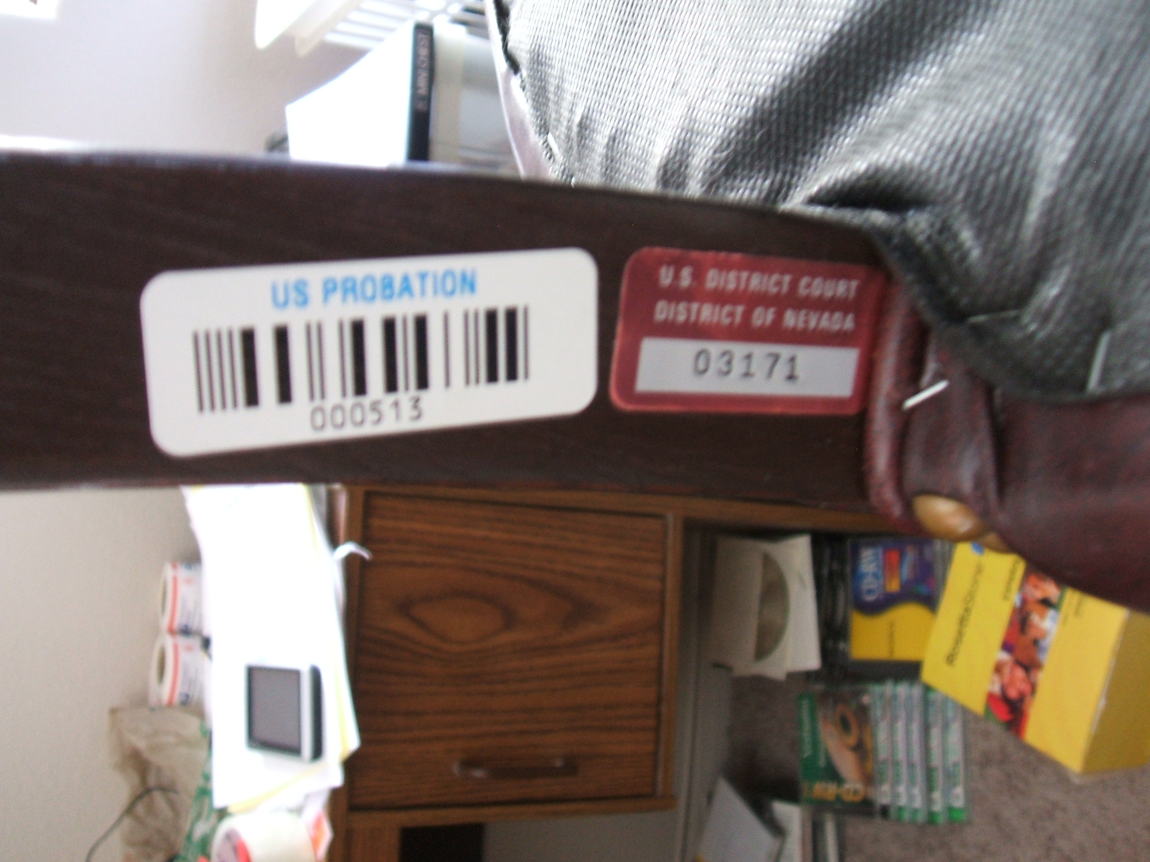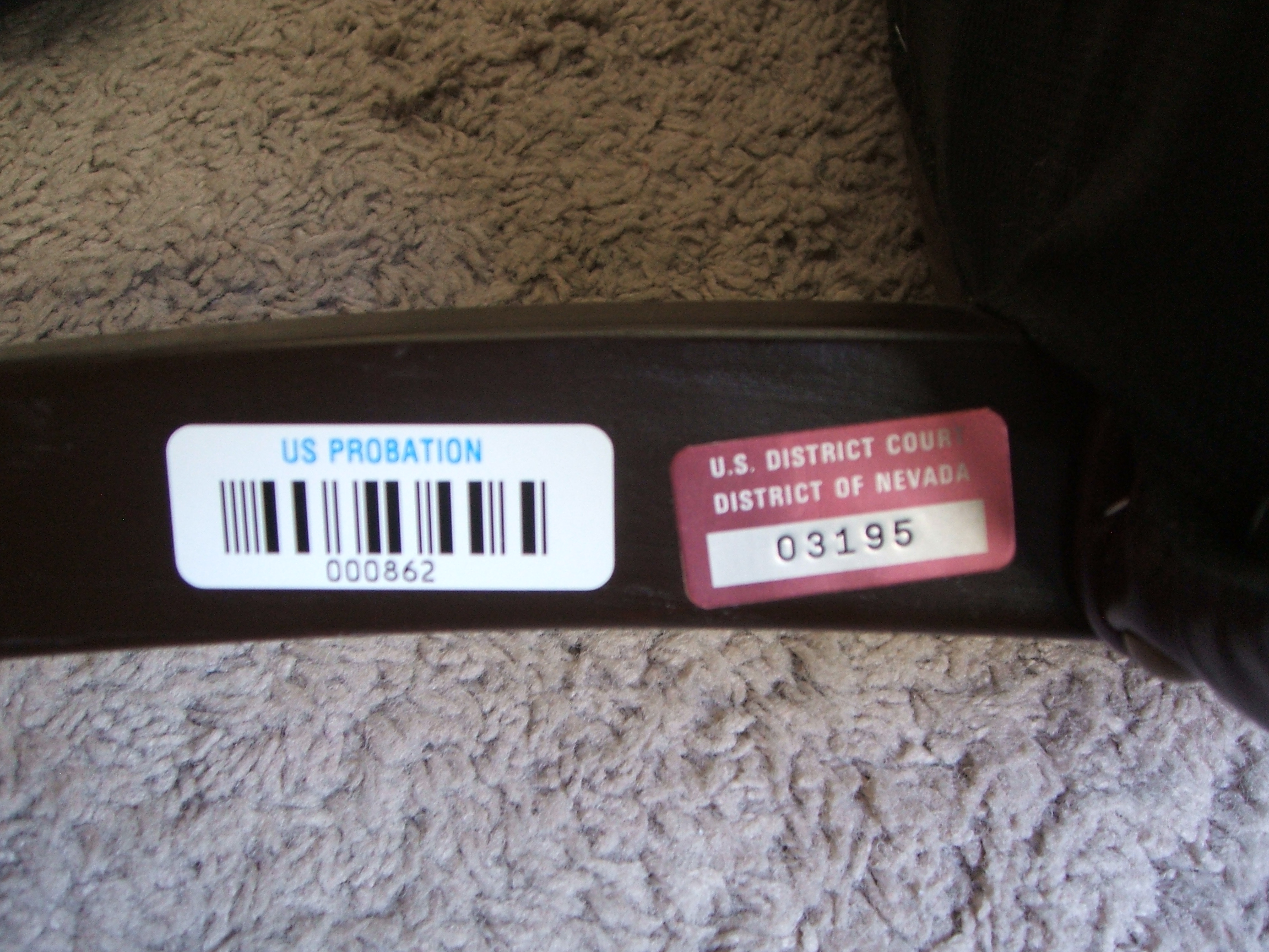 Distinguishing marks Plate on leg titled "U.S. District Court, District of Nevada"