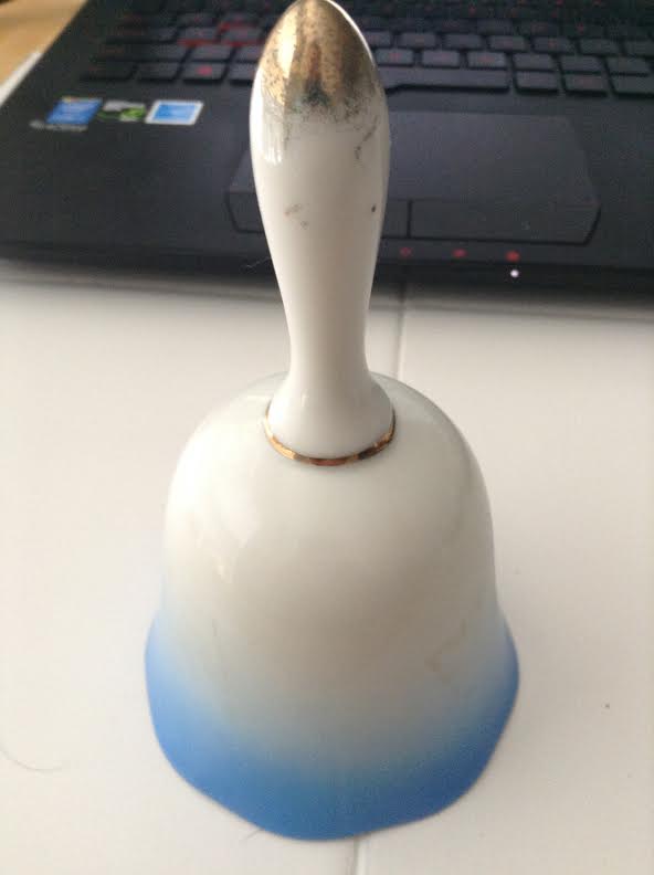 Antique U.S.S Alabam bell with seagull flying. It has a blue tint at the bottom of the bell and a gold tip on the handle.
