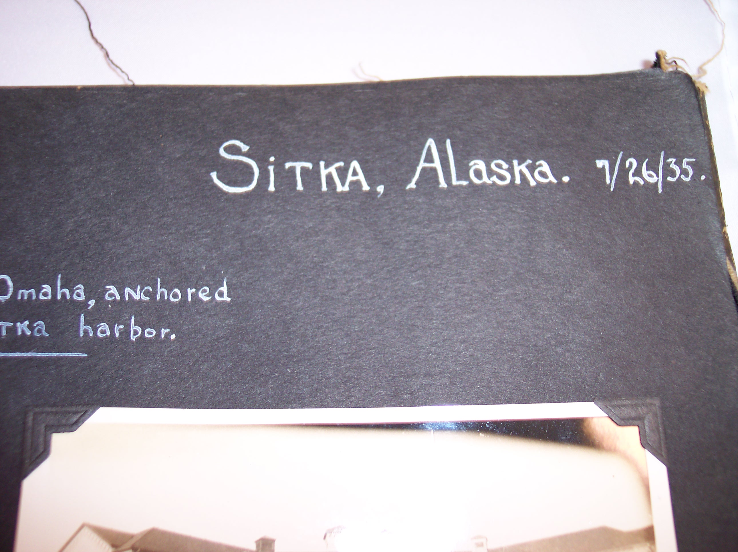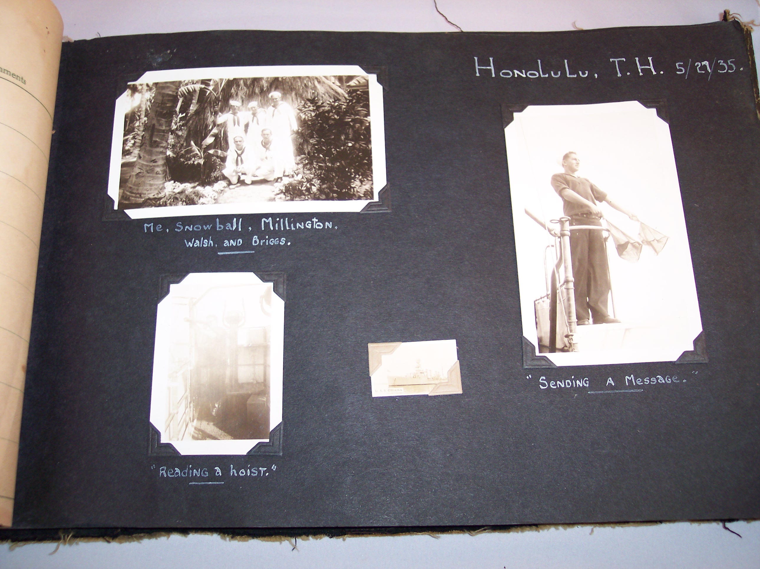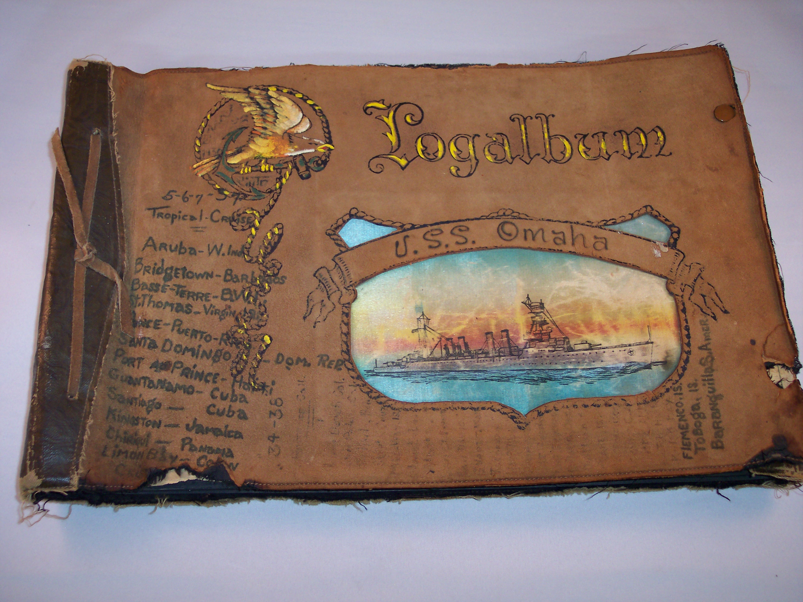 This is a "logalbum" from the USS Omaha from 1935-1937. It has numerous signatures and photos, assuming they were passengers on the ship and friends, etc. There are also pictures of different places- Alaska, South America, etc. There is even a dried flower glued to a page. The front of the books has wear issues and a hole in the leather (where the snap once was). It also has writing on it, assuming that the names are the ports they visited (Cuba, etc.). The pages are black paper.