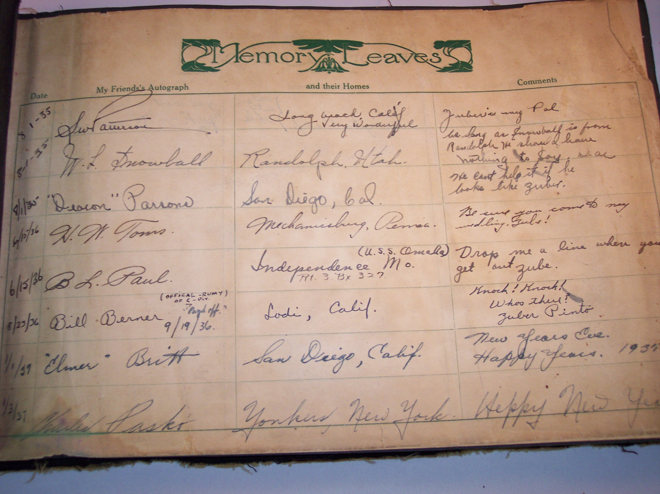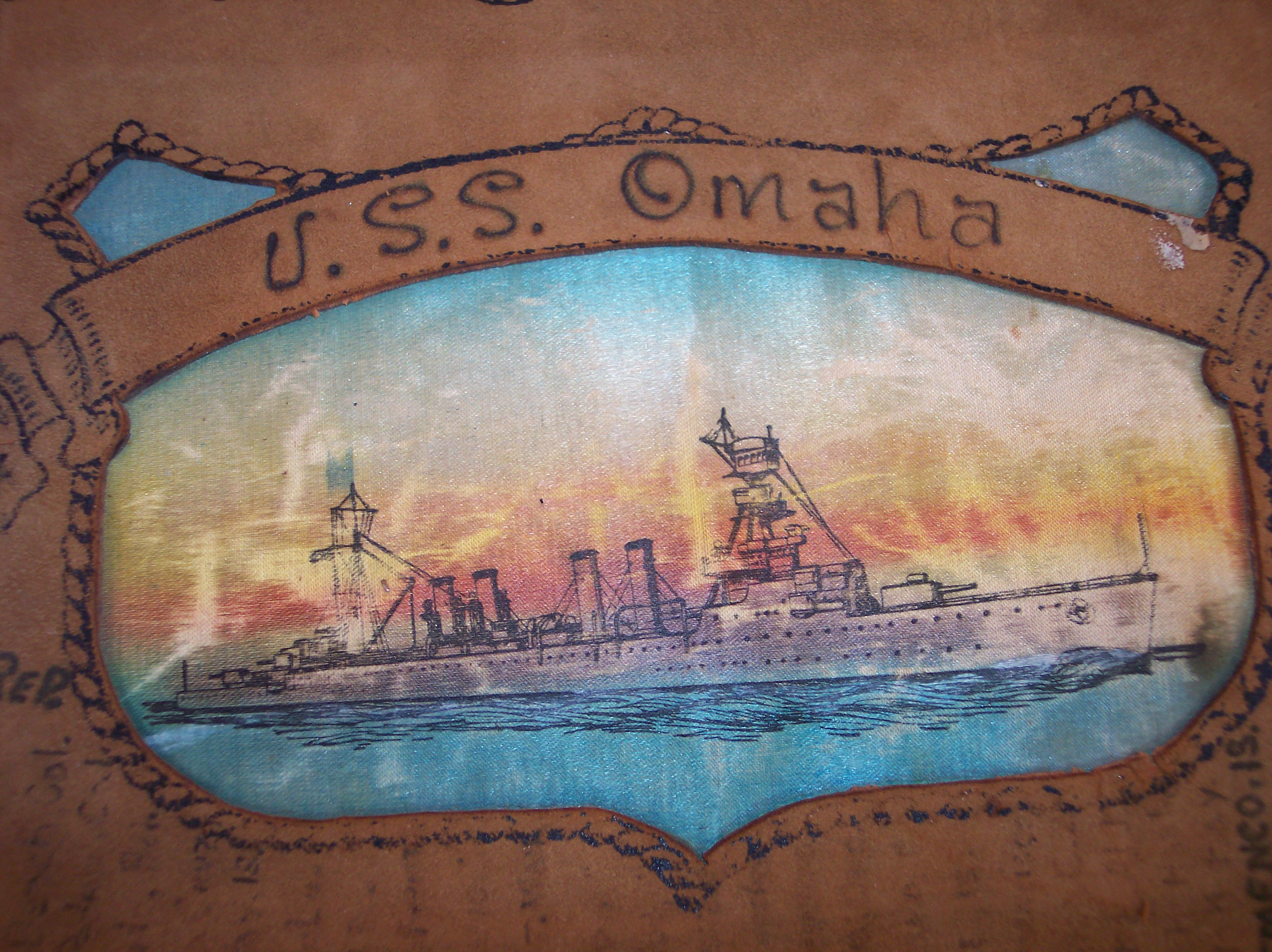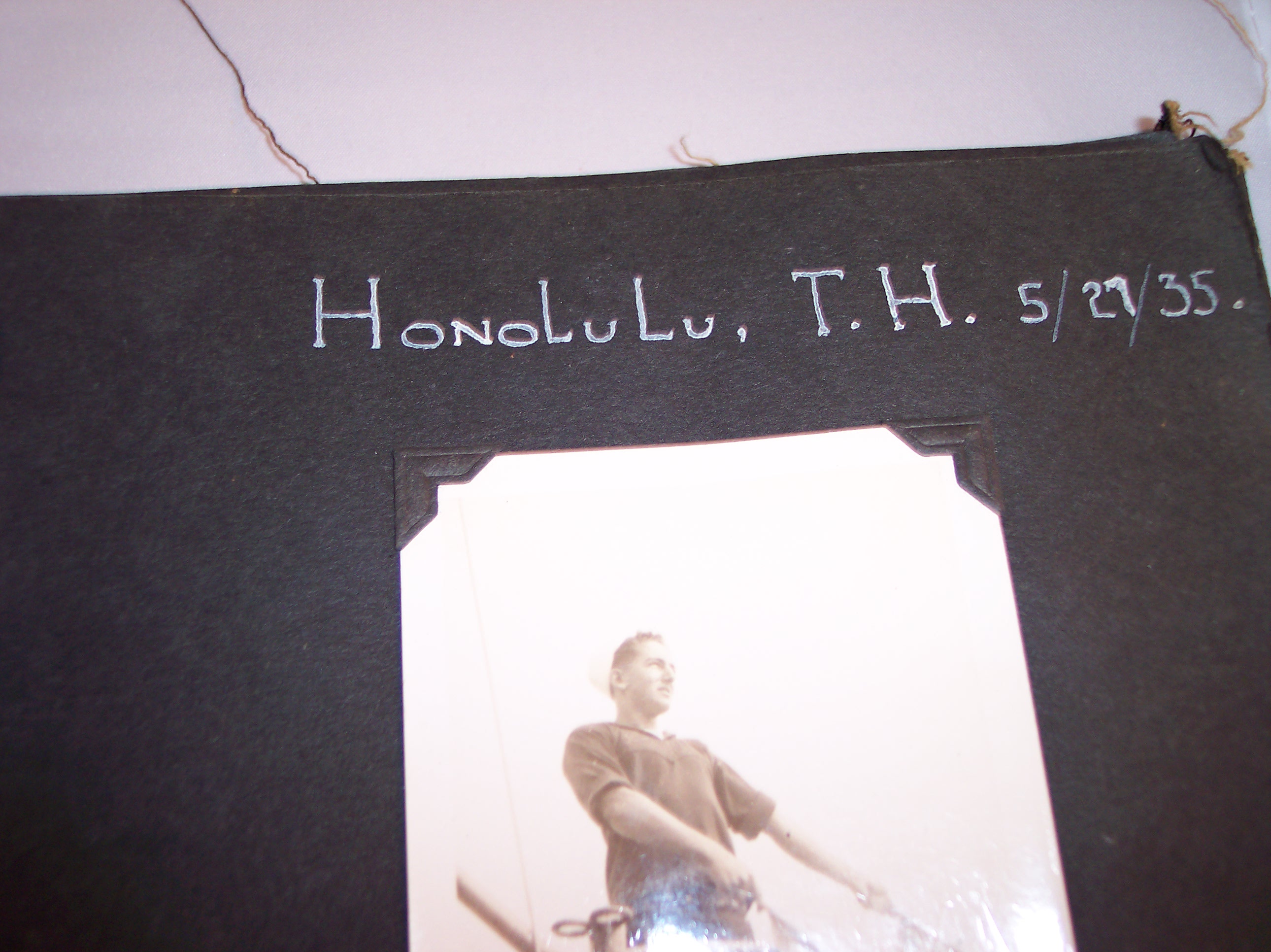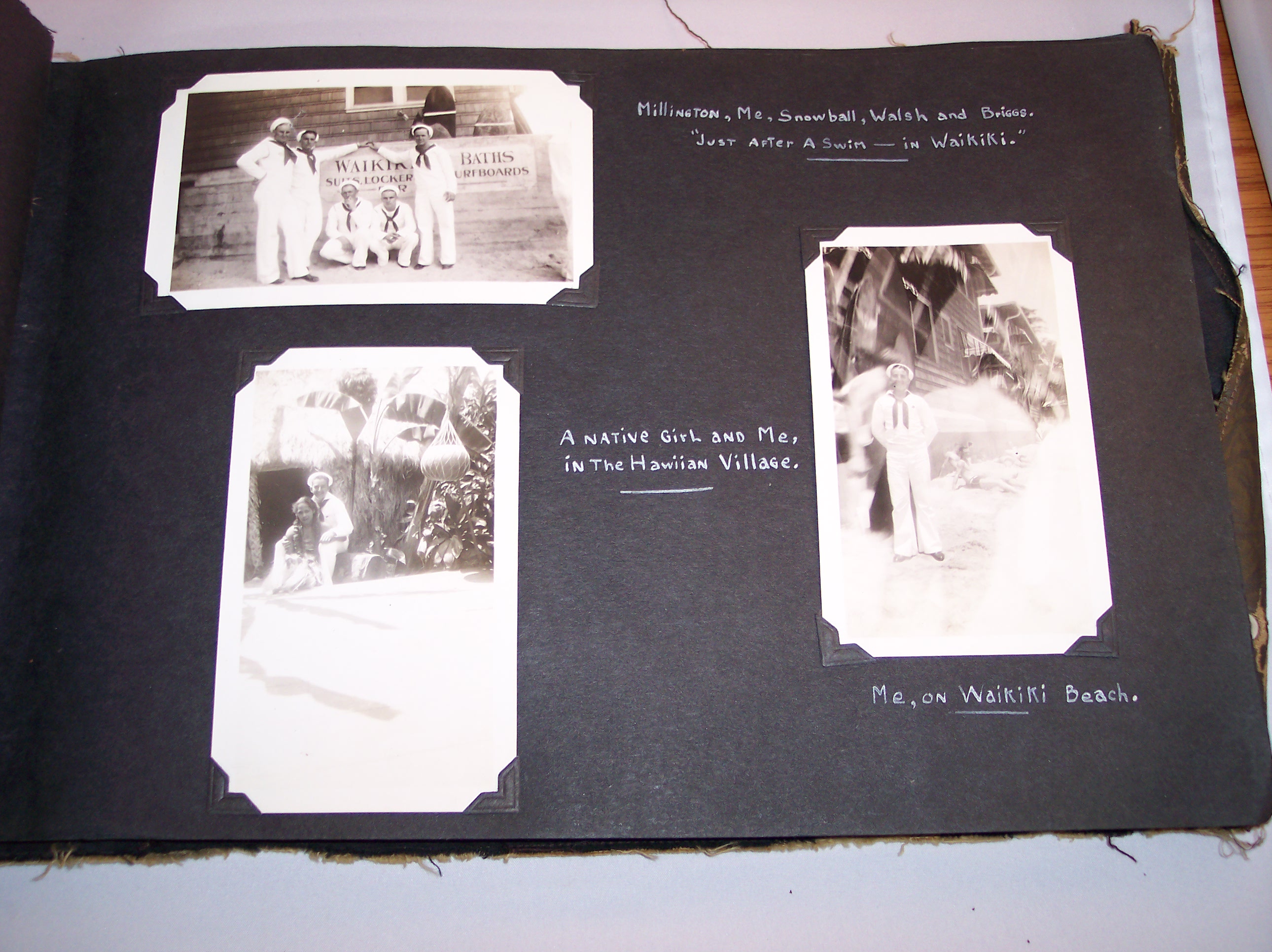 This is a "logalbum" from the USS Omaha from 1935-1937. It has numerous signatures and photos, assuming they were passengers on the ship and friends, etc. There are also pictures of different places- Alaska, South America, etc. There is even a dried flower glued to a page. The front of the books has wear issues and a hole in the leather (where the snap once was). It also has writing on it, assuming that the names are the ports they visited (Cuba, etc.). The pages are black paper.