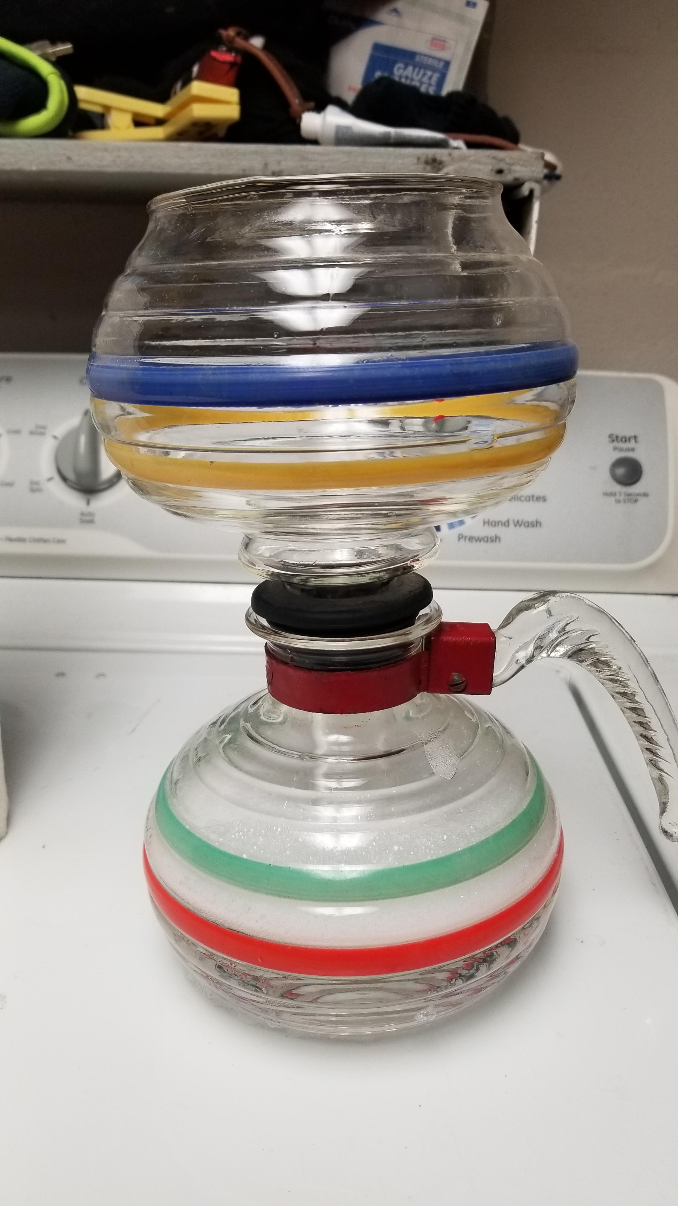 NO.1681 Striped Range-Tec Vacuum coffee maker. One of our best appearing highest quality coffee makers that brews delicious flavored coffee every time . Well made of sparkling crystal clear heat resisting glass in popular 5 to 8 cup size. Brightly decorated with red blue green and yellow stripes that provide a delightful artistic touch. Clear glass handle is fitted to lower decanter with brilliant red enameled metal band. Fitted with latest ribbed rubber vacuum seal and coffee mister filter. Fitted ribbed gas saver bottom.