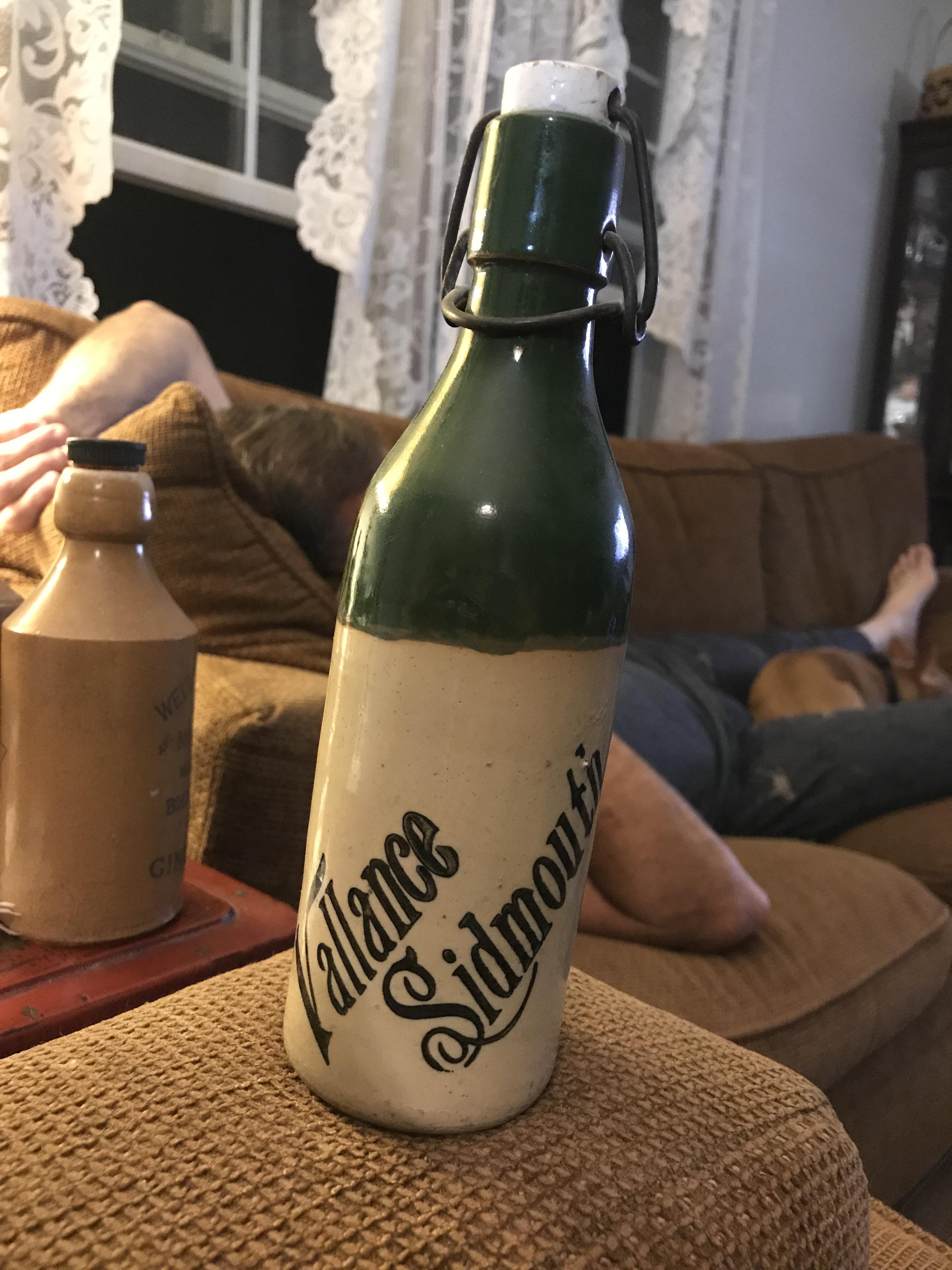 Vallance and Sidmouth ginger beer bottle. Green and white with white blob top with red writing