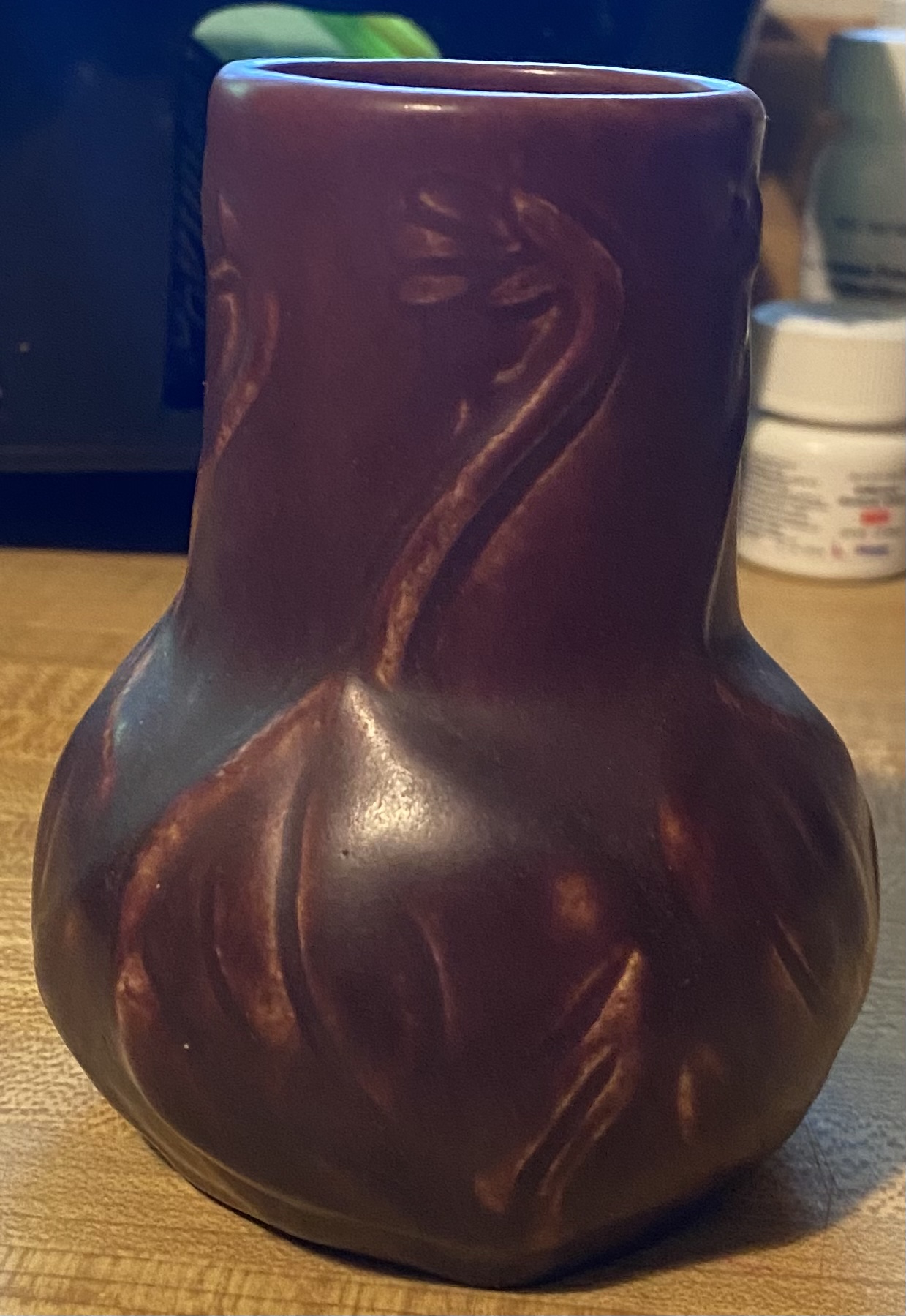 Small plum vase with the date 1918 and Van Briggle mark on the bottom underside