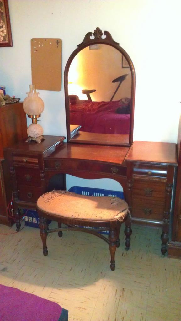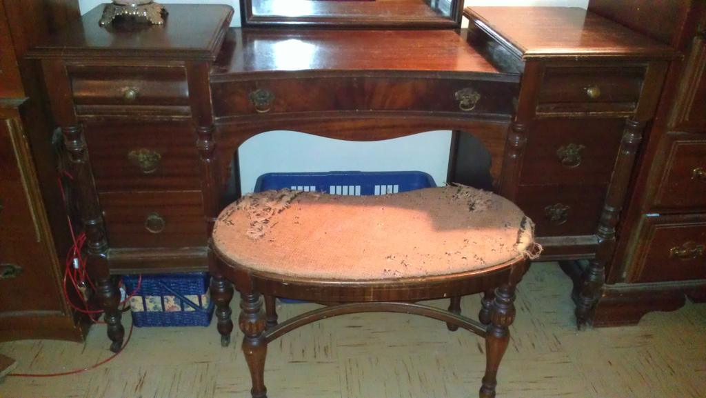 Was told this Vanity was over 100 years old. Everything is original on the Vanity ( the mirror, stool, etc... ). there are some scratches on the vanity, and the cover on the stool needs to be replaced, other than that, it is in pretty good condition. The only thing stamped on the vanity was: no 99 Mahogany Vanity/Dresser. would like to find out the approximate age and value (if any) of this item. Thank You