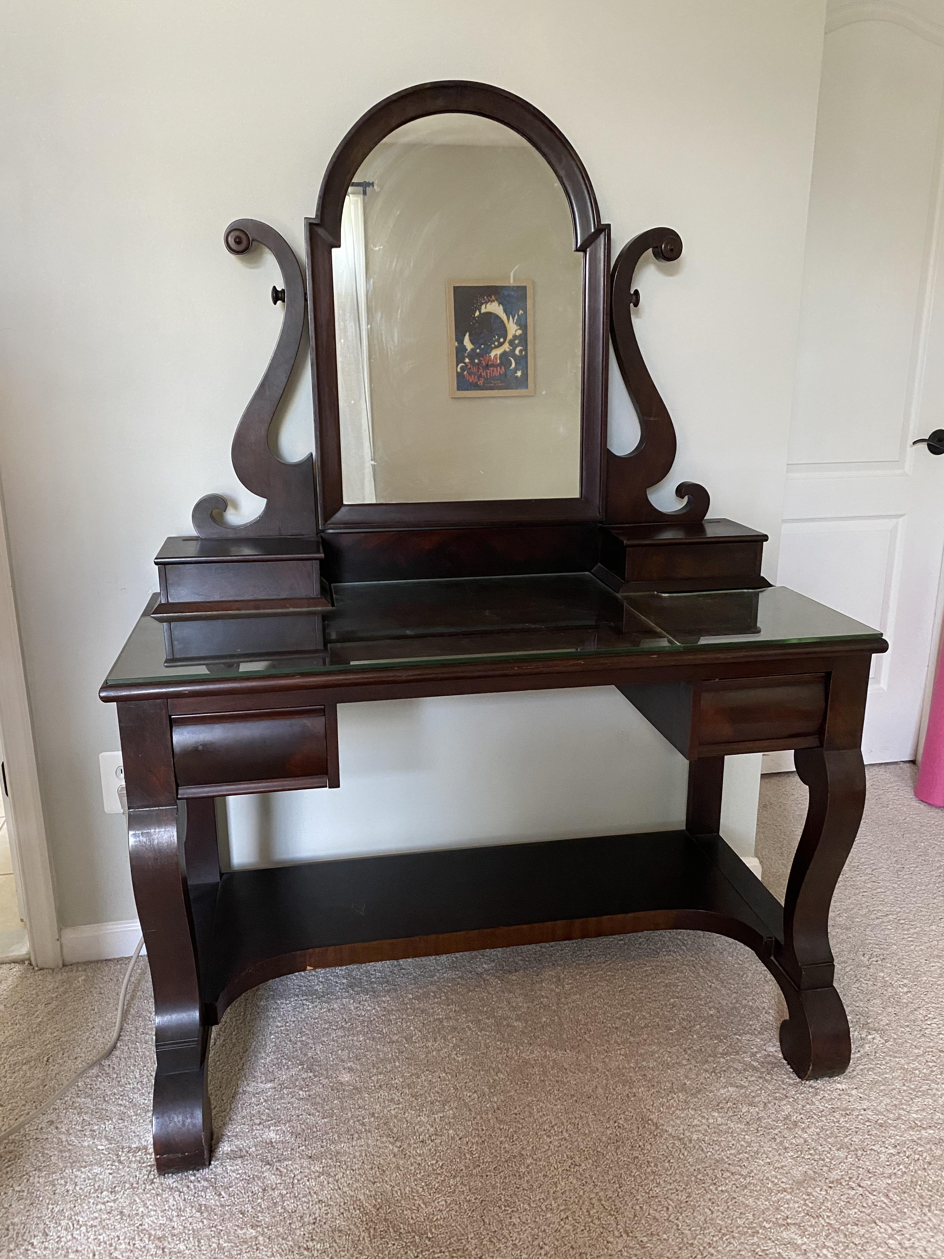 I’m trying to find out a little bit more about this piece I have. It’s part of a set, but after a move, it’s the only item left in good condition (movers broke a piece off the other, and scraped the wood of the sleigh bed).