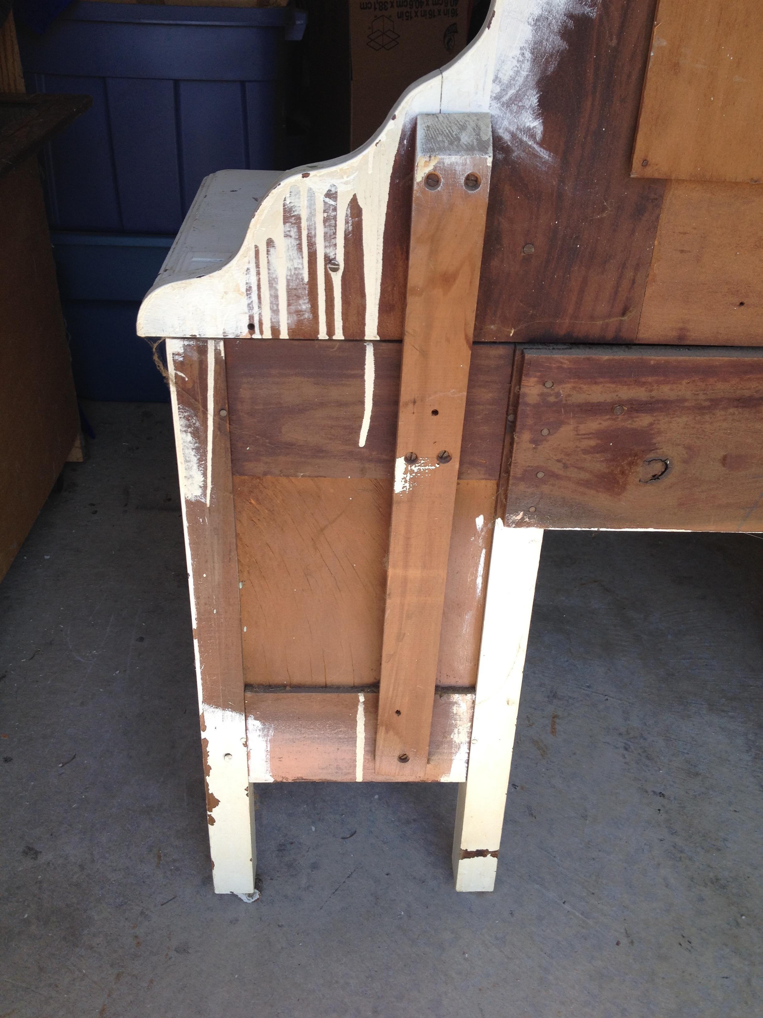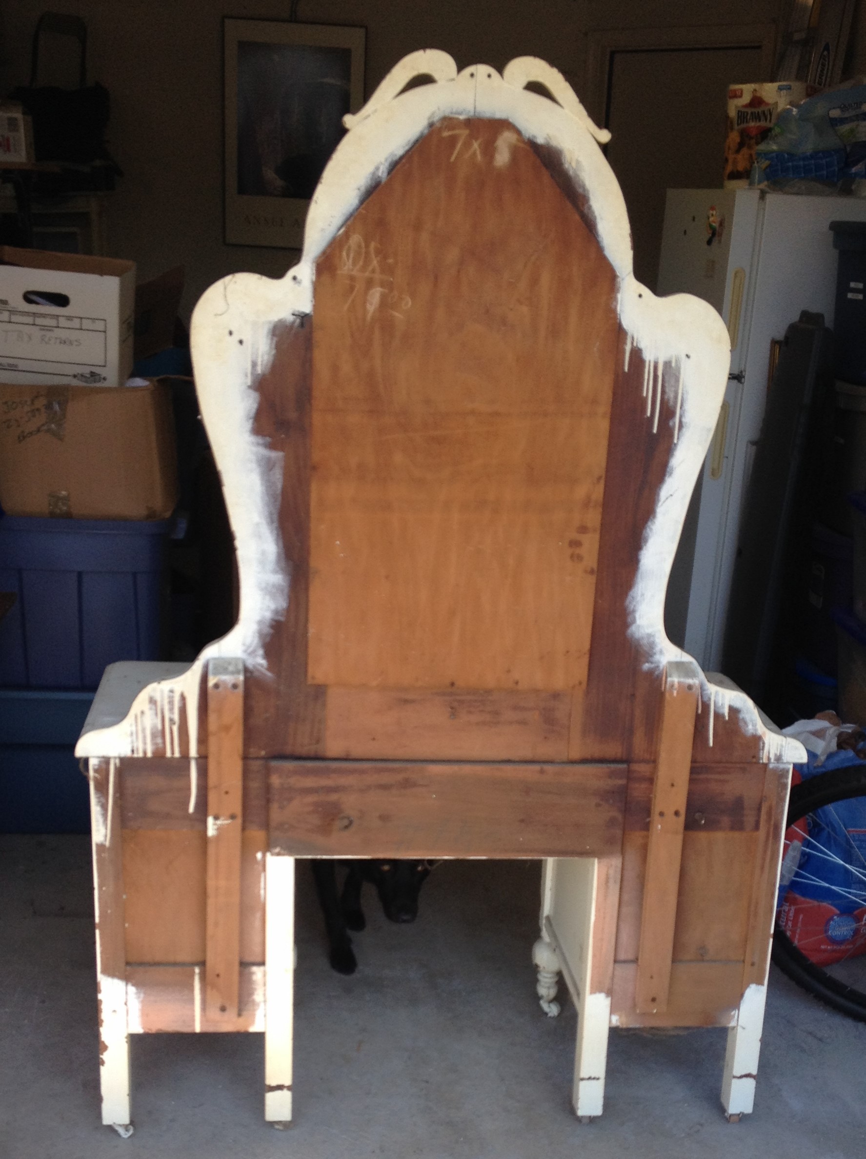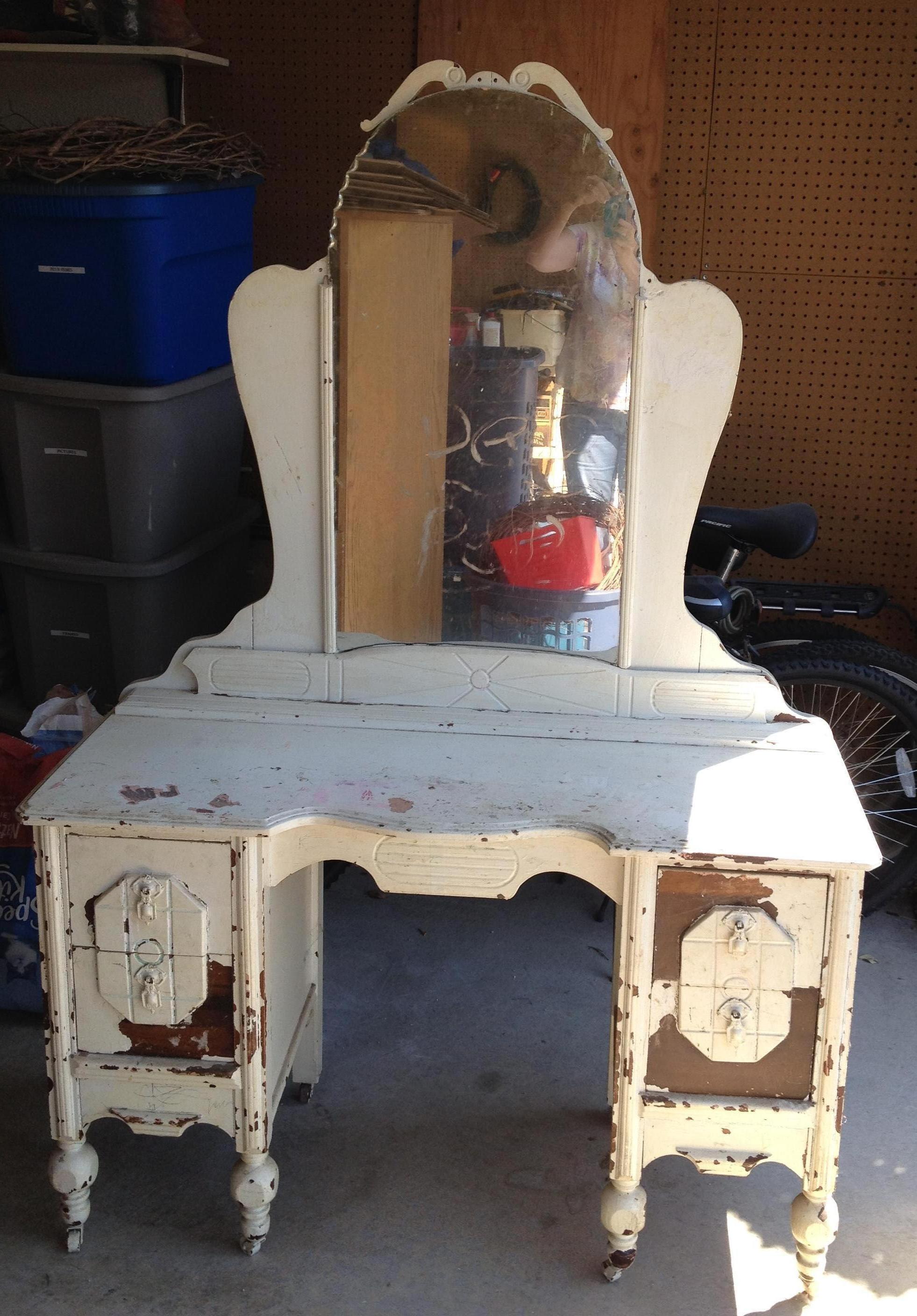 This is an antique wood vanity that has been painted. There is some damage but it appears to just be the paint peeling off. The mirror has some spots where the mirror coating is coming off, but in overall fair condition with no cracks. If it were stripped and refinished, I have no doubt it would a much finer looking piece. It belonged to my husband's grandmother, but was used by my daughter for a time. It has casters at the bottom. There are two drawers on each side. Although it looks like it could be only one drawer one each side because of the matching pieces that seem to connect on the front, they are actual two drawers, one on top of the other. I think this is a very nice decorative feature. The drawers are attached by joints and not by screws. As far as I know, the drawer pulls are original. I'm not sure of the age, era, or even the wood.
