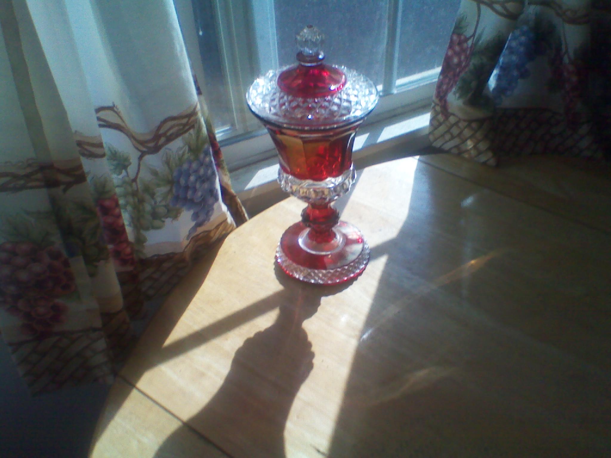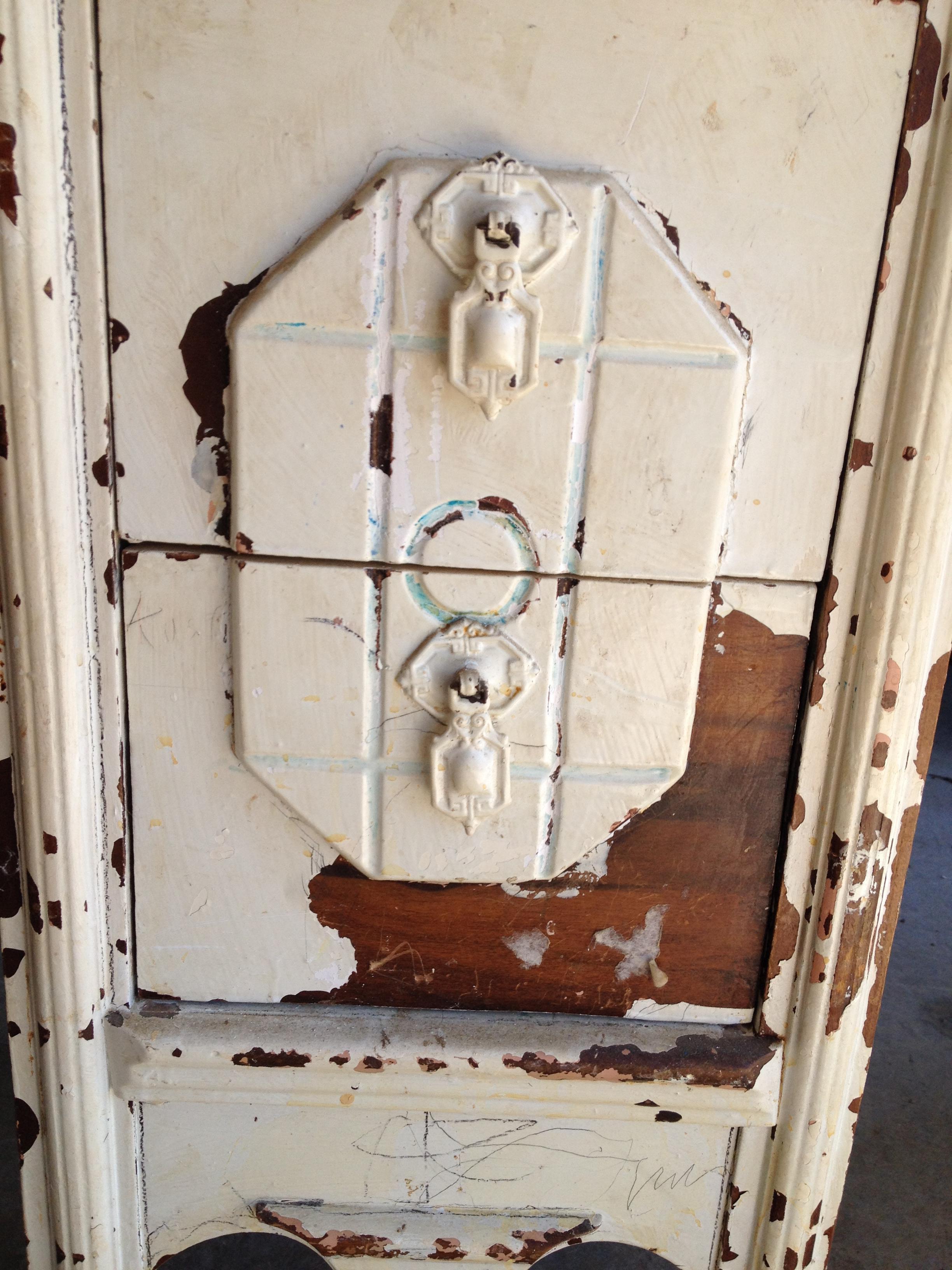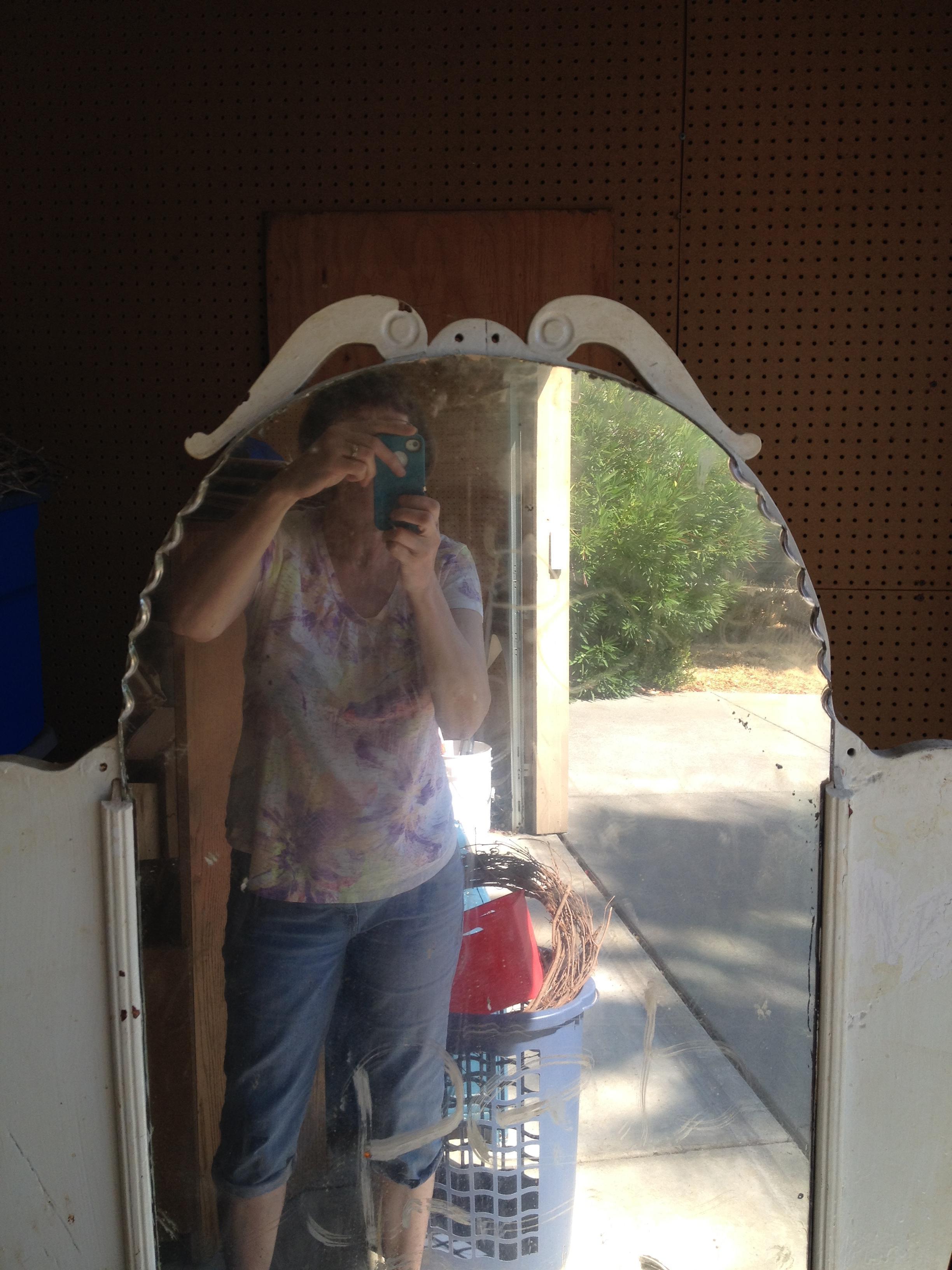 This is an antique wood vanity that has been painted. There is some damage but it appears to just be the paint peeling off. The mirror has some spots where the mirror coating is coming off, but in overall fair condition with no cracks. If it were stripped and refinished, I have no doubt it would a much finer looking piece. It belonged to my husband's grandmother, but was used by my daughter for a time. It has casters at the bottom. There are two drawers on each side. Although it looks like it could be only one drawer one each side because of the matching pieces that seem to connect on the front, they are actual two drawers, one on top of the other. I think this is a very nice decorative feature. The drawers are attached by joints and not by screws. As far as I know, the drawer pulls are original. I'm not sure of the age, era, or even the wood.