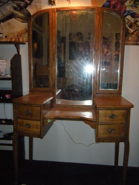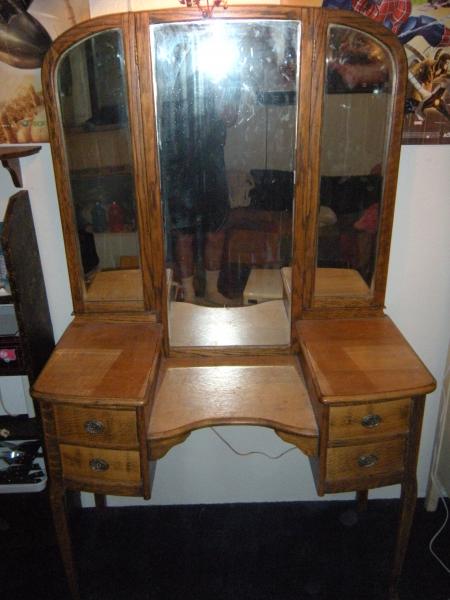 Vaniy has the original beveled mirrors, oak wood, 4 drawers with original handles, tri-fold mirrors, and is in very good condition. I would very much like to know the value of this piece. I may be interested in selling.