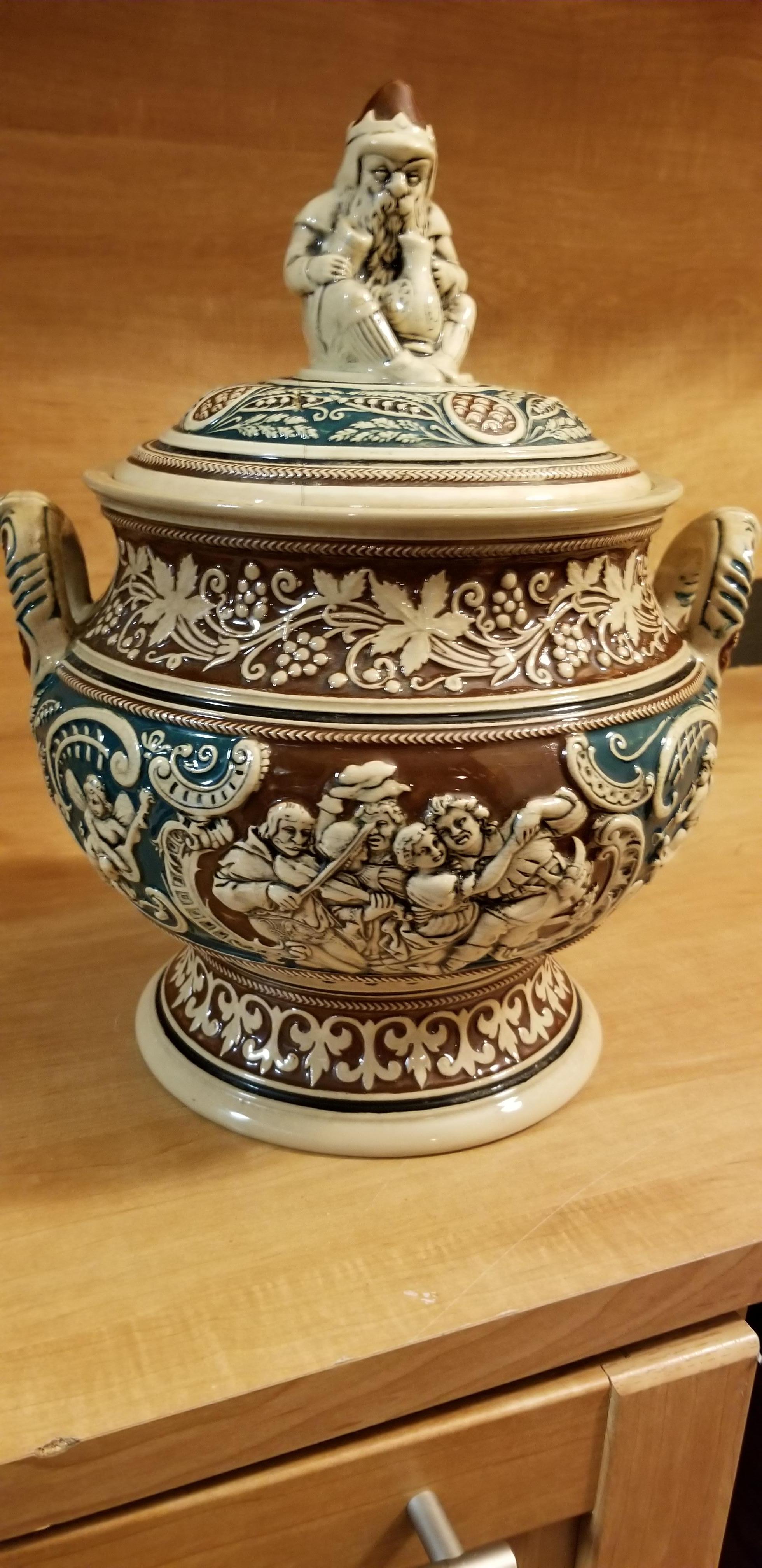 Seems like a old porcelain vase with small bearded man, and little Angel's playing music and dancing, only marking I see on bottom is 38 8